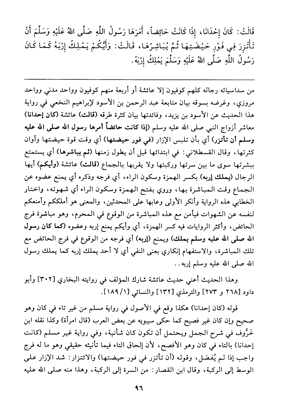 قَالتْ: كَانَ إِحْدَانَا، إِذَا كَانَتْ حَائِضًا، أَمَرَهَا رَسُولُ الله صلى اللهُ عَلَيهِ وَسلمَ أَنْ تَأْتَزِرَ في فَوْرِ حَيضَتِهَا ثُمَّ يُبَاشِرُهَا، قَالتْ: وَأَيُّكُمْ يَمْلِكُ إِرْبَهُ كَمَا كَانَ رَسُولُ الله صلى اللهُ عَلَيهِ وَسلمَ يَمْلِكُ إِرْبَهُ