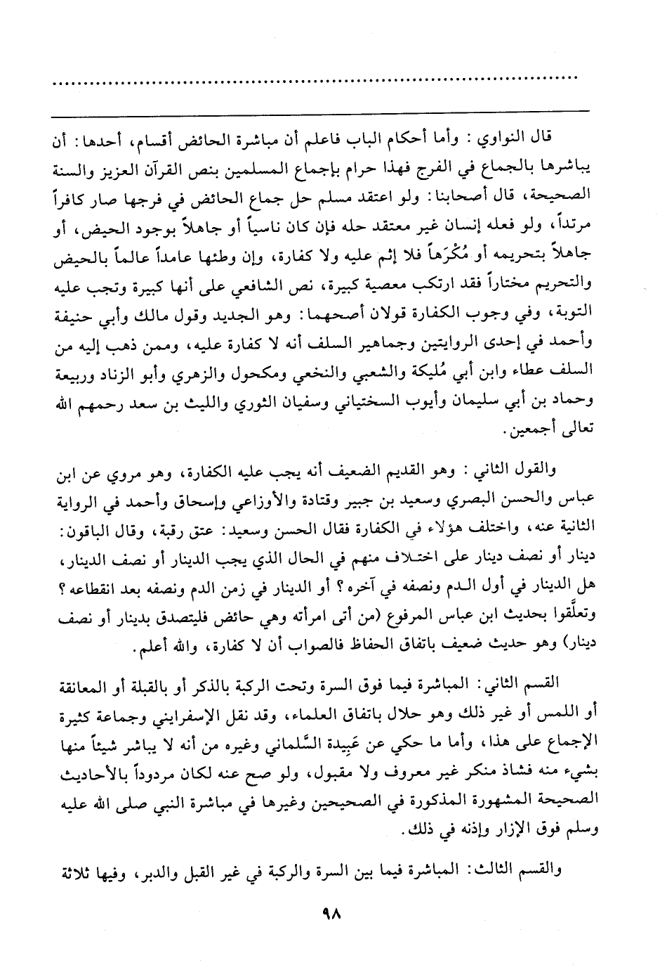 والقول الثاني؛ وهو القديم الضعيف أنه يجب عليه الكفارة، وهو مروي عن ابن عباس والحسن البصري وسعيد بن جبير وقتادة والأوزاعي وإسحاق وأحمد في الرواية الثانية عنه، واختلف هؤلاء في الكفارة فقال الحسن وسعيد: عتق رقبة، وقال الباقون: دينار أو نصف دينار على اختلاف منهم في الحال الذي يجب الدينار أو نصف الدينار، هل الدينار في أول الدم ونصفه في آخره؟ أو الدينار في زمن الدم ونصفه بعد انقطاعه؟ وتعلقوا بحديث ابن عباس المرفوع (من أتى امرأته وهي حائض فليتصدق بدينار أو نصف دينار) وهو حديث ضعيف باتفاق الحفاظ فالصواب أن لا كفارة، والله أعلم.