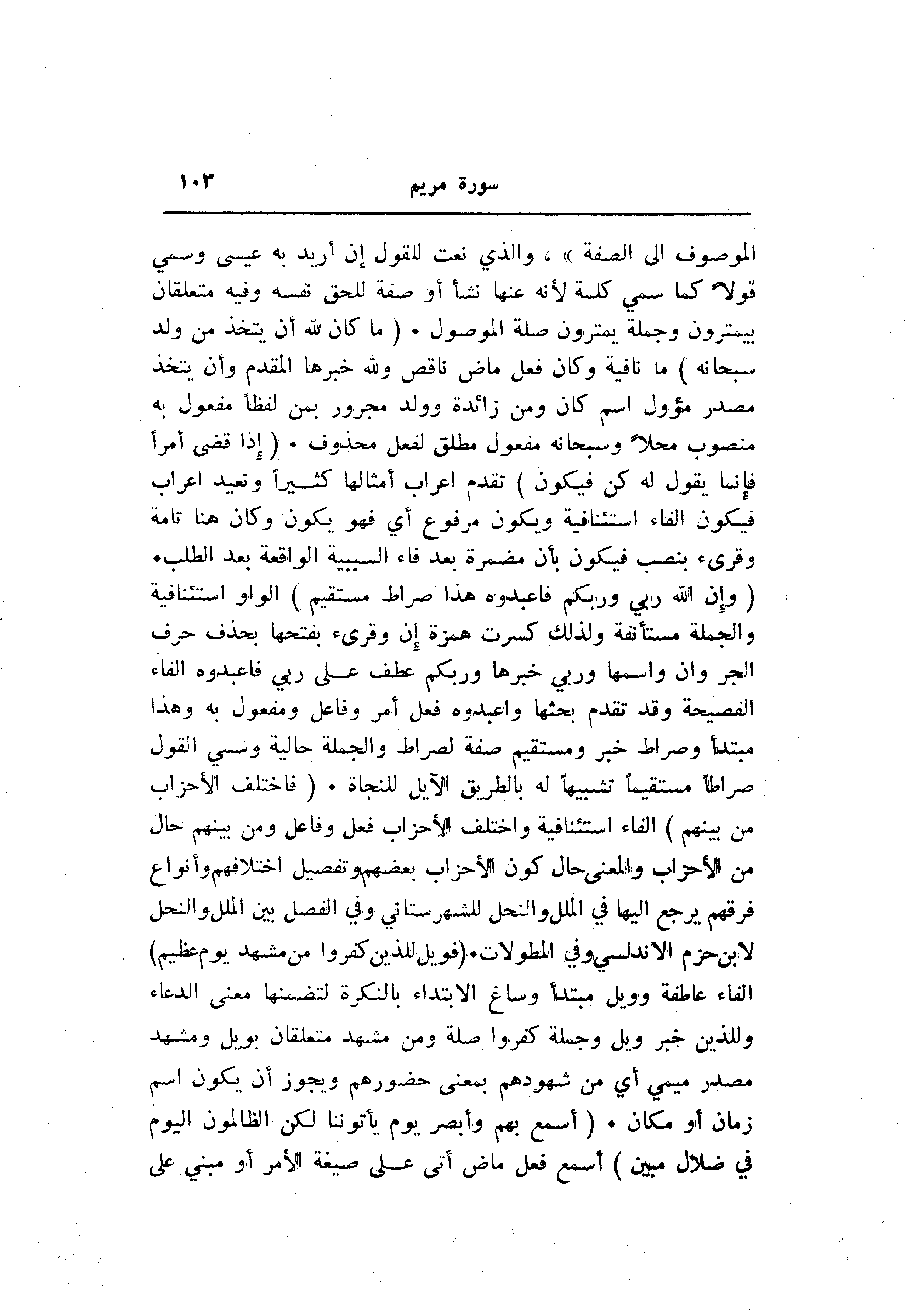 (وَإِنَّ اللَّهَ رَبِّي وَرَبُّكُمْ فَاعْبُدُوهُ هذا صِراطٌ مُسْتَقِيمٌ) الواو استئنافية والجملة مستأنفة ولذلك كسرت همزة إن وقرئ بفتحها بحذف حرف الجر وان واسمها وربي خبرها وربكم عطف على ربي فاعبدوه الفاء الفصيحة وقد تقدم بحثها واعبدوه فعل أمر وفاعل ومفعول به وهذا مبتدأ وصراط خبر ومستقيم صفة لصراط والجملة حالية وسمي القول صراطا مستقيما تشبيها له بالطريق الآيل للنجاة. (فَاخْتَلَفَ الْأَحْزابُ مِنْ بَيْنِهِمْ) الفاء استئنافية واختلف الأحزاب فعل وفاعل ومن بينهم حال من الأحزاب والمعنى حال كون الأحزاب بعضهم وتفصيل اختلافهم وأنواع فرقهم يرجع إليها في الملل والنحل للشهرستاني وفي الفصل بين الملل والنحل لابن حزم الاندلسي وفي المطولات. (فَوَيْلٌ لِلَّذِينَ كَفَرُوا مِنْ مَشْهَدِ يَوْمٍ عَظِيمٍ) الفاء عاطفة وويل مبتدأ وساغ الابتداء بالنكرة لتضمنها معنى الدعاء وللذين خبر ويل وجملة كفروا صلة ومن مشهد متعلقان بويل ومشهد مصدر ميمي أي من شهودهم بمعنى حضورهم ويجوز أن يكون اسم زمان أو مكان. (أَسْمِعْ بِهِمْ وَأَبْصِرْ يَوْمَ يَأْتُونَنا لكِنِ الظَّالِمُونَ الْيَوْمَ فِي ضَلالٍ مُبِينٍ) أسمع فعل ماض أتى على صيغة الأمر أو مبني على