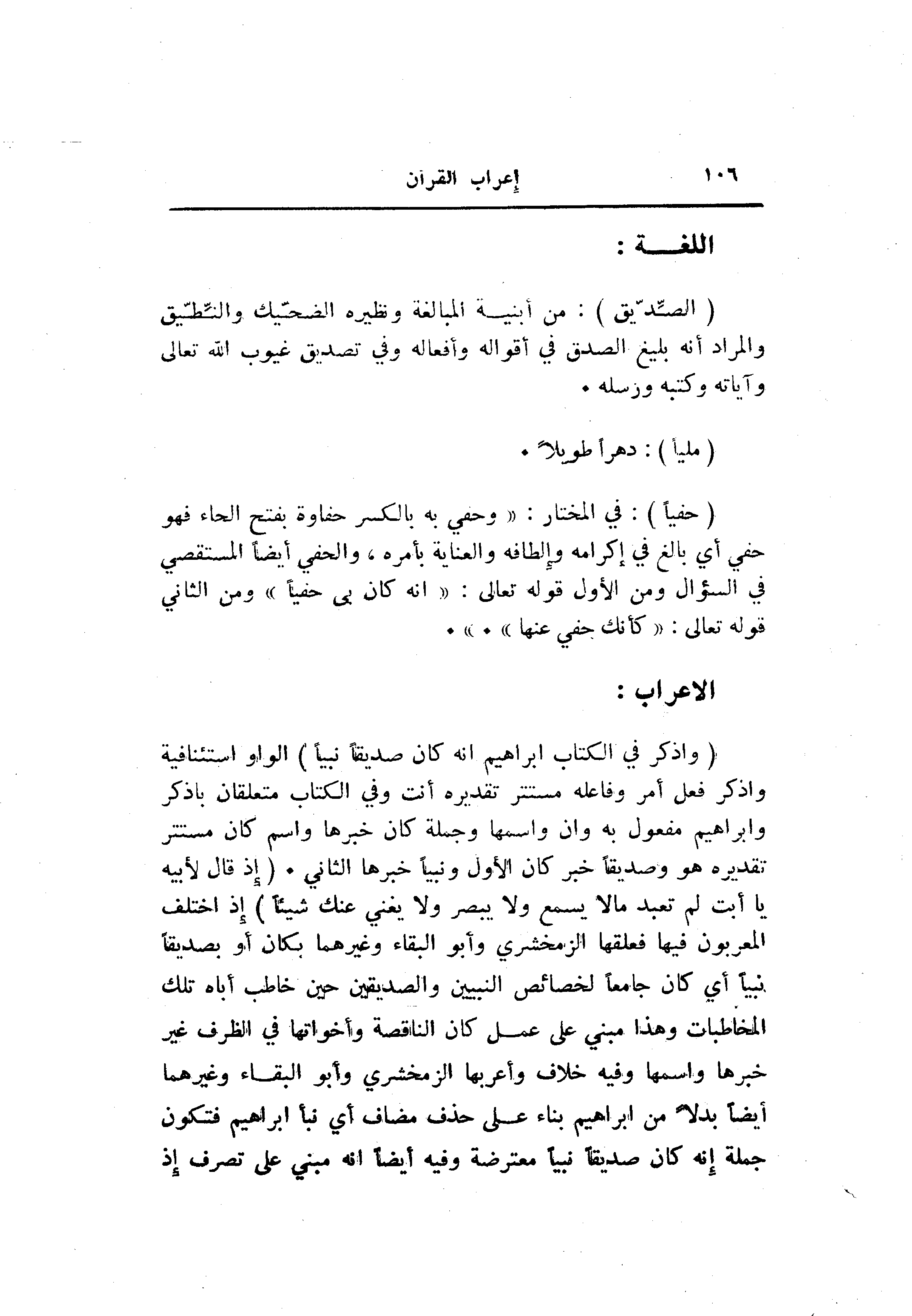 (وَاذْكُرْ فِي الْكِتابِ إِبْراهِيمَ إِنَّهُ كانَ صِدِّيقاً نَبِيًّا) الواو استئنافية واذكر فعل أمر وفاعله مستتر تقديره أنت وفي الكتاب متعلقان باذكر وابراهيم مفعول به وان واسمها وجملة كان خبرها واسم كان مستتر تقديره هو وصديقا خبر كان الأول ونبيا خبرها الثاني. (إِذْ قالَ لِأَبِيهِ يا أَبَتِ لِمَ تَعْبُدُ ما لا يَسْمَعُ وَلا يُبْصِرُ وَلا يُغْنِي عَنْكَ شَيْئاً)