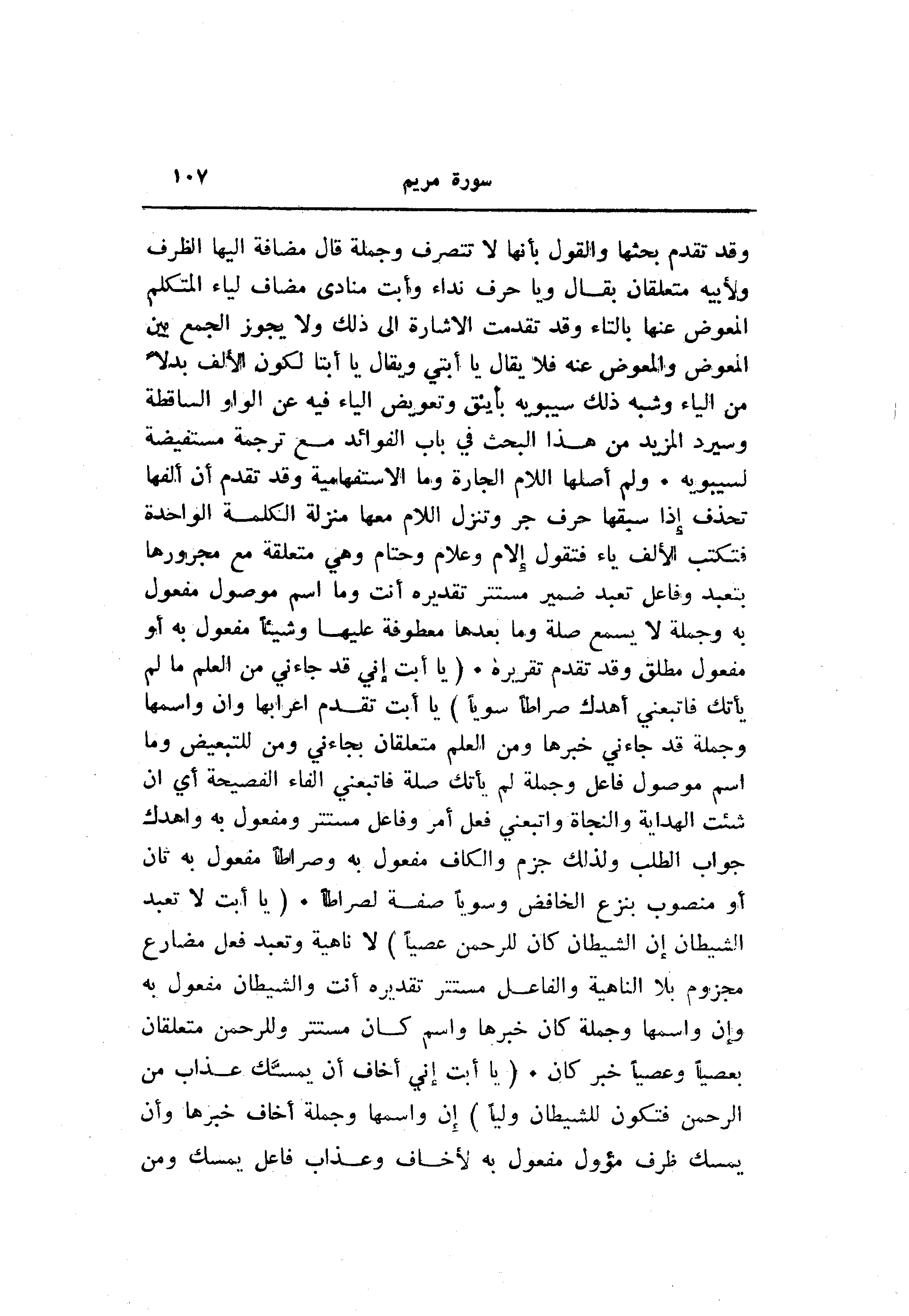 وقد تقدم بحثها والقول بأنها لا تتصرف وجملة قال مضافة إليها الظرف ولأبيه متعلقان بقال ويا حرف نداء وأبت منادى مضاف لياء المتكلم المعوض عنها بالتاء وقد تقدمت الاشارة الى ذلك ولا يجوز الجمع بين المعوض والمعوض عنه فلا يقال يا أبتي ويقال يا أبتا لكون الألف بدلا من الياء وشبه ذلك سيبويه بأينق وتعويض الياء فيه عن الواو الساقطة وسيرد المزيد من هذا البحث في باب الفوائد مع ترجمة مستفيضة لسيبويه. ولم أصلها اللام الجارة وما الاستفهامية وقد تقدم أن ألفها تحذف إذا سبقها حرف جر وتنزل اللام معها منزلة الكلمة الواحدة فتكتب الألف ياء فتقول إلام وعلام وحتام وهي متعلقة مع مجرورها بتعبد وفاعل تعبد ضمير مستتر تقديره أنت وما اسم موصول مفعول به وجملة لا يسمع صلة وما بعدها معطوفة عليها وشيئا مفعول به أو مفعول مطلق وقد تقدم تقريره. (يا أَبَتِ إِنِّي قَدْ جاءَنِي مِنَ الْعِلْمِ ما لَمْ يَأْتِكَ فَاتَّبِعْنِي أَهْدِكَ صِراطاً سَوِيًّا) يا أبت تقدم اعرابها وان واسمها وجملة قد جاءني خبرها ومن العلم متعلقان بجاءني ومن للتبعيض وما اسم موصول فاعل وجملة لم يأتك صلة فاتبعني الفاء الفصيحة أي ان شئت الهداية والنجاة واتبعني فعل أمر وفاعل مستتر ومفعول به واهدك جواب الطلب ولذلك جزم والكاف مفعول به وصراطا مفعول به ثان أو منصوب بنزع الخافض وسويا صفة لصراطا. (يا أَبَتِ لا تَعْبُدِ الشَّيْطانَ إِنَّ الشَّيْطانَ كانَ لِلرَّحْمنِ عَصِيًّا) لا ناهية وتعبد فعل مضارع مجزوم بلا الناهية والفاعل مستتر تقديره أنت والشيطان مفعول به وإن واسمها وجملة كان خبرها واسم كان مستتر وللرحمن متعلقان بعصيا وعصيا خبر كان. (يا أَبَتِ إِنِّي أَخافُ أَنْ يَمَسَّكَ عَذابٌ مِنَ الرَّحْمنِ فَتَكُونَ لِلشَّيْطانِ وَلِيًّا) إن واسمها وجملة أخاف خبرها وأن يمسك ظرف مؤول مفعول به لأخاف وعذاب فاعل يمسك ومن