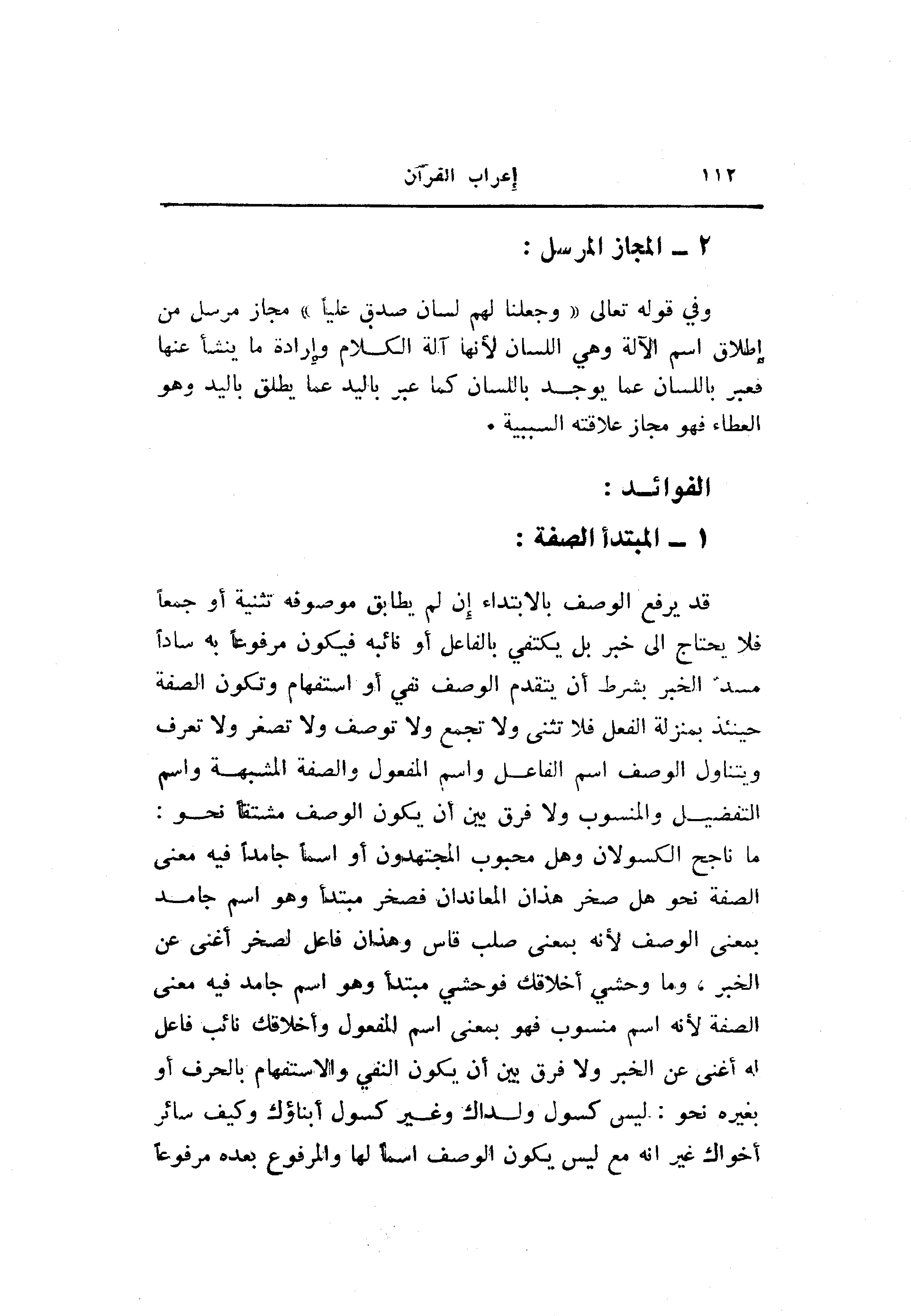 قد يرفع الوصف بالابتداء إن لم يطابق موصوفه تثنية أو جمعا فلا يحتاج الى خبر بل يكتفي بالفاعل أو نائبه فيكون مرفوعا به سادا مسدّ الخبر بشرط أن يتقدم الوصف نفي أو استفهام وتكون الصفة حينئذ بمنزلة الفعل فلا تثنى ولا تجمع ولا توصف ولا تصغر ولا تعرف ويتناول الوصف اسم الفاعل واسم المفعول والصفة المشبهة واسم التفضيل والمنسوب ولا فرق بين أن يكون الوصف مشتقا نحو: