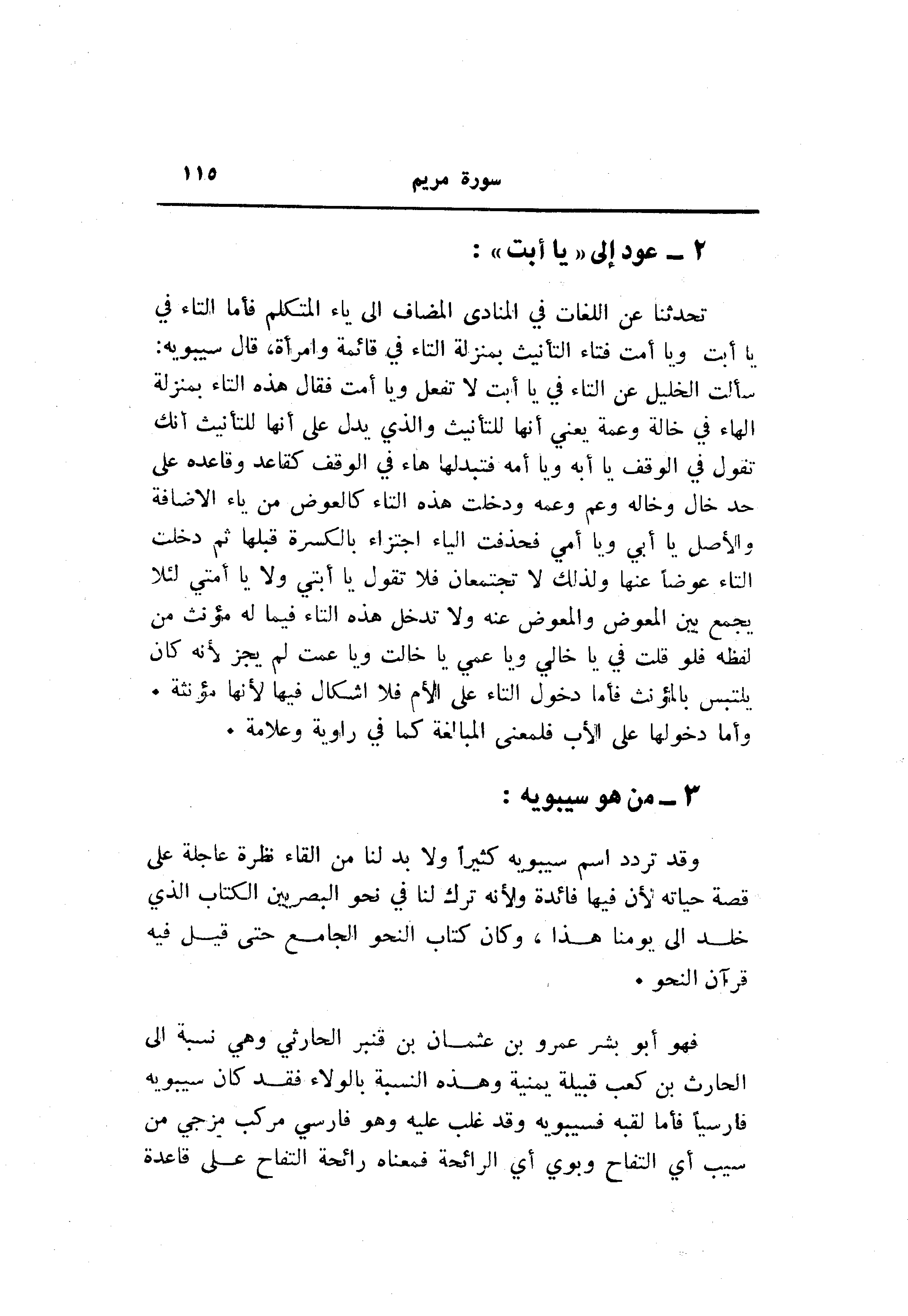 وقد تردد اسم سيبويه كثيرا ولا بد لنا من إلقاء نظرة عاجلة على قصة حياته لأن فيها فائدة ولأنه ترك لنا في نحو البصريين الكتاب الذي خلد الى يومنا هذا، وكان كتاب النحو الجامع حتى قيل فيه قرآن النحو.