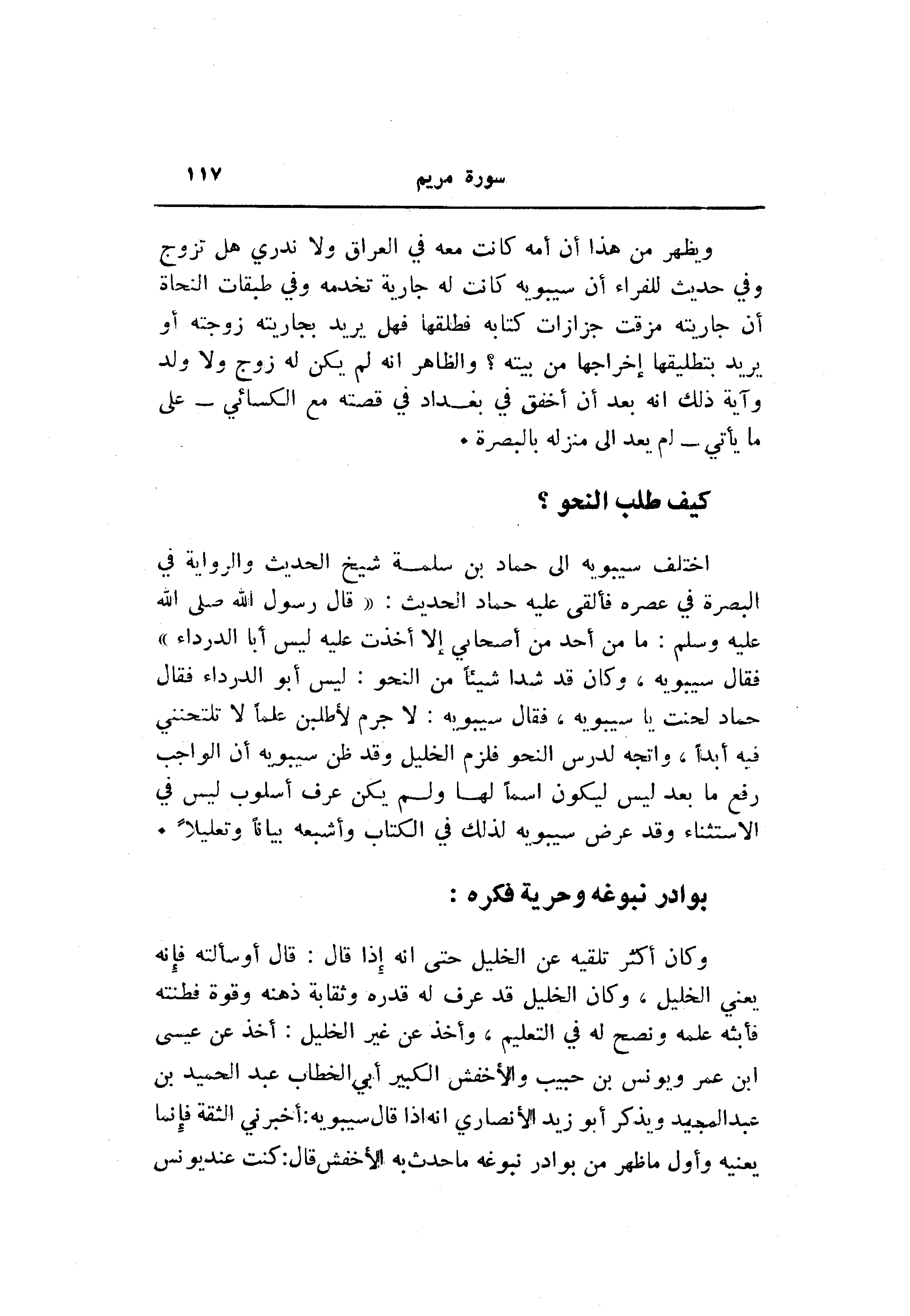 ويظهر من هذا أن أمه كانت معه في العراق ولا ندري هل تزوج وفي حديث للفراء أن سيبويه كانت له جارية تخدمه وفي طبقات النحاة أن جاريته مزقت جزازات كتابه فطلقها فهل يريد بجاريته زوجته أو يريد بتطليقها إخراجها من بيته؟ والظاهر انه لم يكن له زوج ولا ولد وآية ذلك انه بعد أن أخفق في بغداد في قصته مع الكسائي- على ما يأتي- أم يعد الى منزله بالبصرة.