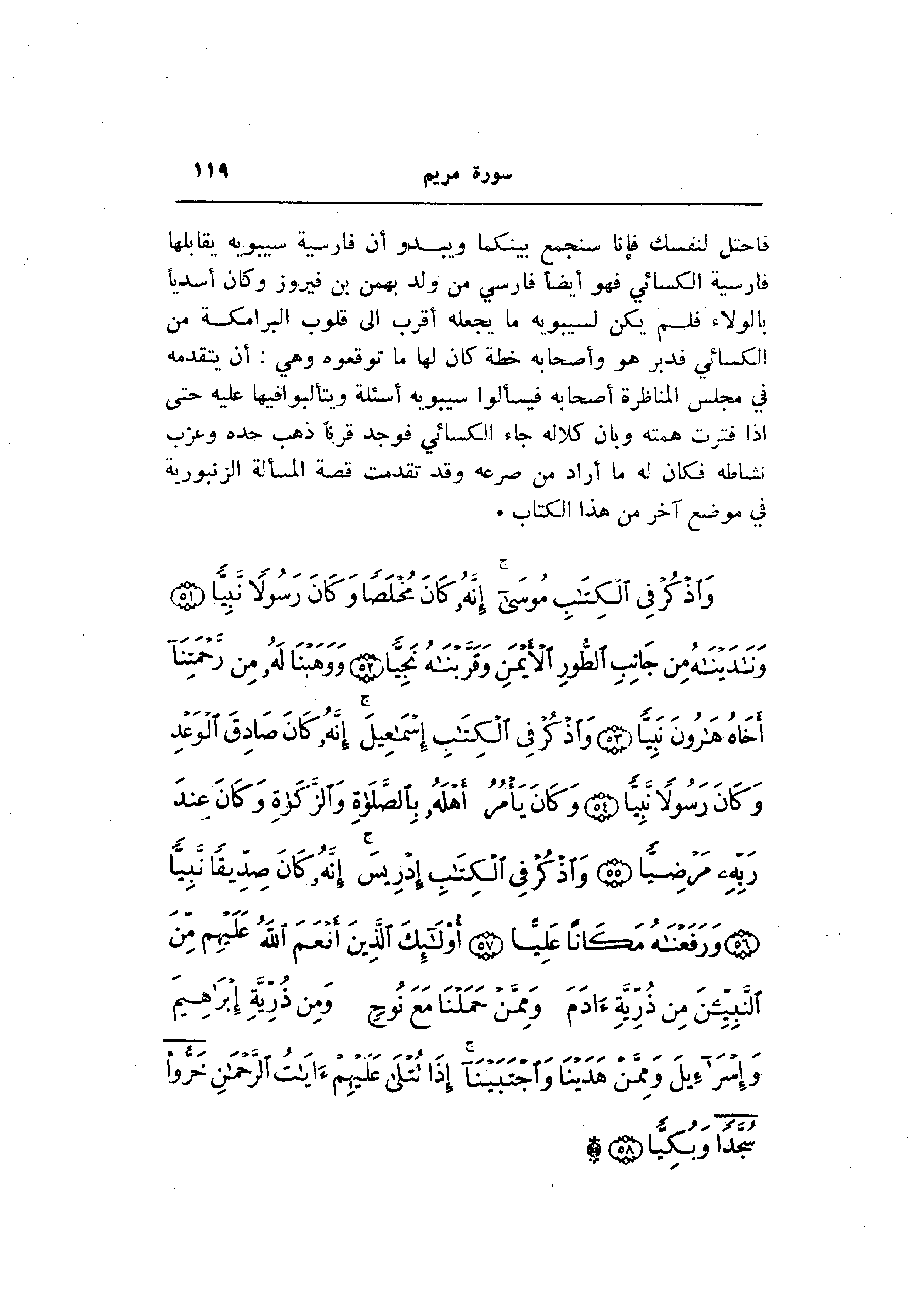 فاحتل لنفسك فإنا سنجمع بينكما ويبدو أن فارسية سيبويه يقابلها فارسية الكسائي فهو أيضا فارسي من ولد بهمن بن فيروز وكان أسديا بالولاء فلم يكن لسيبويه ما يجعله أقرب الى قلوب البرامكة من الكسائي فدبر هو وأصحابه خطة كان لها ما توقعوه وهي: أن يتقدمه في مجلس المناظرة أصحابه فيسألوا سيبويه أسئلة ويتألبوا فيها عليه حتى إذا فترت همته وبان كلاله جاء الكسائي فوجد قرنا ذهب حده وعزب نشاطه فكان له ما أراد من صرعه وقد تقدمت قصة المسألة الزنبورية في موضع آخر من هذا الكتاب.