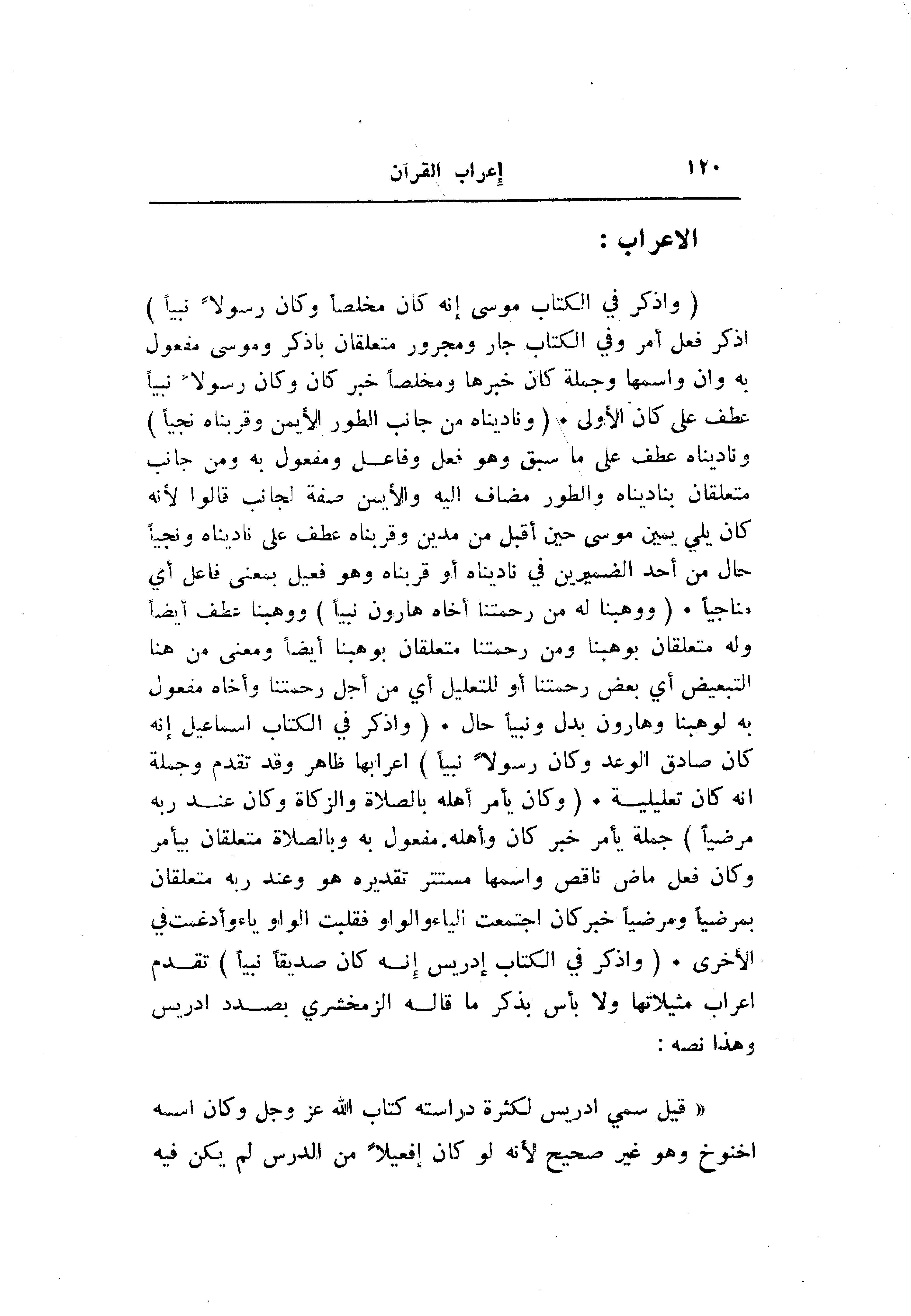(وَاذْكُرْ فِي الْكِتابِ مُوسى إِنَّهُ كانَ مُخْلَصاً وَكانَ رَسُولًا نَبِيًّا) اذكر فعل أمر وفي الكتاب جار ومجرور متعلقان باذكر وموسى مفعول به وان واسمها وجملة كان خبرها ومخلصا خبر كان وكان رسولا نبيا عطف على كان الأولى. (وَنادَيْناهُ مِنْ جانِبِ الطُّورِ الْأَيْمَنِ وَقَرَّبْناهُ نَجِيًّا) وناديناه عطف على ما سبق وهو فعل وفاعل ومفعول به ومن جانب متعلقان بناديناه والطور مضاف اليه والأيمن صفة لجانب قالوا لأنه كان يلي يمين موسى حين أقبل من مدين وقربناه عطف على ناديناه ونجيا حال من أحد الضميرين في ناديناه أو قربناه وهو فعيل بمعنى فاعل أي مناجيا. (وَوَهَبْنا لَهُ مِنْ رَحْمَتِنا أَخاهُ هارُونَ نَبِيًّا) ووهبنا عطف أيضا وله متعلقان بوهبنا ومن رحمتنا متعلقان بوهبنا أيضا ومعنى من هنا التبعيض أي بعض رحمتنا أو للتعليل أي من أجل رحمتنا وأخاه مفعول به لوهبنا وهارون بدل ونبيا حال. (وَاذْكُرْ فِي الْكِتابِ إِسْماعِيلَ إِنَّهُ كانَ صادِقَ الْوَعْدِ وَكانَ رَسُولًا نَبِيًّا) اعرابها ظاهر وقد تقدم وجملة انه كان تعليلية. (وَكانَ يَأْمُرُ أَهْلَهُ بِالصَّلاةِ وَالزَّكاةِ وَكانَ عِنْدَ رَبِّهِ مَرْضِيًّا) جملة يأمر خبر كان وأهله مفعول به وبالصلاة متعلقان بيأمر وكان فعل ماض ناقص واسمها مستتر تقديره هو وعند ربه متعلقان بمرضيا ومرضيا خبر كان اجتمعت الياء والواو فقلبت الواو ياء وأدغمت في الأخرى. (وَاذْكُرْ فِي الْكِتابِ إِدْرِيسَ إِنَّهُ كانَ صِدِّيقاً نَبِيًّا) تقدم اعراب مثيلاتها ولا بأس بذكر ما قاله الزمخشري بصدد إدريس وهذا نصه: