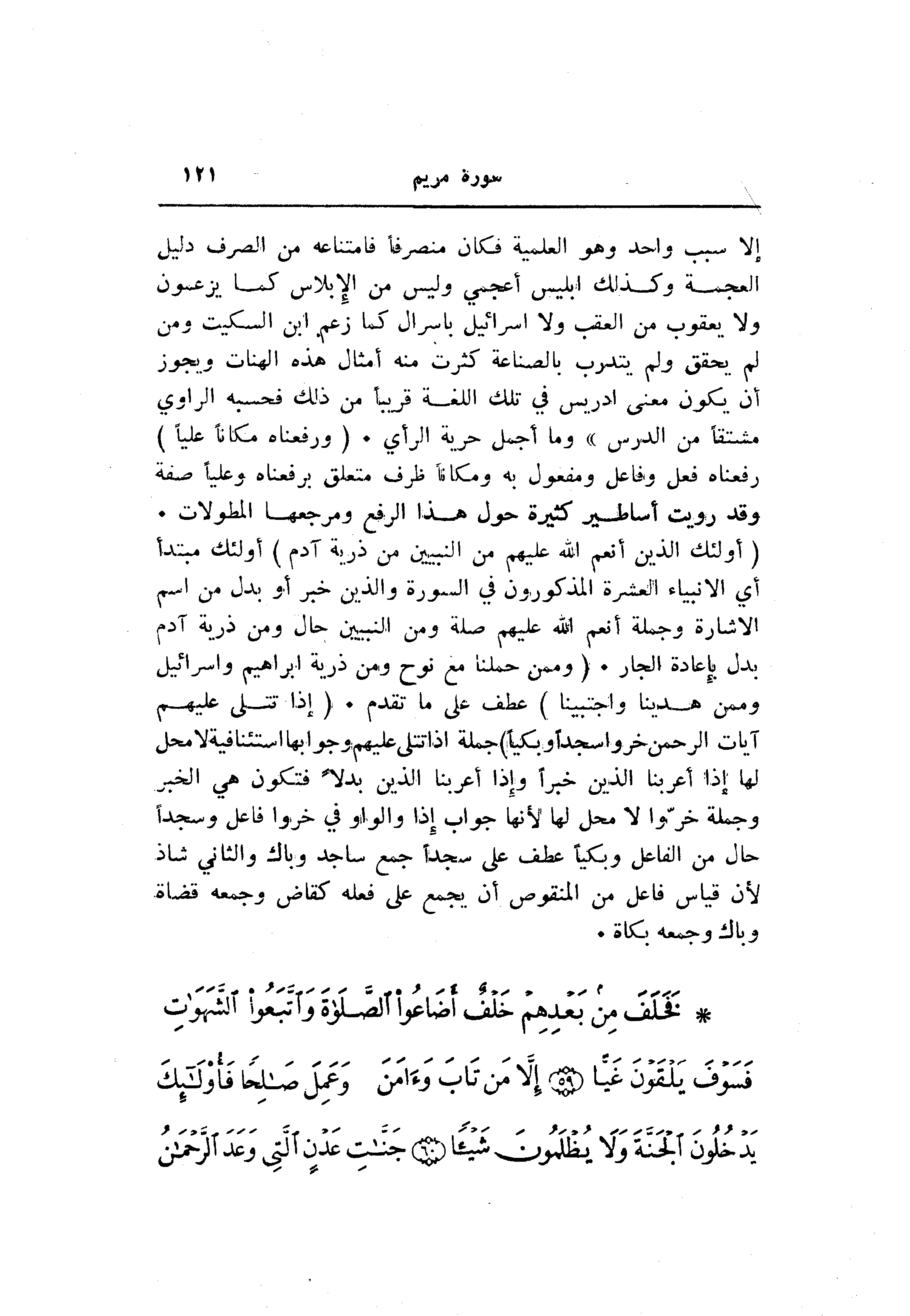 (أُولئِكَ الَّذِينَ أَنْعَمَ اللَّهُ عَلَيْهِمْ مِنَ النَّبِيِّينَ مِنْ ذُرِّيَّةِ آدَمَ) أولئك مبتدأ أي الأنبياء العشرة المذكورون في السورة والذين خبر أو بدل من اسم الاشارة وجملة أنعم الله عليهم صلة ومن النبيين حال ومن ذرية آدم بدل بإعادة الجار. (وَمِمَّنْ حَمَلْنا مَعَ نُوحٍ وَمِنْ ذُرِّيَّةِ إِبْراهِيمَ وَإِسْرائِيلَ وَمِمَّنْ هَدَيْنا وَاجْتَبَيْنا) عطف على ما تقدم. (إِذا تُتْلى عَلَيْهِمْ آياتُ الرَّحْمنِ خَرُّوا سُجَّداً وَبُكِيًّا) جملة إذا تتلى عليهم وجوابها استئنافية لا محل لها إذا أعربنا الذين خبرا وإذا أعربنا الذين بدلا فتكون هي الخبر وجملة خرّوا لا محل لها لأنها جواب إذا والواو في خروا فاعل وسجدا حال من الفاعل وبكيا عطف على سجدا جمع ساجد وباك والثاني شاذ لأن قياس فاعل من المنقوص أن يجمع على فعله كقاض وجمعه قضاة وباك وجمعه بكاة.