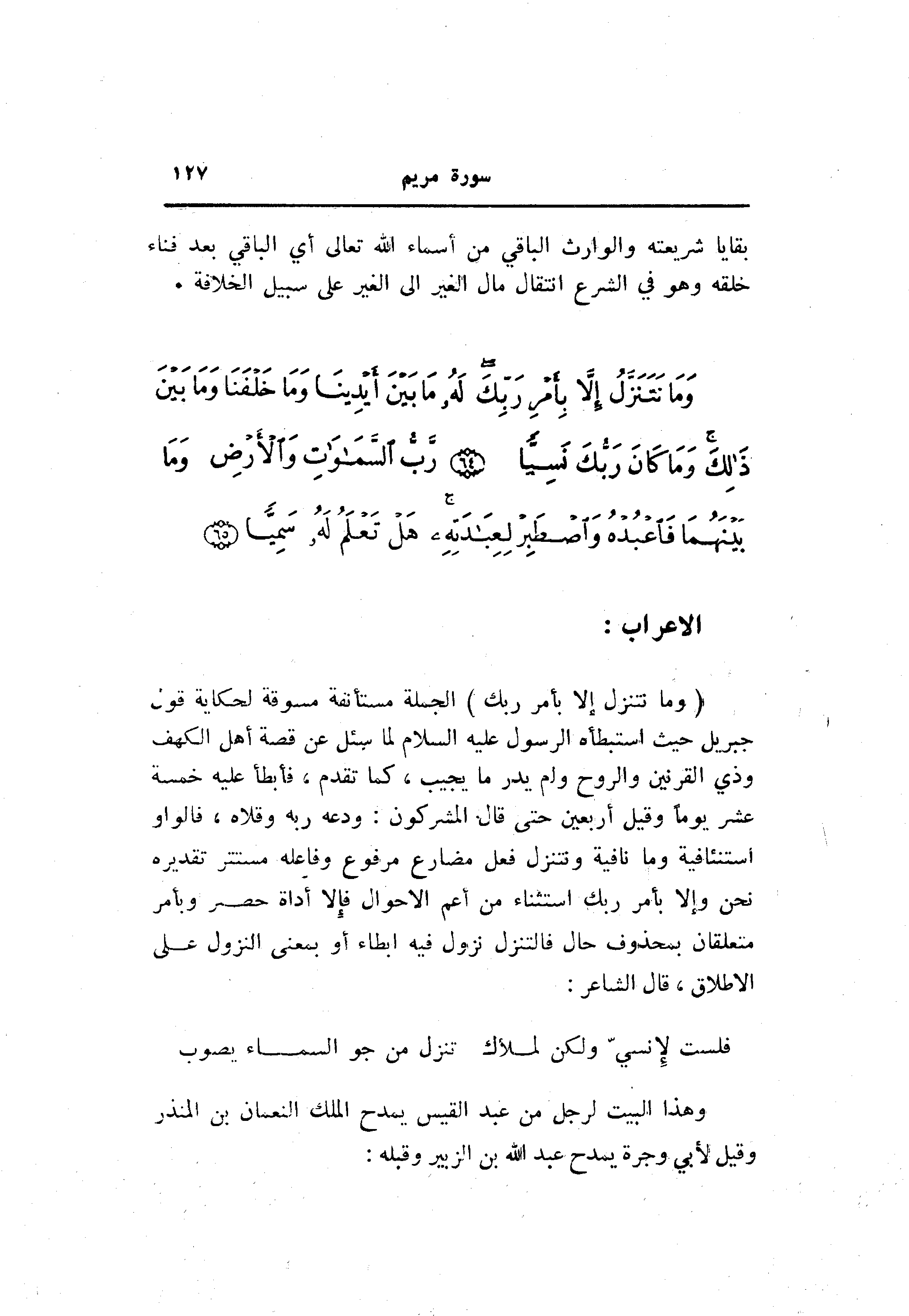 (وَما نَتَنَزَّلُ إِلَّا بِأَمْرِ رَبِّكَ) الجملة مستأنفة مسوقة لحكاية قول جبريل حيث استبطأه الرسول عليه السلام لما سئل عن قصة أهل الكهف وذي القرنين والروح ولم يدر ما يجيب، كما تقدم، فأبطأ عليه خمسة عشر يوما وقيل أربعين حتى قال المشركون: ودعه ربه وقلاه، فالواو استئنافية وما نافية وتتنزل فعل مضارع مرفوع وفاعله مستتر تقديره نحن وإلا بأمر ربك استثناء من أعم الأحوال فإلا أداة حصر وبأمر متعلقان بمحذوف حال فالتنزل نزول فيه إبطاء أو بمعنى النزول على الإطلاق، قال الشاعر:
