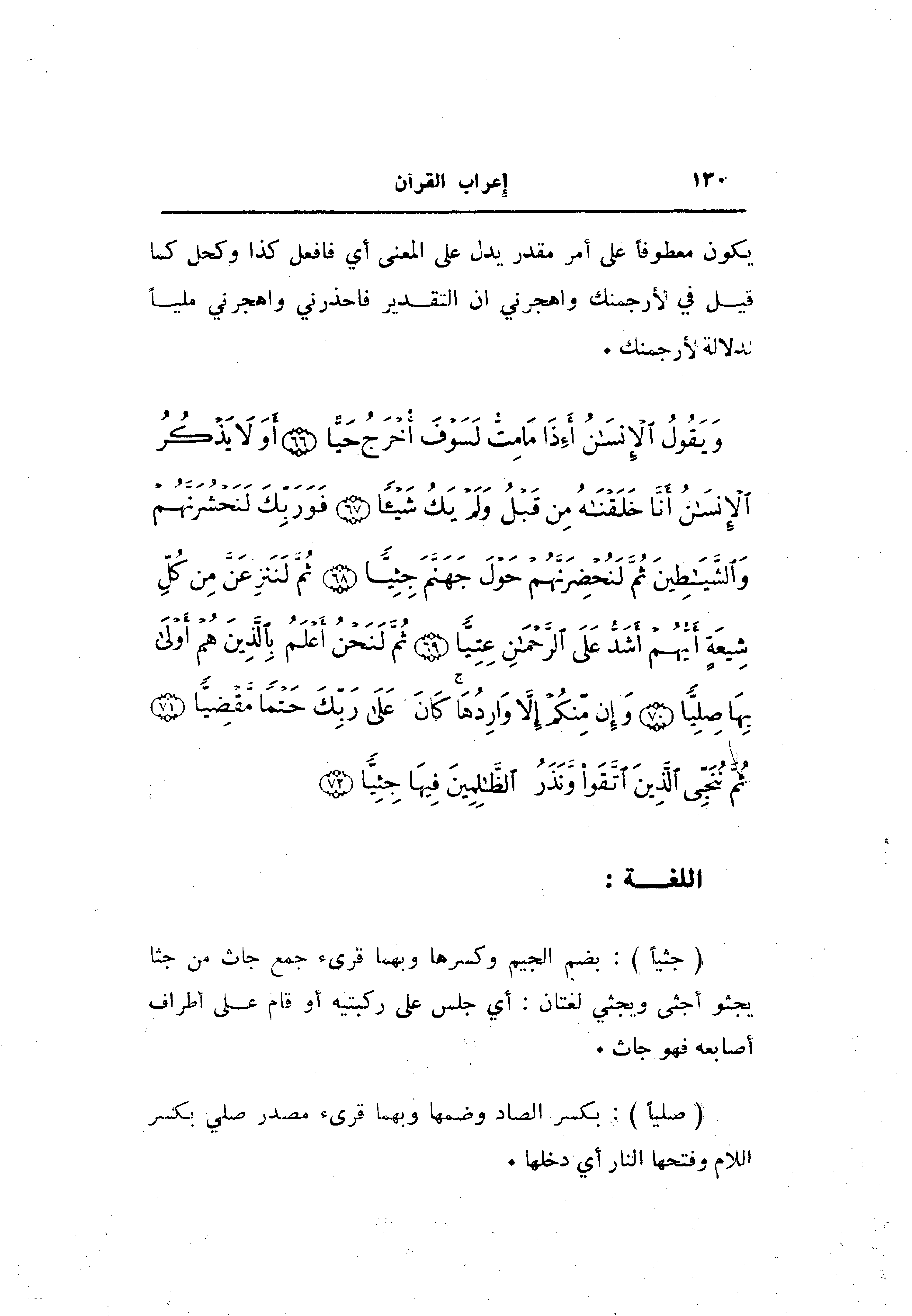 (جِثِيًّا) : بضم الجيم وكسرها وبهما قرئ جمع جاث من جثا يجثو أجثى ويجثي لغتان: أي جلس على ركبتيه أو قام على أطراف أصابعه فهو جاث.