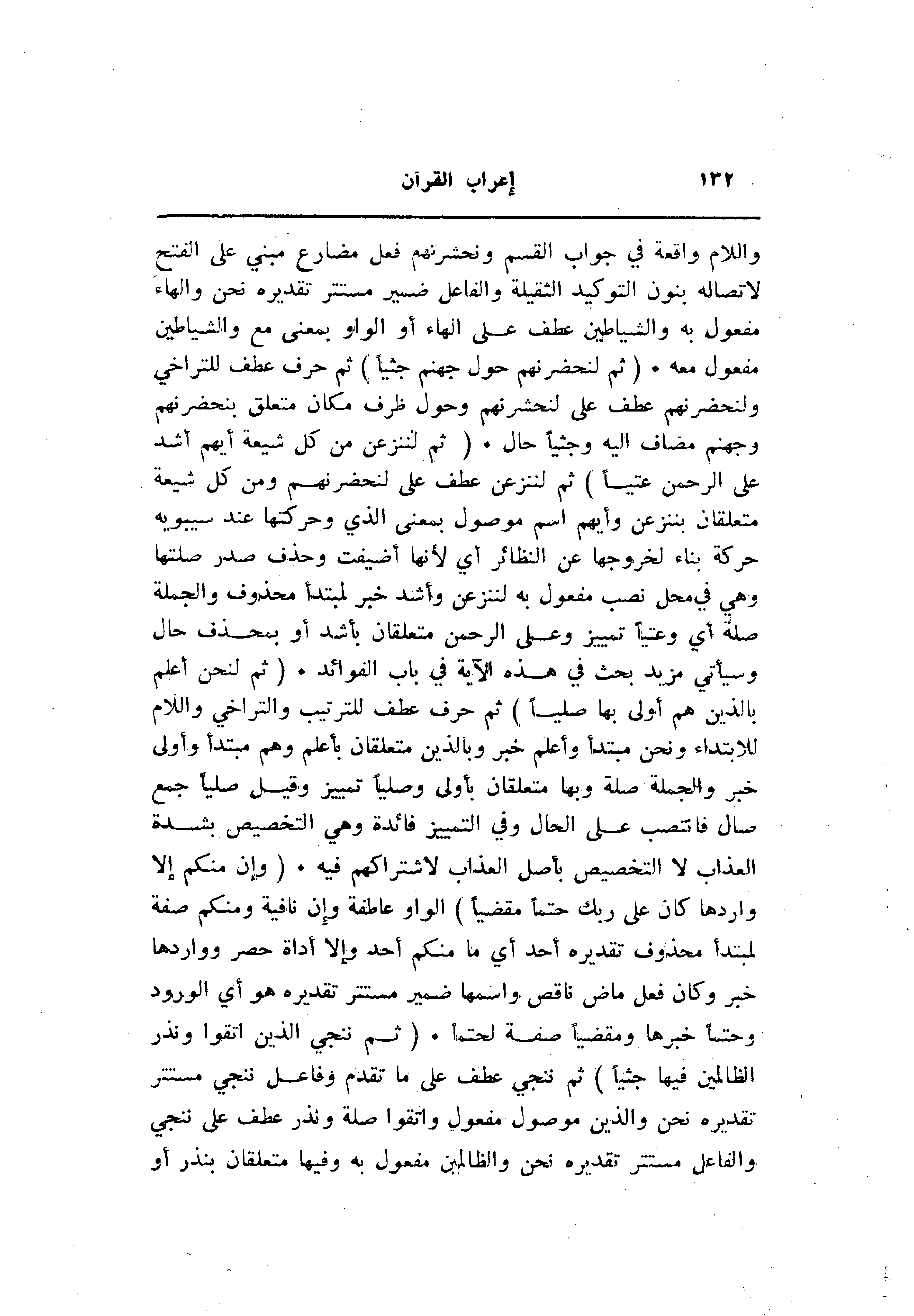واللام واقعة في جواب القسم ونحشرنهم فعل مضارع مبني على الفتح لاتصاله بنون التوكيد الثقيلة والفاعل ضمير مستتر تقديره نحن والهاء مفعول به والشياطين عطف على الهاء أو الواو بمعنى مع والشياطين مفعول معه. (ثُمَّ لَنُحْضِرَنَّهُمْ حَوْلَ جَهَنَّمَ جِثِيًّا) ثم حرف عطف للتراخي ولنحضرنهم عطف على لنحشرنهم وحول ظرف مكان متعلق بنحضرنهم وجهنم مضاف اليه وجثيا حال. (ثُمَّ لَنَنْزِعَنَّ مِنْ كُلِّ شِيعَةٍ أَيُّهُمْ أَشَدُّ عَلَى الرَّحْمنِ عِتِيًّا) ثم لننزعن عطف على لنحضرنهم ومن كل شيعة متعلقان بننزعن وأيهم اسم موصول بمعنى الذي وحركتها عند سيبويه حركة بناء لخروجها عن النظائر أي لأنها أضيفت وحذف صدر صلتها وهي في محل نصب مفعول به لننزعن وأشد خبر لمبتدأ محذوف والجملة صلة أي وعتيا تمييز وعلى الرحمن متعلقان بأشد أو بمحذف حال وسيأتي مزيد بحث في هذه الآية في باب الفوائد. (ثُمَّ لَنَحْنُ أَعْلَمُ بِالَّذِينَ هُمْ أَوْلى بِها صِلِيًّا) ثم حرف عطف للترتيب والتراخي واللام للابتداء ونحن مبتدأ وأعلم خبر وبالذين متعلقان بأعلم وهم مبتدأ وأولى خبر والجملة صلة وبها متعلقان بأولى وصليا تمييز وقيل صليا جمع صال فانتصب على الحال وفي التمييز فائدة وهي التخصيص بشدة العذاب لا التخصيص بأصل العذاب لاشتراكهم فيه. (وَإِنْ مِنْكُمْ إِلَّا وارِدُها كانَ عَلى رَبِّكَ حَتْماً مَقْضِيًّا) الواو عاطفة وإن نافية ومنكم صفة لمبتدأ محذوف تقديره أحد أي ما منكم أحد وإلا أداة حصر وواردها خبر وكان فعل ماض ناقص واسمها ضمير مستتر تقديره هو أي الورود وحتما خبرها ومقضيا صفة لحتما. (ثُمَّ نُنَجِّي الَّذِينَ اتَّقَوْا وَنَذَرُ الظَّالِمِينَ فِيها جِثِيًّا) ثم ننجي عطف على ما تقدم وفاعل ننجي مستتر تقديره نحن والذين موصول مفعول واتقوا صلة ونذر عطف على ننجي والفاعل مستتر تقديره نحن والظالمين مفعول به وفيها متعلقان بنذر أو