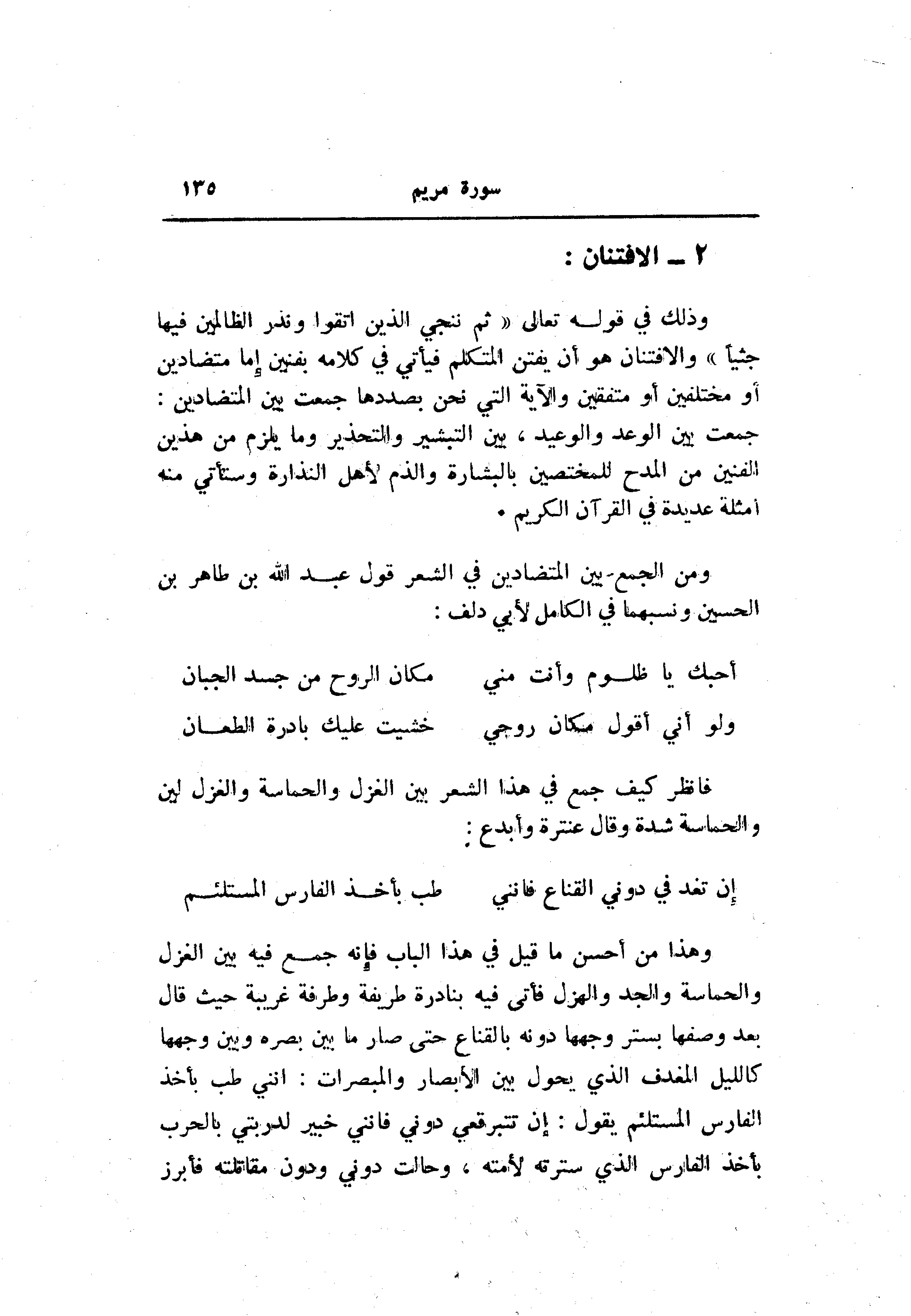 وذلك في قوله تعالى «ثُمَّ نُنَجِّي الَّذِينَ اتَّقَوْا وَنَذَرُ الظَّالِمِينَ فِيها جِثِيًّا» والافتنان هو أن يفتن المتكلم فيأتي في كلامه بفنين إما متضادين أو مختلفين أو متفقين والآية التي نحن بصددها جمعت بين المتضادين: