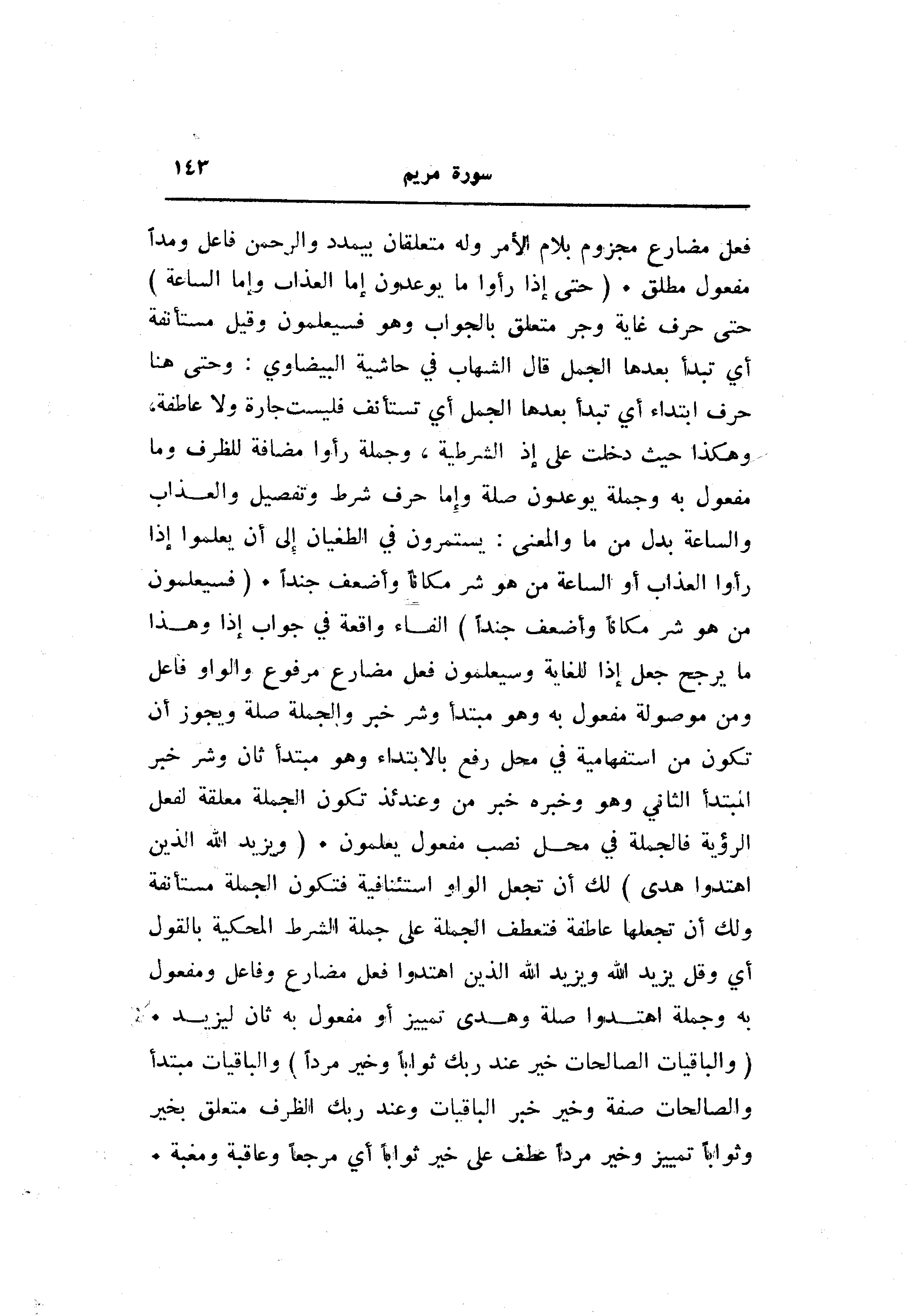 فعل مضارع مجزوم بلام الأمر وله متعلقان بيمدد والرحمن فاعل ومدا مفعول مطلق. (حَتَّى إِذا رَأَوْا ما يُوعَدُونَ إِمَّا الْعَذابَ وَإِمَّا السَّاعَةَ) حتى حرف غاية وجر متعلق بالجواب وهو فسيعلمون وقيل مستأنفة أي تبدأ بعدها الجمل قال الشهاب في حاشية البيضاوي: وحتى هنا حرف ابتداء أي تبدأ بعدها الجمل أي تستأنف فليست جارة ولا عاطفة، وهكذا حيث دخلت على إذ الشرطية، وجملة رأوا مضافة للظرف وما مفعول به وجملة يوعدون صلة وإما حرف شرط وتفصيل والعذاب والساعة بدل من ما والمعنى: يستمرون في الطغيان إلى أن يعلموا إذا رأوا العذاب أو الساعة من هو شر مكانا وأضعف جندا. (فَسَيَعْلَمُونَ مَنْ هُوَ شَرٌّ مَكاناً وَأَضْعَفُ جُنْداً) الفاء واقعة في جواب إذا وهذا ما يرجح جعل إذا للغاية وسيعلمون فعل مضارع مرفوع والواو فاعل ومن موصولة مفعول به وهو مبتدأ وشر خبر والجملة صلة ويجوز أن تكون من استفهامية في محل رفع بالابتداء وهو مبتدأ ثان وشر خبر المبتدأ الثاني وهو وخبره خبر من وعندئذ تكون الجملة معلقة لفعل الرؤية فالجملة في محل نصب مفعول يعلمون. (وَيَزِيدُ اللَّهُ الَّذِينَ اهْتَدَوْا هُدىً) لك أن تجعل الواو استئنافية فتكون الجملة مستأنفة ولك أن تجعلها عاطفة فتعطف الجملة على جملة الشرط المحكية بالقول أي وقل يزيد الله ويزيد الله الذين اهتدوا فعل مضارع وفاعل ومفعول به وجملة اهتدوا صلة وهدى تمييز أو مفعول به ثان ليزيد.