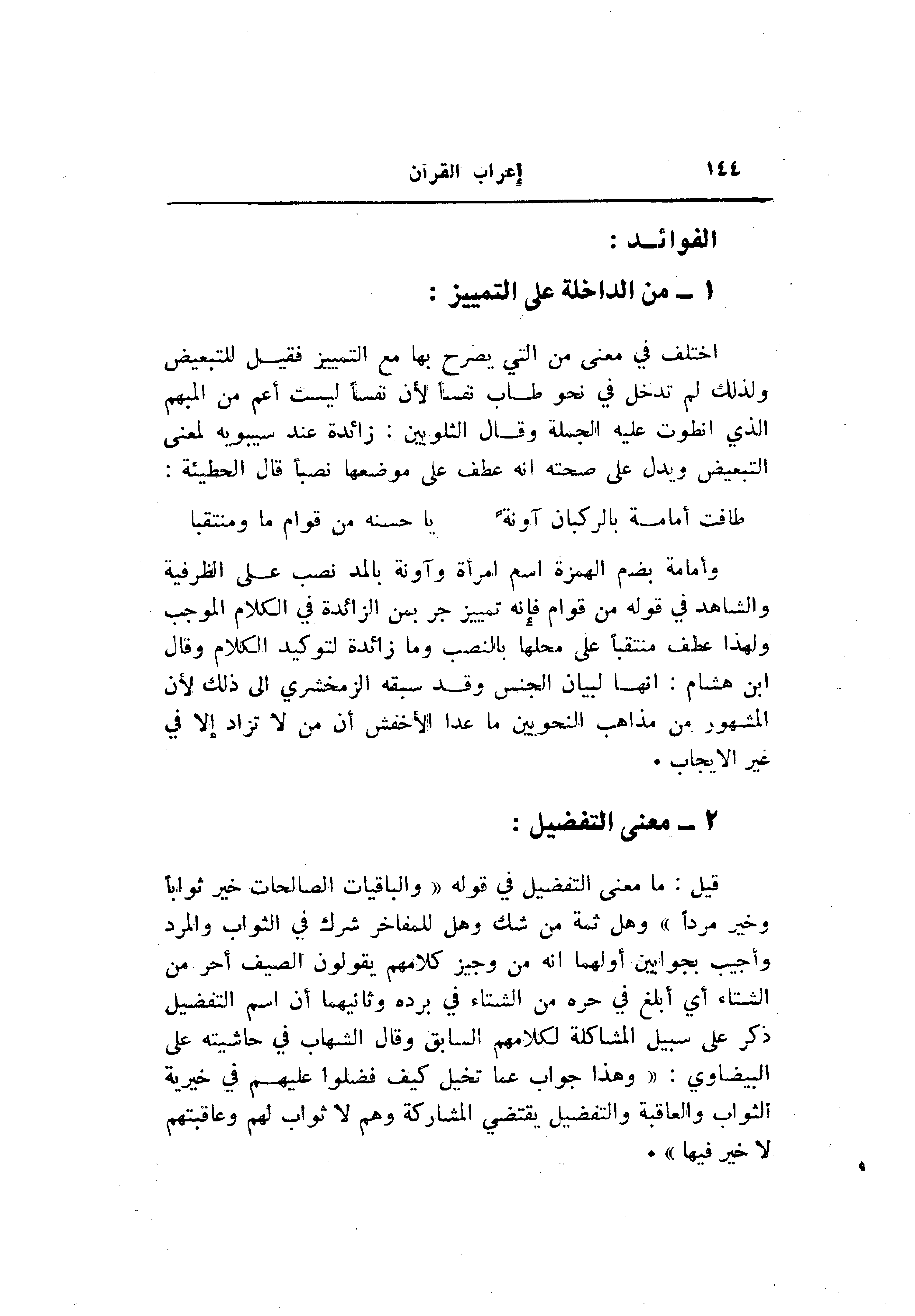 قيل: ما معنى التفضيل في قوله «وَالْباقِياتُ الصَّالِحاتُ خَيْرٌ عِنْدَ رَبِّكَ ثَواباً وَخَيْرٌ مَرَدًّا» وهل ثمة من شك وهل للمفاخر شرك في الثواب والمرد وأجيب بجوابين أو لهما انه من وجيز كلامهم يقولون الصيف أحر من الشتاء أي أبلغ في حره من الشتاء في برده وثانيهما أن اسم التفضيل ذكر على سبيل المشاكلة لكلامهم السابق وقال الشهاب في حاشيته على البيضاوي: «وهذا جواب عما تخيل كيف فضلوا عليهم في خيرية الثواب والعاقبة والتفضيل يقتضي المشاركة وهم لا ثواب لهم وعاقبتهم لا خير فيها» .