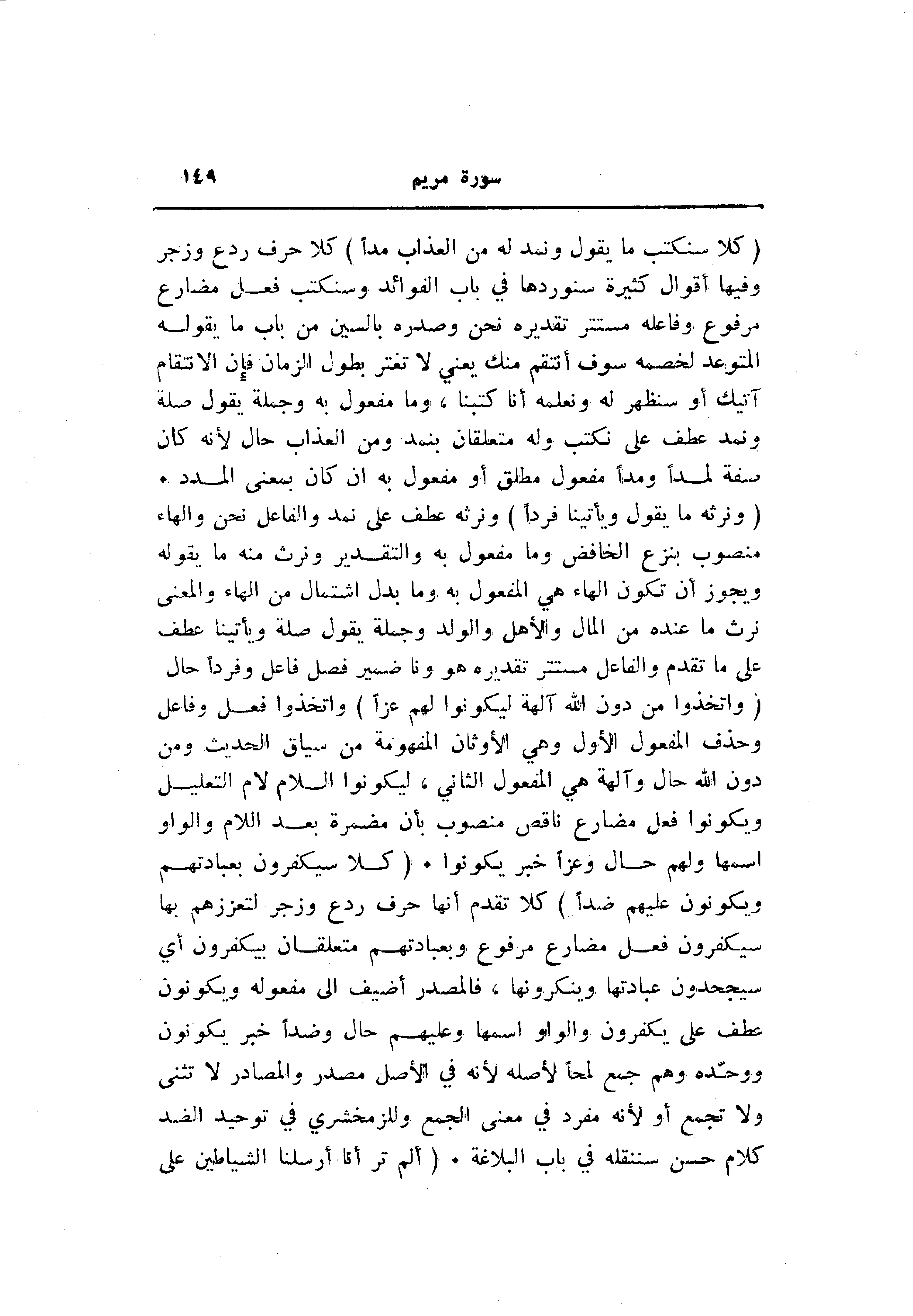 (وَنَرِثُهُ ما يَقُولُ وَيَأْتِينا فَرْداً) ونرثه عطف على نمد والفاعل نحن والهاء منصوب بنزع الخافض وما مفعول به والتقدير ونرث منه ما يقوله ويجوز أن تكون الهاء هي المفعول به وما بدل اشتمال من الهاء والمعنى نرث ما عنده من المال والأهل والولد وجملة يقول صلة ويأتينا عطف على ما تقدم والفاعل مستتر تقديره هو ونا ضمير فصل فاعل وفردا حال (وَاتَّخَذُوا مِنْ دُونِ اللَّهِ آلِهَةً لِيَكُونُوا لَهُمْ عِزًّا) واتخذوا فعل وفاعل وحذف المفعول الأول وهي الأوثان المفهومة من سياق الحديث ومن دون الله حال وآلهة هي المفعول الثاني، ليكونوا اللام لام التعليل ويكونوا فعل مضارع ناقص منصوب بأن مضمرة بعد اللام والواو اسمها ولهم حال وعزا خبر يكونوا. (كَلَّا سَيَكْفُرُونَ بِعِبادَتِهِمْ وَيَكُونُونَ عَلَيْهِمْ ضِدًّا) كلا تقدم أنها حرف ردع وزجر لتعززهم بها سيكفرون فعل مضارع مرفوع وبعبادتهم متعلقان بيكفرون أي سيجحدون عبادتها وينكرونها، فالمصدر أضيف الى مفعوله ويكونون عطف على يكفرون والواو اسمها وعليهم حال وضدا خبر يكونون ووحّده وهم جمع لمحا لأصله لأنه في الأصل مصدر والمصادر لا تثنى ولا تجمع أو لأنه مفرد في معنى الجمع وللزمخشري في توحيد الضد كلام حسن سننقله في باب البلاغة. (أَلَمْ تَرَ أَنَّا أَرْسَلْنَا الشَّياطِينَ عَلَى