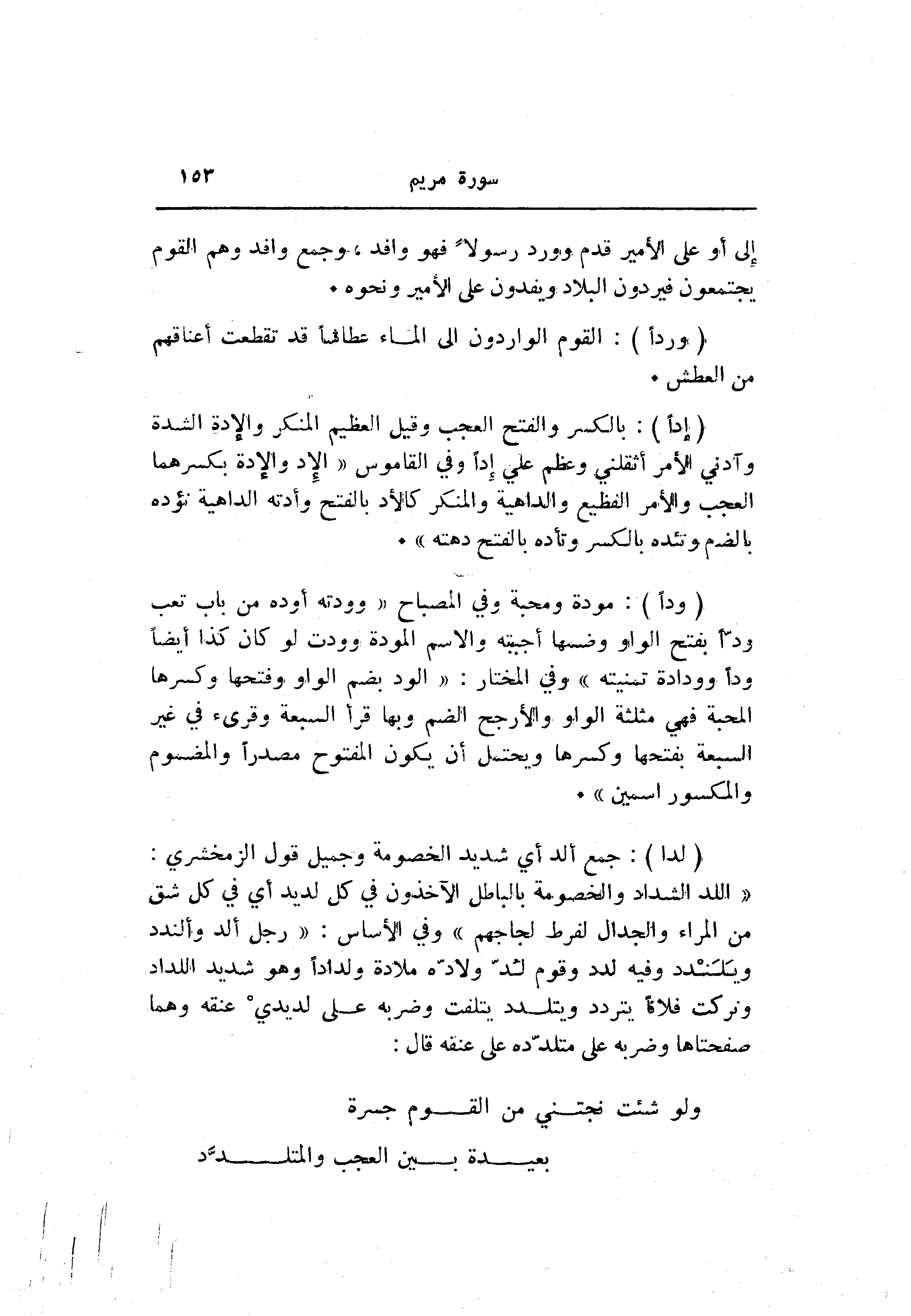 (إِدًّا) : بالكسر والفتح العجب وقيل العظيم المنكر ولادة الشدة وآدني الأمر أثقلني وعظم علي إدا وفي القاموس «الإد والإدة بكسرهما العجب والأمر الفظيع والداهية والمنكر كالأد بالفتح وأدته الداهية تؤده بالضم وتئده بالكسر وتأده بالفتح دهته» .