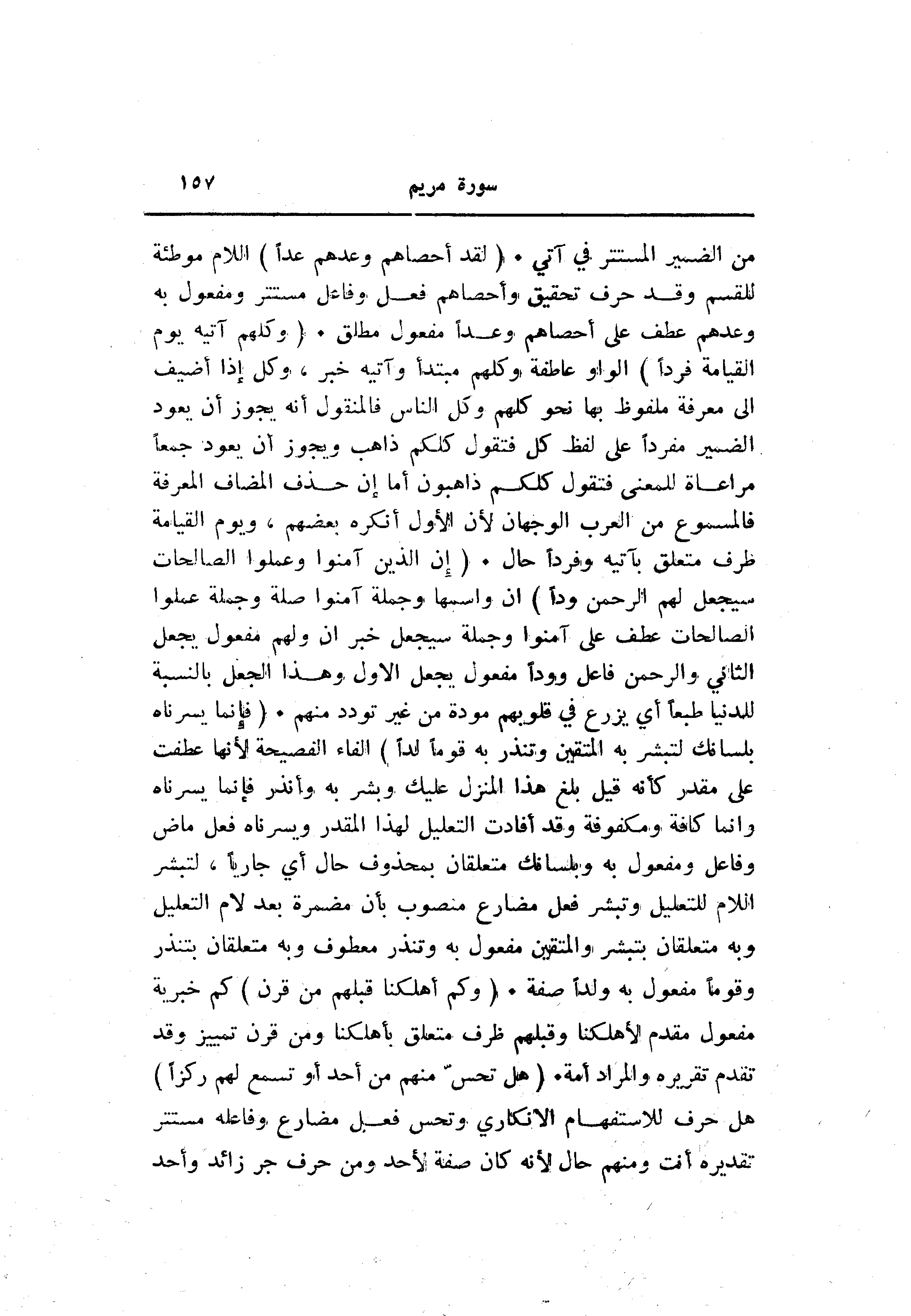 من الضمير المستتر في آتي. (لَقَدْ أَحْصاهُمْ وَعَدَّهُمْ عَدًّا) اللام موطئة للقسم وقد حرف تحقيق وأحصاهم فعل وفاعل مستتر ومفعول به وعدهم عطف على أحصاهم وعدا مفعول مطلق. (وَكُلُّهُمْ آتِيهِ يَوْمَ الْقِيامَةِ فَرْداً) الواو عاطفة وكلهم مبتدأ وآتيه خبر، وكل إذا أضيف الى معرفة ملفوظ بها نحو كلهم وكل الناس فالمنقول أنه يجوز أن يعود الضمير مفردا على لفظ كل فتقول كلكم ذاهب ويجوز أن يعود جمعا مراعاة للمعنى فتقول كلكم ذاهبون أما إن حذف المضاف المعرفة فالمسموع من العرب الوجهان لأن الأول أنكره بعضهم، ويوم القيامة ظرف متعلق بآتيه وفردا حال. (إِنَّ الَّذِينَ آمَنُوا وَعَمِلُوا الصَّالِحاتِ سَيَجْعَلُ لَهُمُ الرَّحْمنُ وُدًّا) ان واسمها وجملة آمنوا صلة وجملة عملوا الصالحات عطف على آمنوا وجملة سيجعل خبر ان ولهم مفعول يجعل الثاني والرحمن فاعل وودا مفعول يجعل الاول وهذا الجعل بالنسبة للدنيا طبعا أي يزرع في قلوبهم مودة من غير تودد منهم. (فَإِنَّما يَسَّرْناهُ بِلِسانِكَ لِتُبَشِّرَ بِهِ الْمُتَّقِينَ وَتُنْذِرَ بِهِ قَوْماً لُدًّا) الفاء الفصيحة لأنها عطفت على مقدر كأنه قيل بلغ هذا المنزل عليك وبشر به وأنذر فإنما يسرناه وانما كافة ومكفوفة وقد أفادت التعليل لهذا المقدر ويسرناه فعل ماض وفاعل ومفعول به وبلسانك متعلقان بمحذوف حال أي جاريا، لتبشر اللام للتعليل وتبشر فعل مضارع منصوب بأن مضمرة بعد لام التعليل وبه متعلقان بتبشر والمتقين مفعول به وتنذر معطوف وبه متعلقان بتنذر وقوما مفعول به ولدا صفة. (وَكَمْ أَهْلَكْنا قَبْلَهُمْ مِنْ قَرْنٍ) كم خبرية مفعول مقدم لأهلكنا وقبلهم ظرف متعلق بأهلكنا ومن قرن تمييز وقد تقدم تقريره والمراد أمة. (هَلْ تُحِسُّ مِنْهُمْ مِنْ أَحَدٍ أَوْ تَسْمَعُ لَهُمْ رِكْزاً) هل حرف للاستفهام الانكاري وتحس فعل مضارع وفاعله مستتر تقديره أنت ومنهم حال لأنه كان صفة لأحد ومن حرف جر زائد وأحد