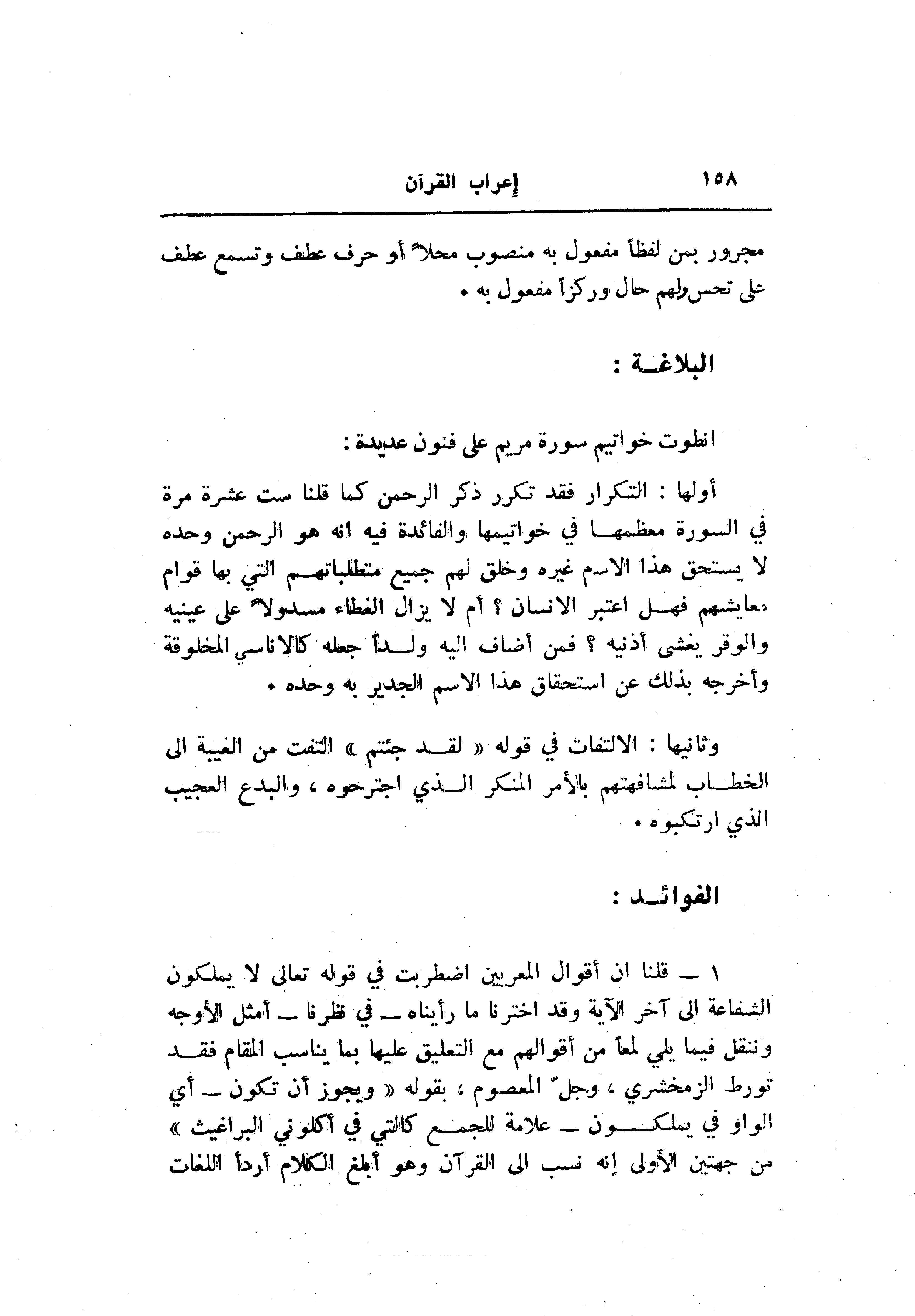 1- قلنا ان أقوال المعربين اضطربت في قوله تعالى لا يملكون الشفاعة الى آخر الآية وقد اخترنا ما رأيناه- في نظرنا- أمثل الأوجه وننقل فيما يلي لمعا من أقوالهم مع التعليق عليها بما يناسب المقام فقد تورط الزمخشري، وجلّ المعصوم، بقوله «ويجوز أن تكون- أي الواو في يملكون- علامة للجمع كالتي في أكلوني البراغيث» من جهتين الأولى إنه نسب الى القرآن وهو أبلغ الكلام أردأ اللغات