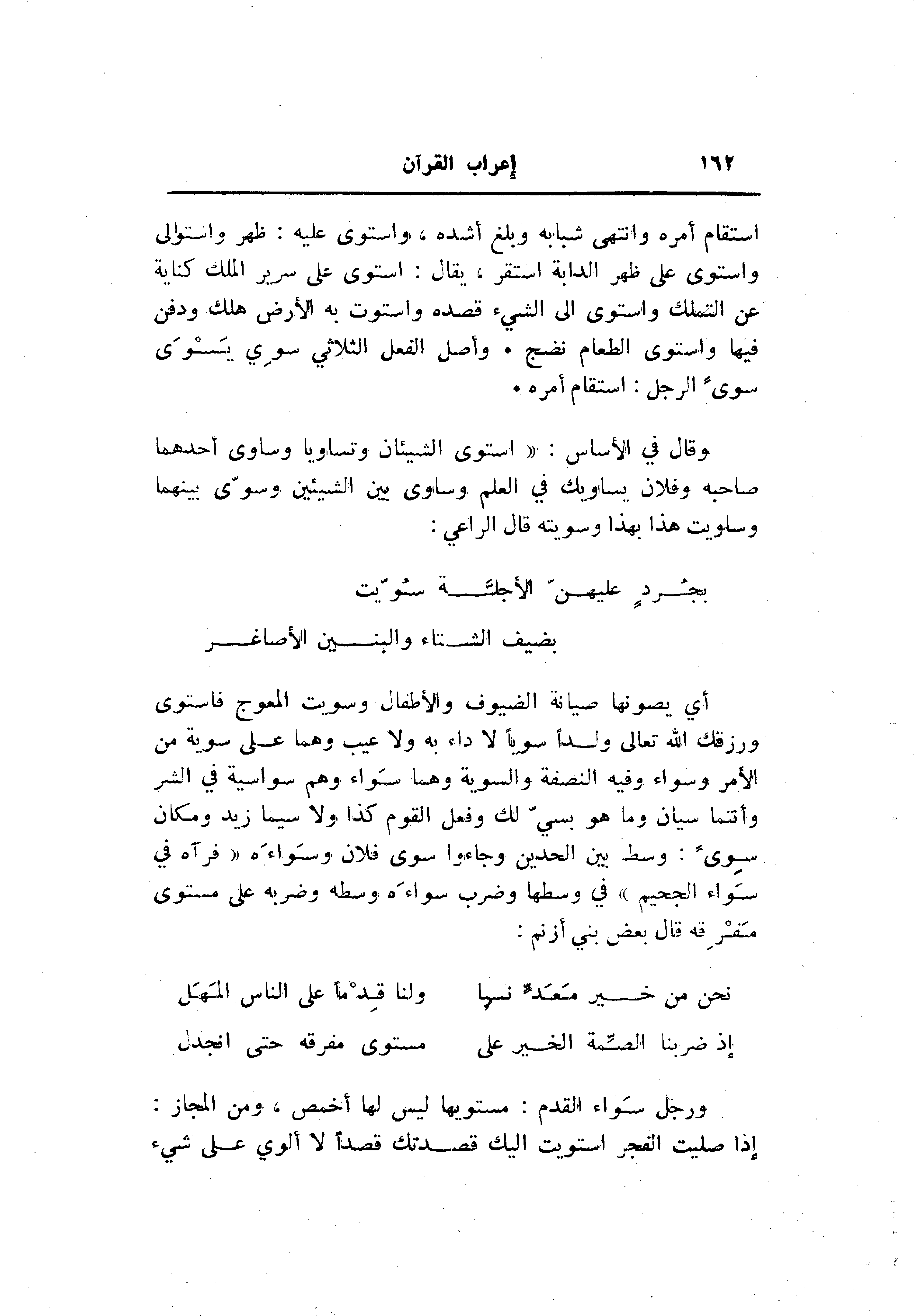 أي يصونها صيانة الضيوف والأطفال وسويت المعوج فاستوى ورزقك الله تعالى ولدا سويا لا داء به ولا عيب وهما على سوية من الأمر وسواء وفيه النصفة والسوية وهما سواء وهم سواسية في الشر وأنتما سيان وما هو بسيّ لك وفعل القوم كذا ولا سيما زيد ومكان سوى: وسط بين الحدين وجاءوا سوى فلان وسواءه «فرآه في سواء الجحيم» في وسطها وضرب سواءه وسطه وضربه على مستوى مفرقه قال بعض بني أزنم:
