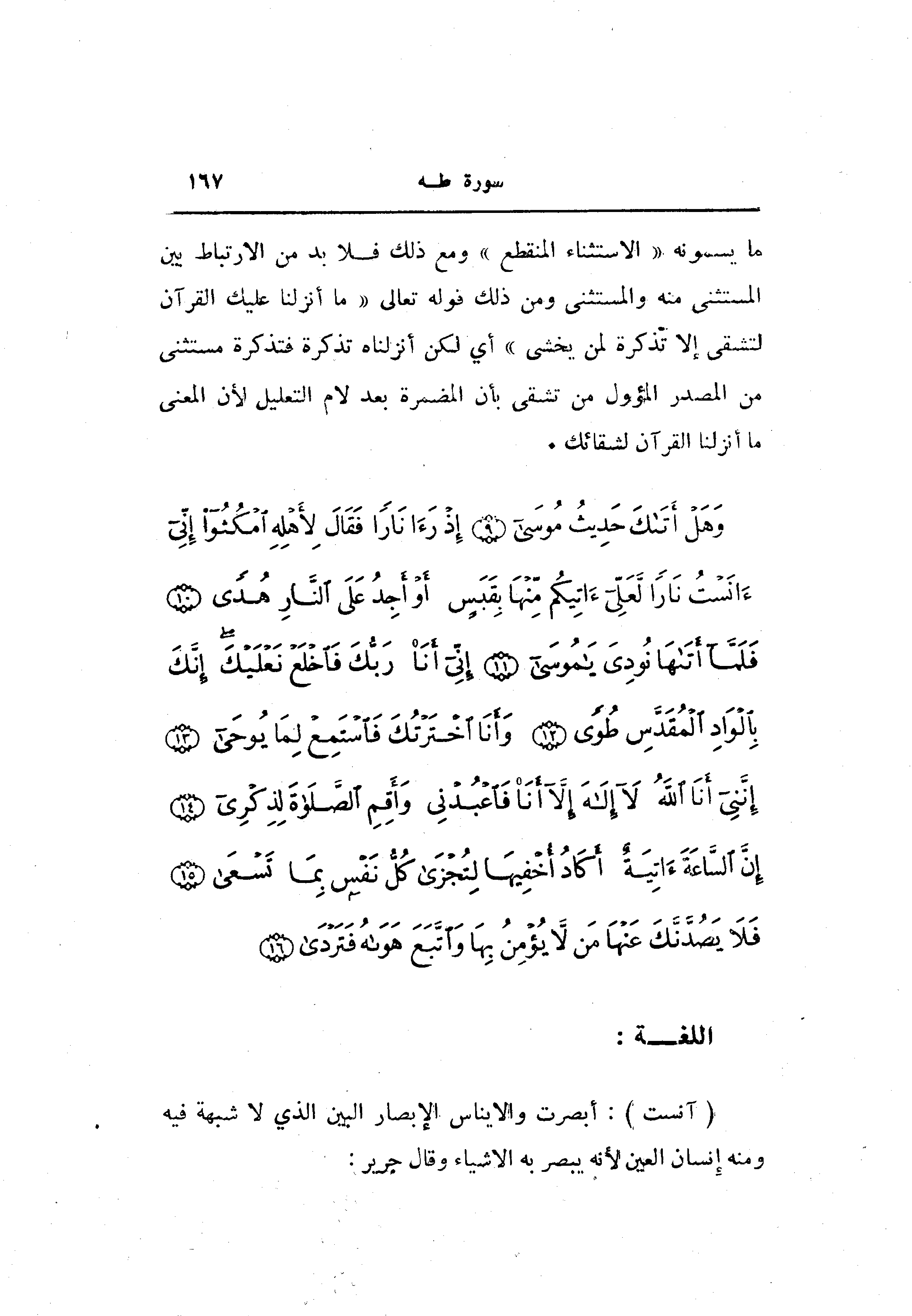 ما يسونه «الاستثناء المنقطع» ومع ذلك فلا بد من الارتباط بين المستثنى منه والمستثنى ومن ذلك قوله تعالى «ما أنزلنا عليك القرآن لتشقى إلا تذكرة لمن يخشى» أي لكن أنزلناه تذكرة فتذكرة مستثنى من المصدر المؤول من تشقى بأن المضمرة بعد لام التعليل لأن المعنى ما أنزلنا القرآن لشقائك.