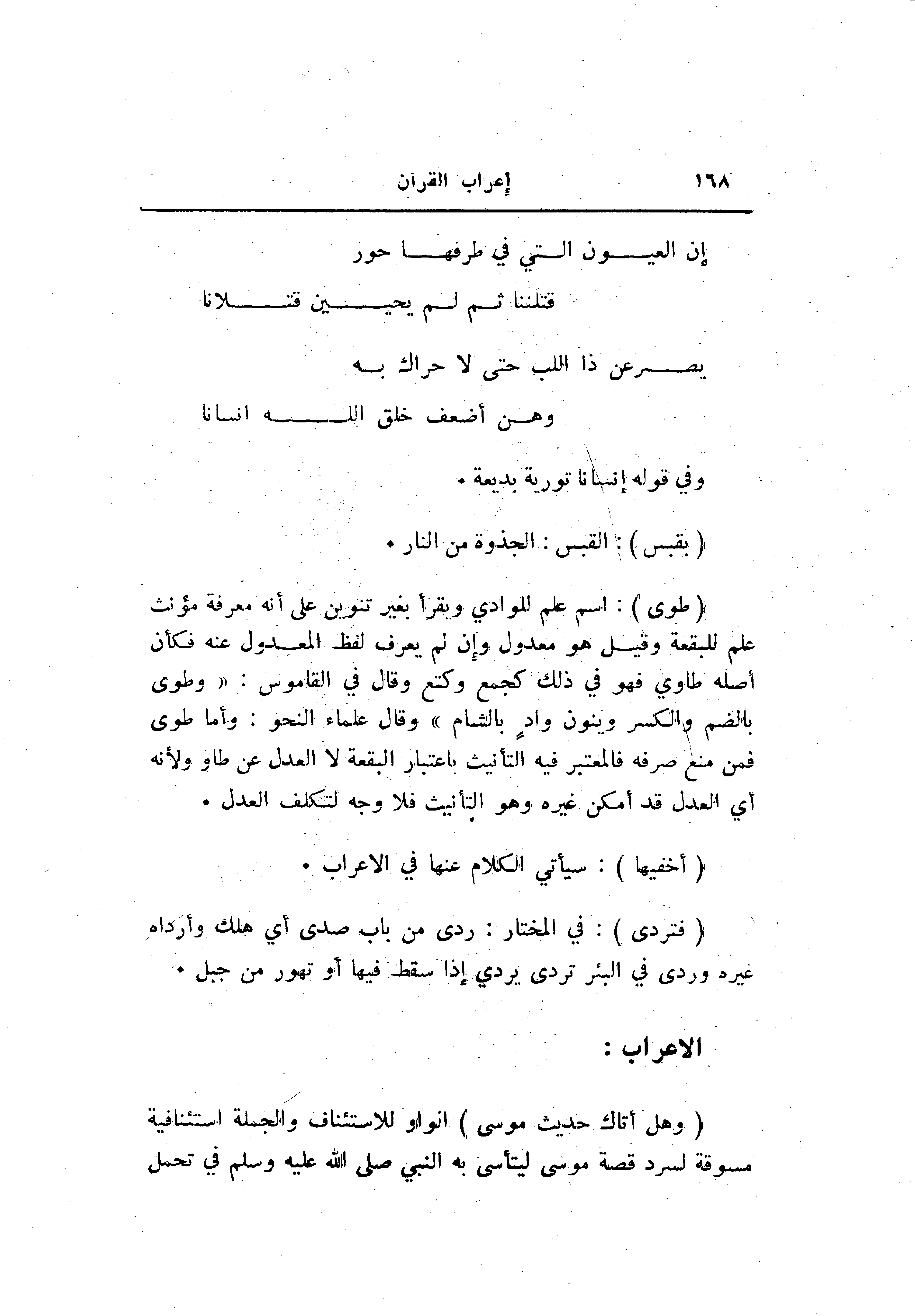 (طُوىً) : اسم علم للوادي ويقرأ بغير تنوين على أنه معرفة مؤنث علم للبقعة وقيل هو معدول وإن لم يعرف لفظ المعدول عنه فكأن أصله طاوي فهو في ذلك كجمع وكتع وقال في القاموس: «وطوى بالضم والكسر وينون واد بالشام» وقال علماء النحو: وأما طوى فمن منع صرفه فالمعتبر فيه التأنيث باعتبار البقعة لا العدل عن طاو ولأنه أي العدل قد أمكن غيره وهو التأنيث فلا وجه لتكلف العدل.