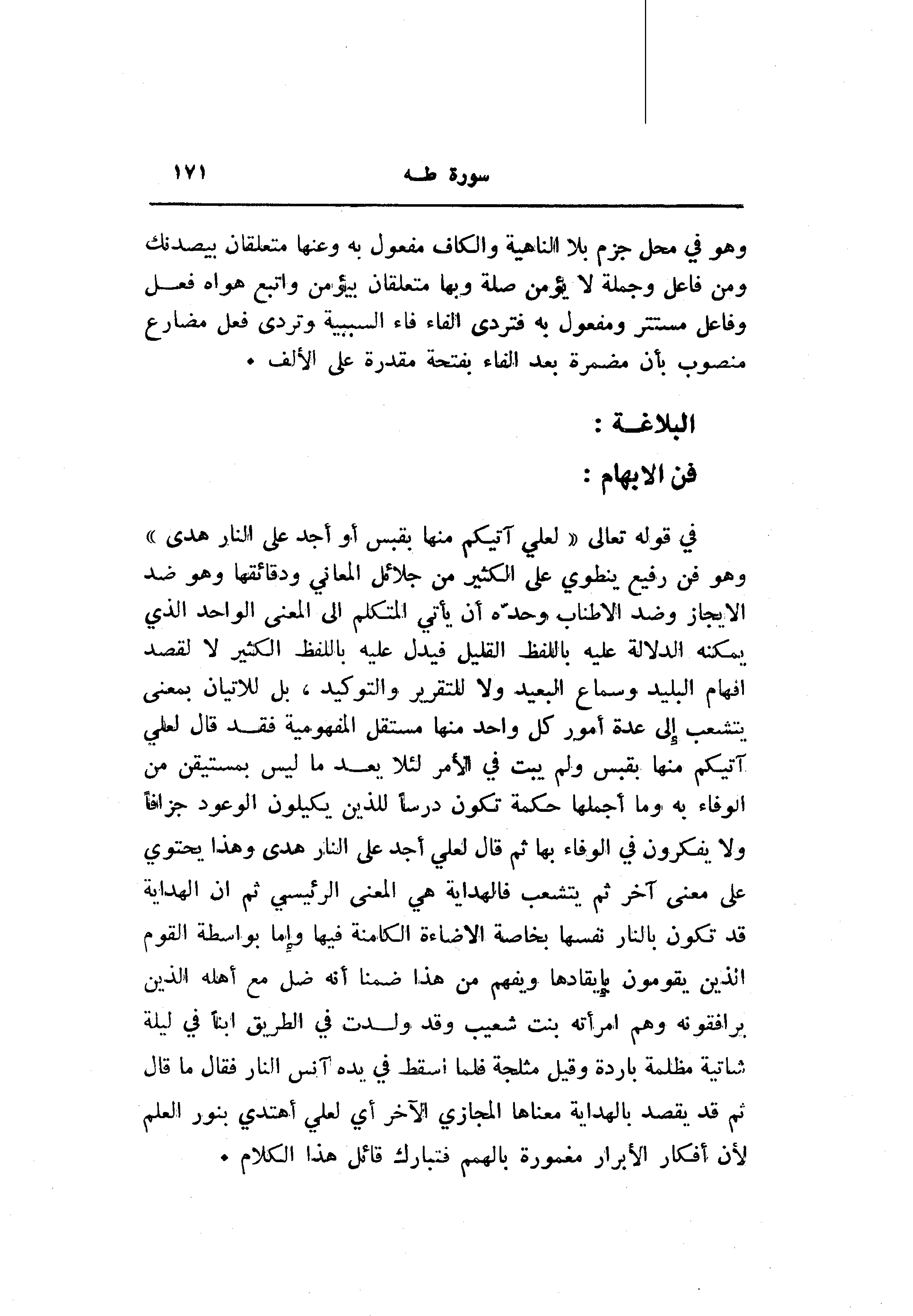 في قوله تعالى «لَعَلِّي آتِيكُمْ مِنْها بِقَبَسٍ أَوْ أَجِدُ عَلَى النَّارِ هُدىً» وهو فن رفيع ينطوي على الكثير من جلائل المعاني ودقائقها وهو ضد الإيجاز وضد الاطناب وحدّه أن يأتي المتكلم الى المعنى الواحد الذي يمكنه الدلالة عليه باللفظ القليل فيدل عليه باللفظ الكثير لا لقصد إفهام البليد وسماع البعيد ولا للتقرير والتوكيد، بل للاتيان بمعنى يتشعب إلى عدة أمور كل واحد منها مستقل المفهومية فقد قال لعلي آتيكم منها بقبس ولم يبت في الأمر لئلا يعد ما ليس بمستيقن من الوفاء به وما أجملها حكمة تكون درسا للذين يكيلون الوعود جزافا ولا يفكرون في الوفاء بها ثم قال لعلي أجد على النار هدى وهذا يحتوي على معنى آخر ثم يتشعب فالهداية هي المعنى الرئيسي ثم ان الهداية قد تكون بالنار نفسها بخاصة الاضاءة الكامنة فيها وإما بواسطة القوم الذين يقومون بإيقادها ويفهم من هذا ضمنا أنه ضل مع أهله الذين يرافقونه وهم امرأته بنت شعيب وقد ولدت في الطريق ابنا في ليلة شاتية مظلمة باردة وقيل مثلجة فلما أسقط في يده آنس النار فقال ما قال ثم قد يقصد بالهداية معناها المجازي الآخر أي لعلي أهتدي بنور العلم لأن أفكار الأبرار مغمورة بالهمم فتبارك قائل هذا الكلام.