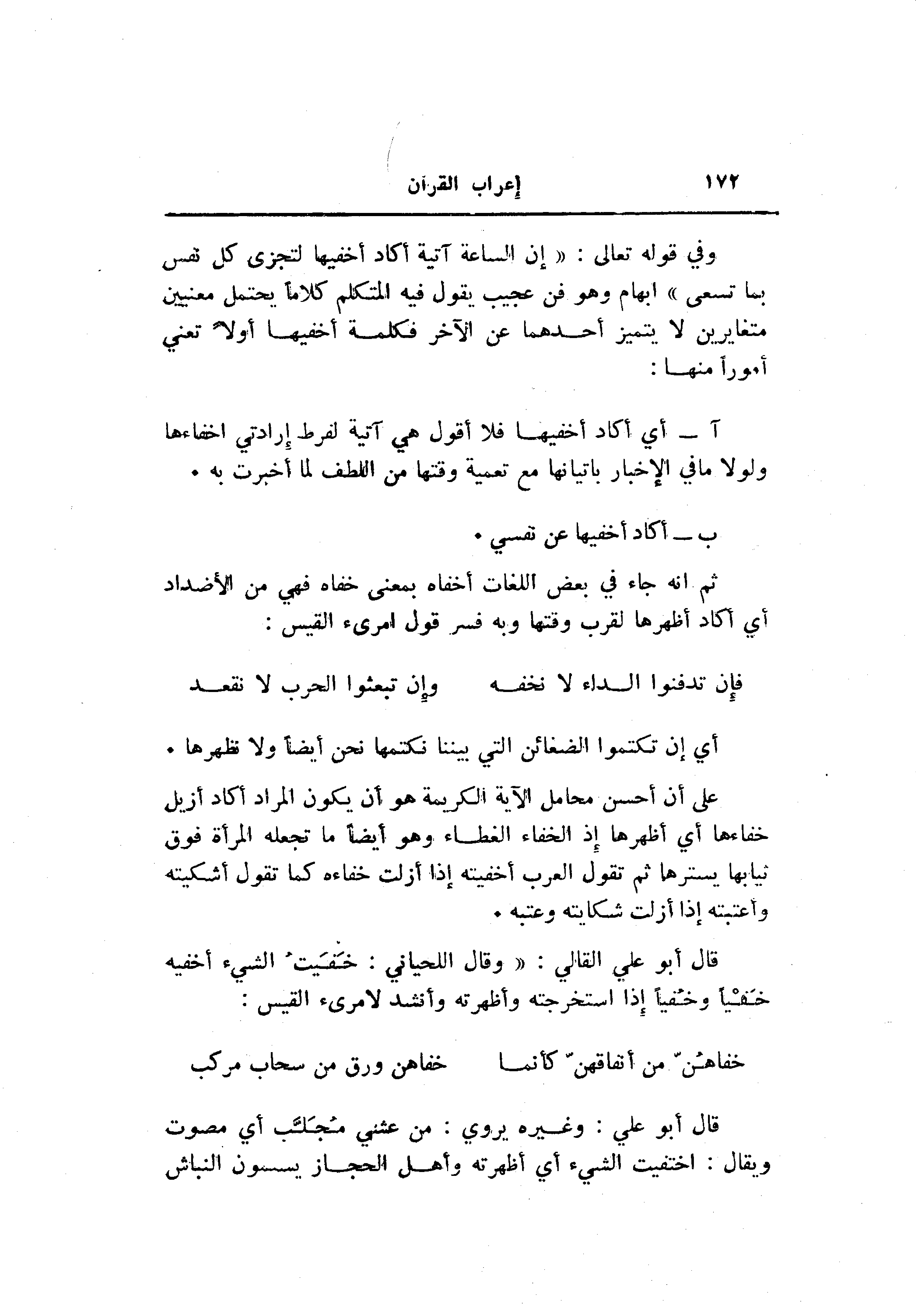 على أن أحسن محامل الآية الكريمة هو أن يكون المراد أكاد أزيل خفاءها أي أظهرها إذ الخفاء الغطاء وهو أيضا ما تجعله المرأة فوق نيابها يسترها ثم تقول العرب أخفيته إذا أزلت خفاءه كما تقول أشكيته وأعتبته إذا أزلت شكايته وعتبه.