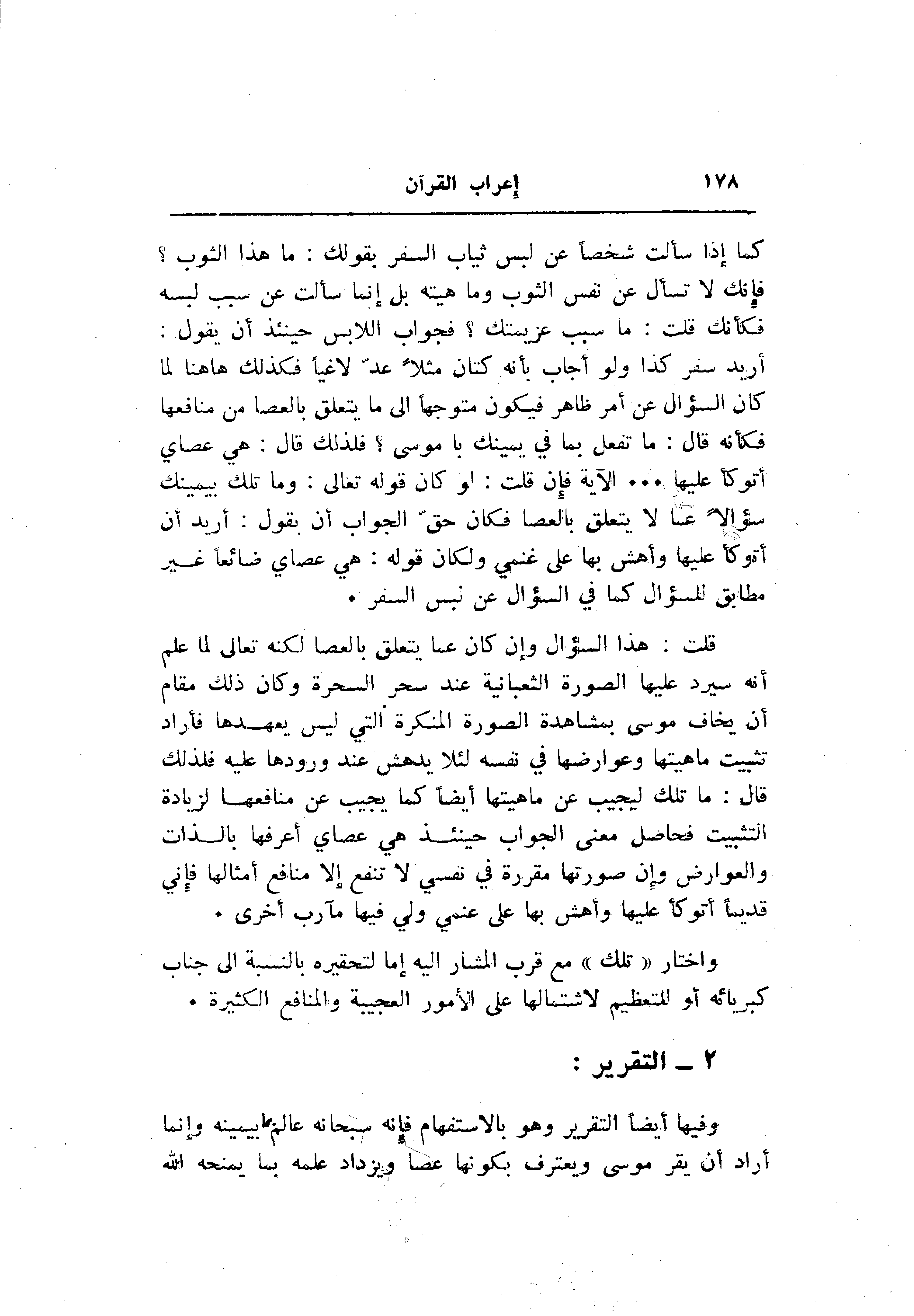 أريد سفر كذا ولو أجاب بأنه كتان مثلا عدّ لاغيا فكذلك هاهنا لما كان السؤال عن أمر ظاهر فيكون متوجها الى ما يتعلق بالعصا من منافعها فكأنه قال: ما تفعل بما في يمينك با موسى؟ فلذلك قال: هي عصاي أتوكأ عليها ... الآية فإن قلت: لو كان قوله تعالى: وما تلك بيمينك سؤالا عما لا يتعلق بالعصا فكان حقّ الجواب أن بقول: أريد أن أتوكأ عليها وأهش بها على غنمي ولكان قوله: هي عصاي ضائعا غير مطابق للسؤال كما في السؤال عن نبس السفر.