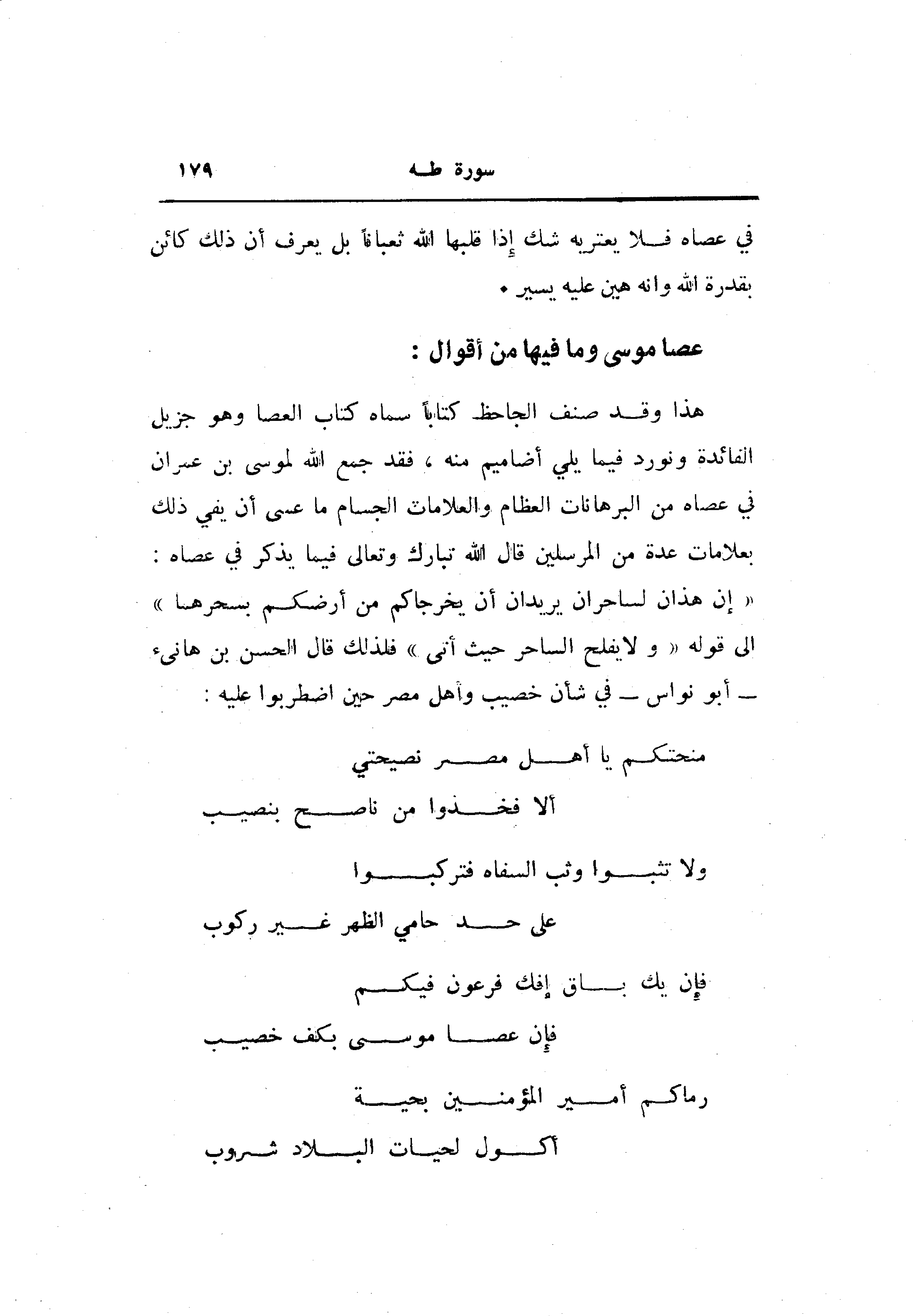 «إِنْ هذانِ لَساحِرانِ يُرِيدانِ أَنْ يُخْرِجاكُمْ مِنْ أَرْضِكُمْ بِسِحْرِهِما» الى قوله «ولا يفلح الساحر حيث أتى» فلذلك قال الحسن بن هانئ- أبو نواس- في شأن خصيب وأهل مصر حين اضطربوا عليه: