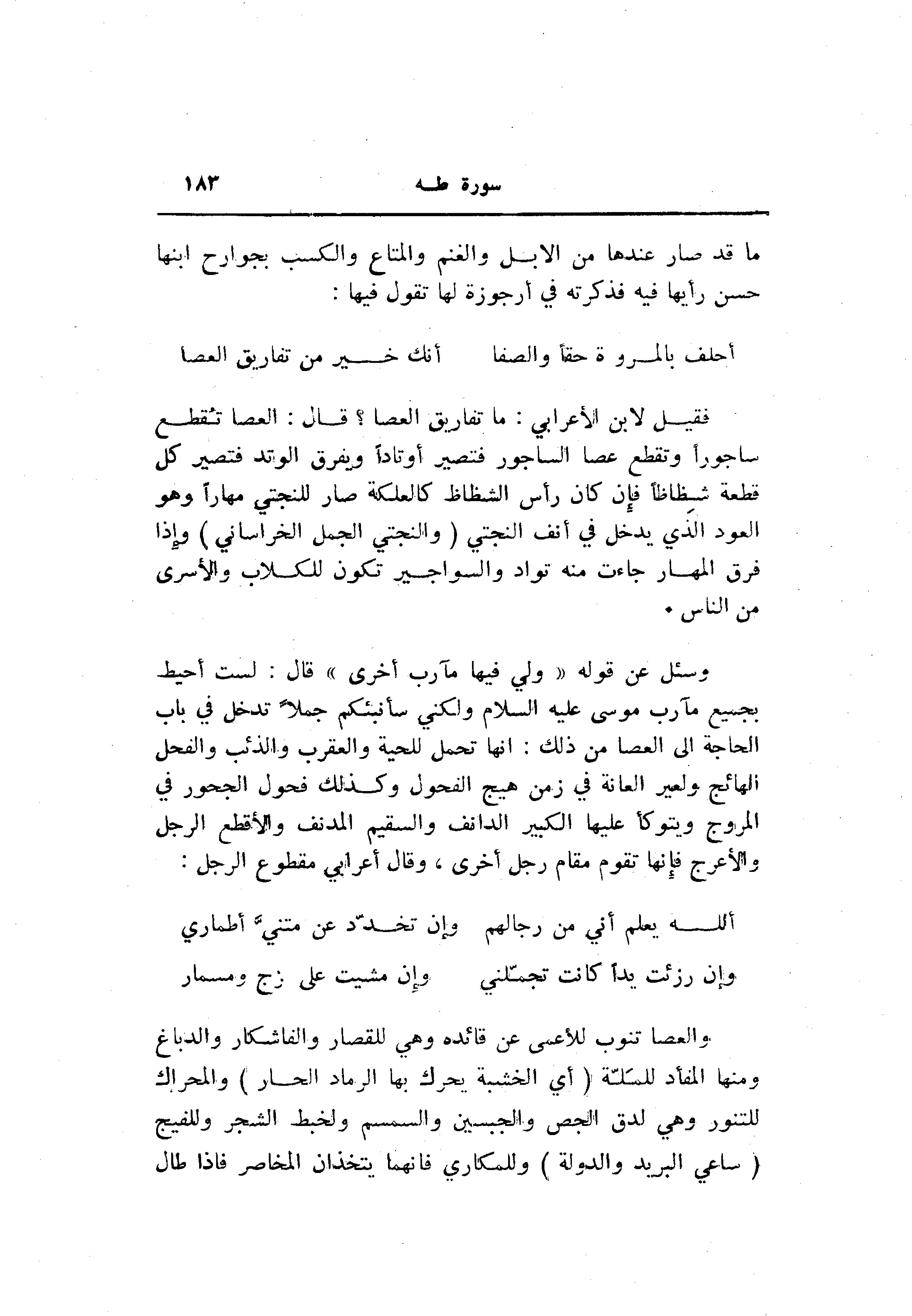وسئل عن قوله «ولي فيها مآرب أخرى» قال: لست أحيط بجميع مآرب موسى عليه السلام ولكني سأنبئكم جملا تدخل في باب الحاجة الى العصا من ذلك: انها تحمل للحية والعقرب والذئب والفحل الهائج ولعير العانة في زمن هيج الفحول وكذلك فحول الجحور في المروج ويتوكأ عليها الكبير الدانف والسقيم المدنف والأقطع الرجل والأعرج فإنها تقوم مقام رجل أخرى، وقال أعرابي مقطوع الرجل: