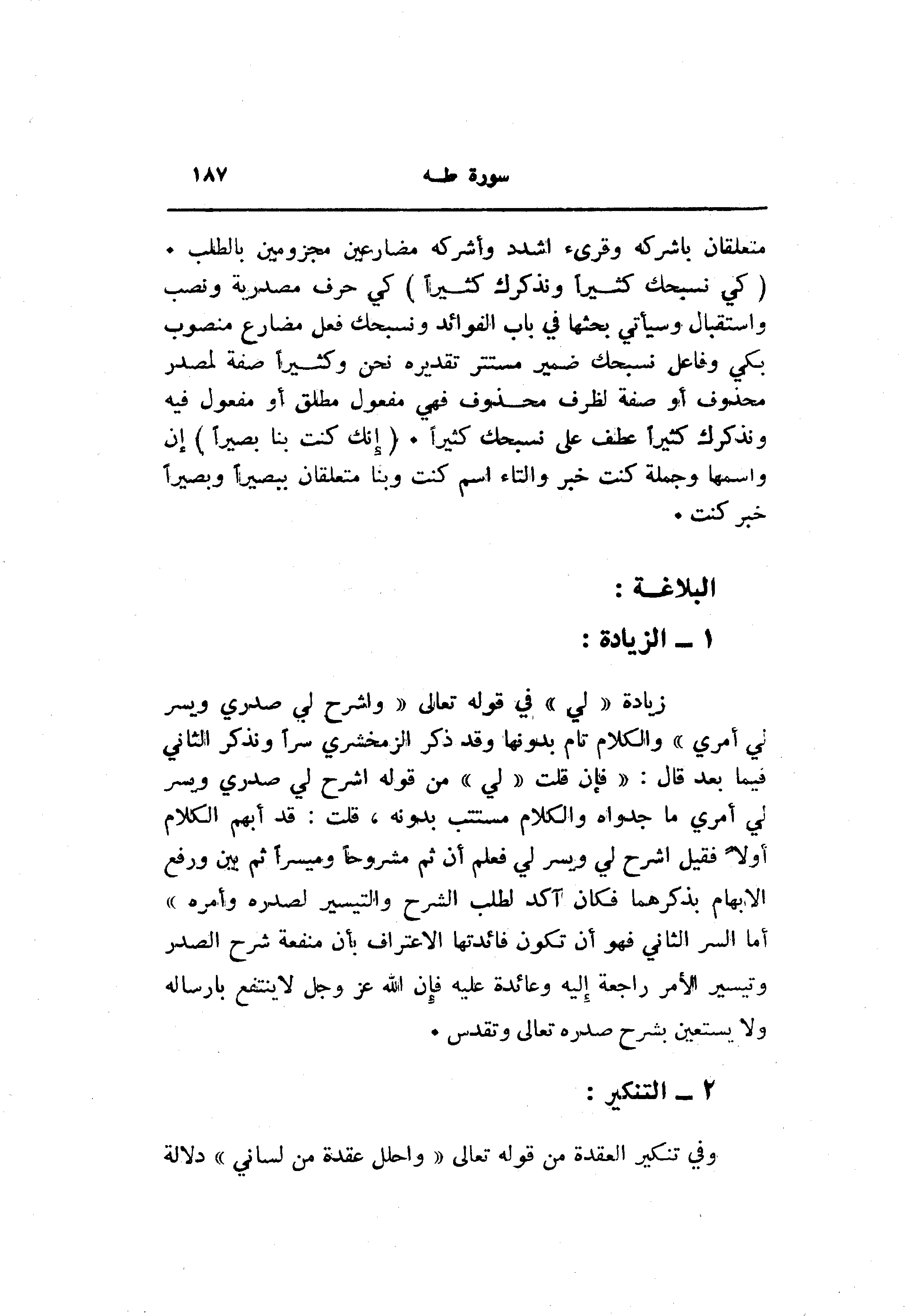 زيادة «لي» في قوله تعالى «رَبِّ اشْرَحْ لِي صَدْرِي وَيَسِّرْ لِي أَمْرِي» والكلام تام بدونها وقد ذكر الزمخشري سرا ونذكر الثاني فيما بعد قال: «فإن قلت «لي» من قوله اشرح لي صدري ويسر لي أمري ما جدواه والكلام مستتب بدونه، قلت: قد أبهم الكلام أولا فقيل اشرح لي ويسر لي فعلم أن ثم مشروحا وميسرا ثم بين ورفع الإبهام بذكرهما فكان آكد لطلب الشرح والتيسير لصدره وأمره» أما السر الثاني فهو أن تكون فائدتها الاعتراف بأن منفعة شرح الصدر وتيسير الأمر راجعة إليه وعائدة عليه فإن الله عز وجل لا ينتفع بإرساله ولا يستعين بشرح صدره تعالى وتقدس.