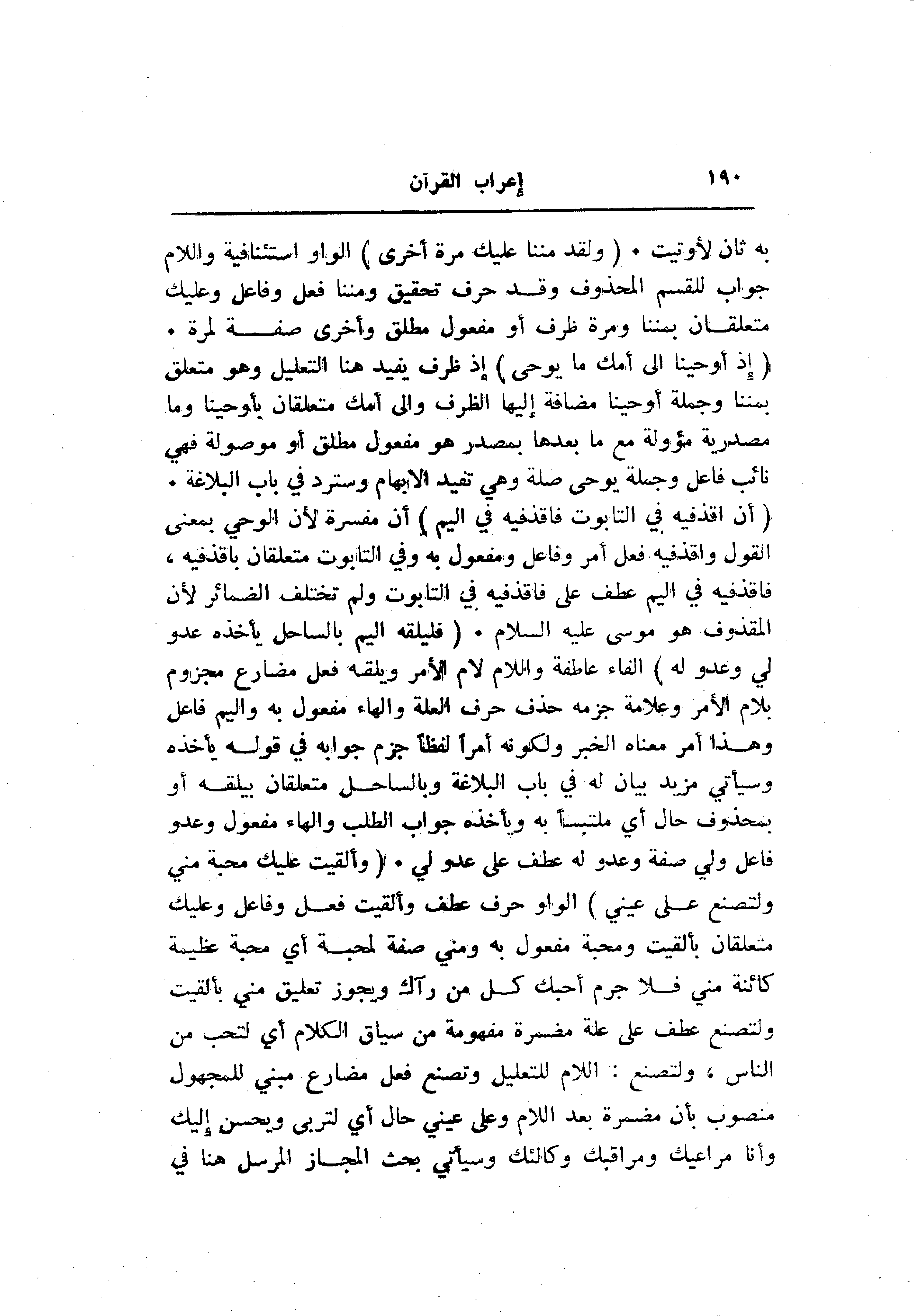 (أَنِ اقْذِفِيهِ فِي التَّابُوتِ فَاقْذِفِيهِ فِي الْيَمِّ) أن مفسرة لأن الوحي بمعنى القول واقذفيه فعل أمر وفاعل ومفعول به وفي التابوت متعلقان باقذفيه، فاقذفيه في اليم عطف على فاقذفيه في التابوت ولم تختلف الضمائر لأن المقذوف هو موسى عليه السلام. (فَلْيُلْقِهِ الْيَمُّ بِالسَّاحِلِ يَأْخُذْهُ عَدُوٌّ لِي وَعَدُوٌّ لَهُ) الفاء عاطفة واللام لام الأمر ويلقه فعل مضارع مجزوم بلام الأمر وعلامة جزمه حذف حرف العلة والهاء مفعول به واليم فاعل وهذا أمر معناه الخبر ولكونه أمرا لفظا جزم جوابه في قوله يأخذه وسيأتي مزيد بيان له في باب البلاغة وبالساحل متعلقان بيلقه أو بمحذوف حال أي ملتبسا به ويأخذه جواب الطلب والهاء مفعول وعدو فاعل ولي صفة وعدو له عطف على عدو لي. (وَأَلْقَيْتُ عَلَيْكَ مَحَبَّةً مِنِّي وَلِتُصْنَعَ عَلى عَيْنِي) الواو حرف عطف وألقيت فعل وفاعل وعليك متعلقان بألقيت ومحبة مفعول به ومني صفة لمحبة أي محبة عظيمة كائنة مني فلا جرم أحبك كل من رآك ويجوز تعليق مني بألقيت ولتصنع عطف على علة مضمرة مفهومة من سياق الكلام أي لتحب من الناس، ولتصنع: اللام للتعليل وتصنع فعل مضارع مبني للمجهول منصوب بأن مضمرة بعد اللام وعلى عيني حال أي لتربى ويحسن إليك وأنا مراعيك ومراقبك وكالئك وسيأتي بحث المجاز المرسل هنا في