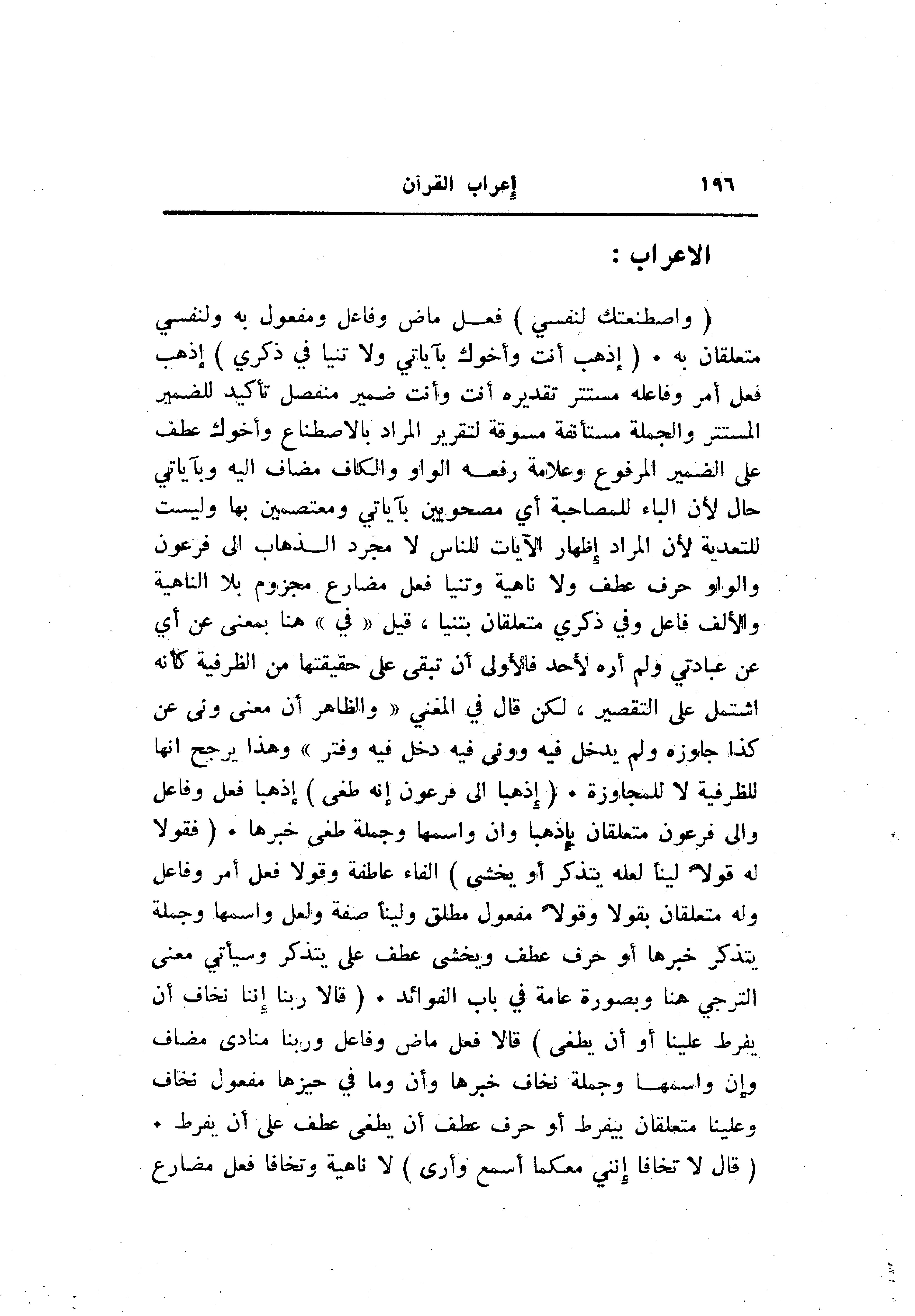 (وَاصْطَنَعْتُكَ لِنَفْسِي) فعل ماض وفاعل ومفعول به ولنفسي متعلقان به. (اذْهَبْ أَنْتَ وَأَخُوكَ بِآياتِي وَلا تَنِيا فِي ذِكْرِي) اذهب فعل أمر وفاعله مستتر تقديره أنت وأنت ضمير منفصل تأكيد للضمير المستتر والجملة مستأنفة مسوقة لتقرير المراد بالاصطناع وأخوك عطف على الضمير المرفوع وعلامة رفعه الواو والكاف مضاف اليه وبآياتي حال لأن الباء للمصاحبة أي مصحوبين بآياتي ومعتصمين بها وليست للتعدية لأن المراد إظهار الآيات للناس لا مجرد الذهاب الى فرعون والواو حرف عطف ولا ناهية وتنيا فعل مضارع مجزوم بلا الناهية والألف فاعل وفي ذكري متعلقان بتنيا، قيل «في» هنا بمعنى عن أي عن عبادتي ولم أره لأحد فالأولى أن تبقى على حقيقتها من الظرفية كأنه اشتمل على التقصير، لكن قال في المغني «والظاهر أن معنى ونى عن كذا جاوزه ولم يدخل فيه وونى فيه دخل فيه وفتر» وهذا يرجح انها للظرفية لا للمجاوزة. (اذْهَبا إِلى فِرْعَوْنَ إِنَّهُ طَغى) اذهبا فعل وفاعل والى فرعون متعلقان باذهبا وان واسمها وجملة طغى خبرها. (فَقُولا لَهُ قَوْلًا لَيِّناً لَعَلَّهُ يَتَذَكَّرُ أَوْ يَخْشى) الفاء عاطفة وقولا فعل أمر وفاعل وله متعلقان بقولا وقولا مفعول مطلق ولينا صفة ولعل واسمها وجملة يتذكر خبرها أو حرف عطف ويخشى عطف على يتذكر وسيأتي معنى الترجي هنا وبصورة عامة في باب الفوائد. (قالا رَبَّنا إِنَّنا نَخافُ أَنْ يَفْرُطَ عَلَيْنا أَوْ أَنْ يَطْغى) قالا فعل ماض وفاعل وربنا منادى مضاف وإن واسمها وجملة نخاف خبرها وأن وما في حيزها مفعول نخاف وعلينا متعلقان بيفرط أو حرف عطف أن يطغى عطف على أن يفرط.