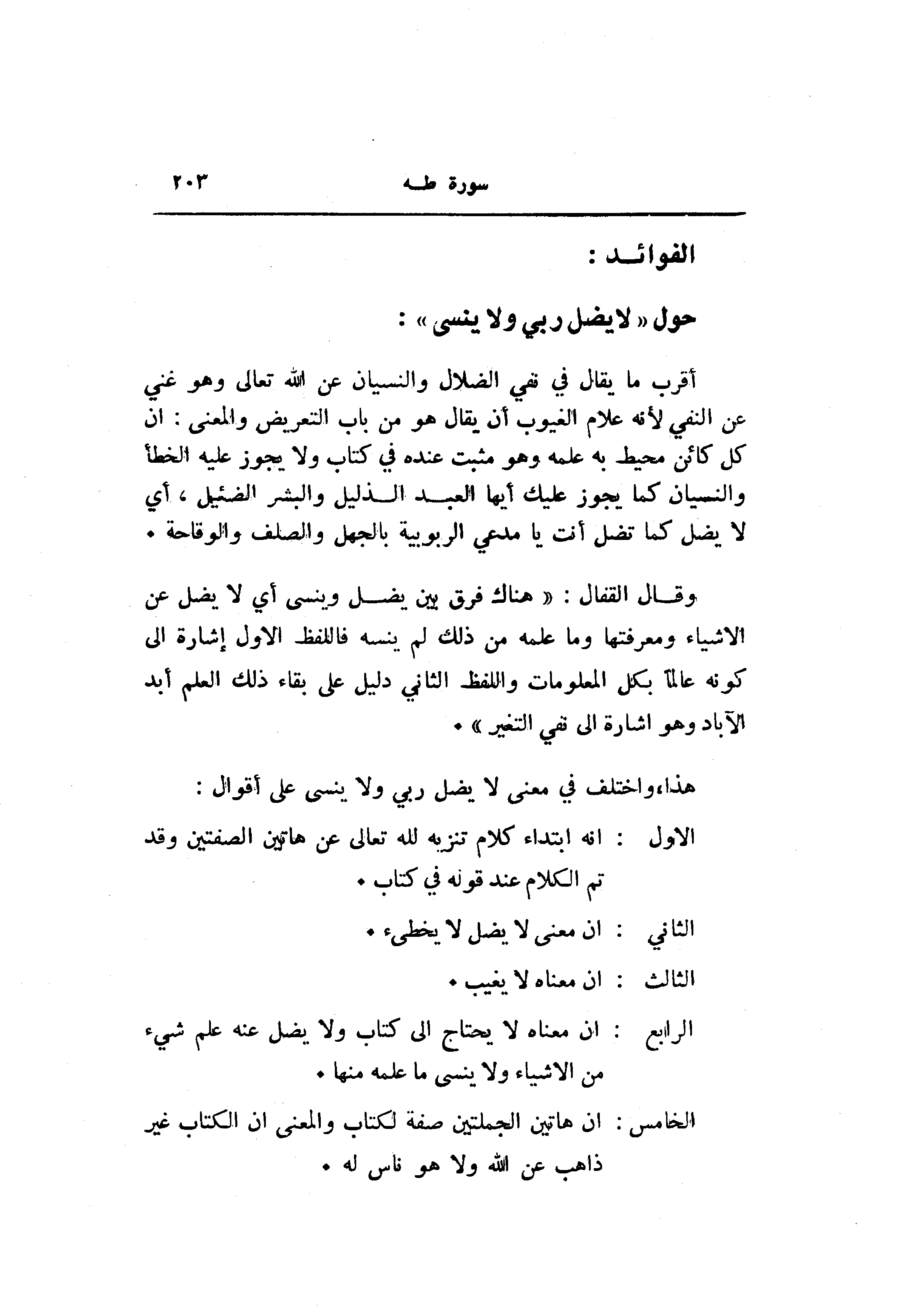 وقال القفال: «هناك فرق بين يضل وينسى أي لا يضل عن الأشياء ومعرفتها وما علمه من ذلك لم ينسه فاللفظ الاول إشارة الى كونه عالما بكل المعلومات واللفظ الثاني دليل على بقاء ذلك العلم أبد الآباد وهو اشارة الى نفي التغير» .