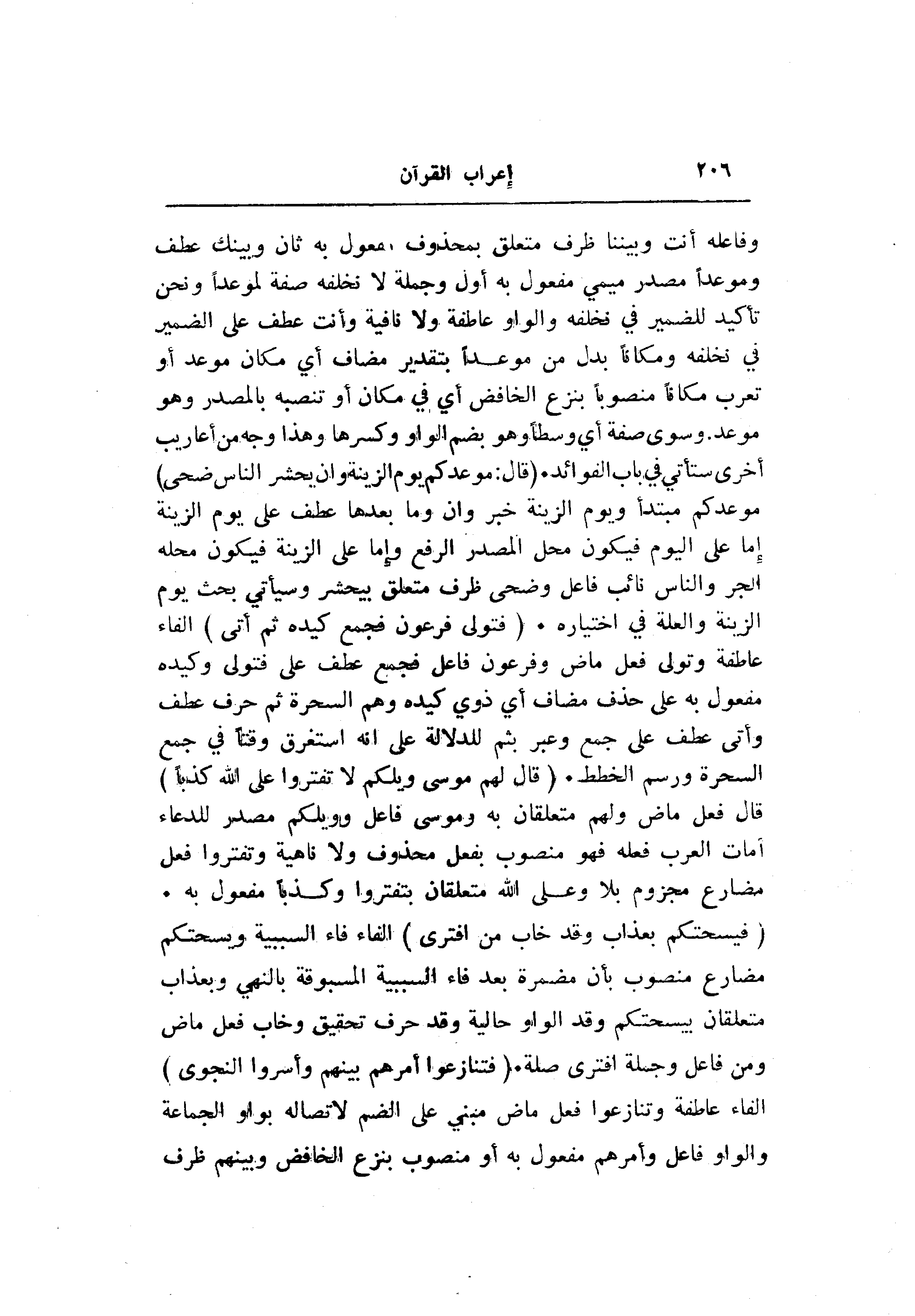 وفاعله أنت وبيننا ظرف متعلق بمحذوف مفعول به ثان وبينك عطف وموعدا مصدر ميمي مفعول به أول وجملة لا نخلفه صفة لموعدا ونحن تأكيد للضمير في نخلفه والواو عاطفة ولا نافية وأنت عطف على الضمير في نخلفه ومكانا بدل من موعدا بتقدير مضاف أي مكان موعد أو تعرب مكانا منصوبا بنزع الخافض أي في مكان أو تنصبه بالمصدر وهو موعد وسوى صفة أي وسطا وهو بضم الواو وكسرها وهذا وجه من أعاريب أخرى ستأتي في باب الفوائد. (قالَ: مَوْعِدُكُمْ يَوْمُ الزِّينَةِ وَأَنْ يُحْشَرَ النَّاسُ ضُحًى) موعدكم مبتدأ ويوم الزينة خبر وان وما بعدها عطف على يوم الزينة إما على اليوم فيكون محل المصدر الرفع وإما على الزينة فيكون محله الجر والناس نائب فاعل وضحى ظرف متعلق بيحشر وسيأتي بحث يوم الزينة والعلة في اختياره. (فَتَوَلَّى فِرْعَوْنُ فَجَمَعَ كَيْدَهُ ثُمَّ أَتى) الفاء عاطفة وتولى فعل ماض وفرعون فاعل فجمع عطف على فتولى وكيده مفعول به على حذف مضاف أي ذوي كيده وهم السحرة ثم حرف عطف وأتى عطف على جمع وعبر بثم للدلالة على انه استغرق وقتا في جمع السحرة ورسم الخطط. (قالَ لَهُمْ مُوسى وَيْلَكُمْ لا تَفْتَرُوا عَلَى اللَّهِ كَذِباً) قال فعل ماض ولهم متعلقان به وموسى فاعل وويلكم مصدر للدعاء أمات العرب فعله فهو منصوب بفعل محذوف ولا ناهية وتفتروا فعل مضارع مجزوم بلا وعلى الله متعلقان بتفتروا وكذبا مفعول به.