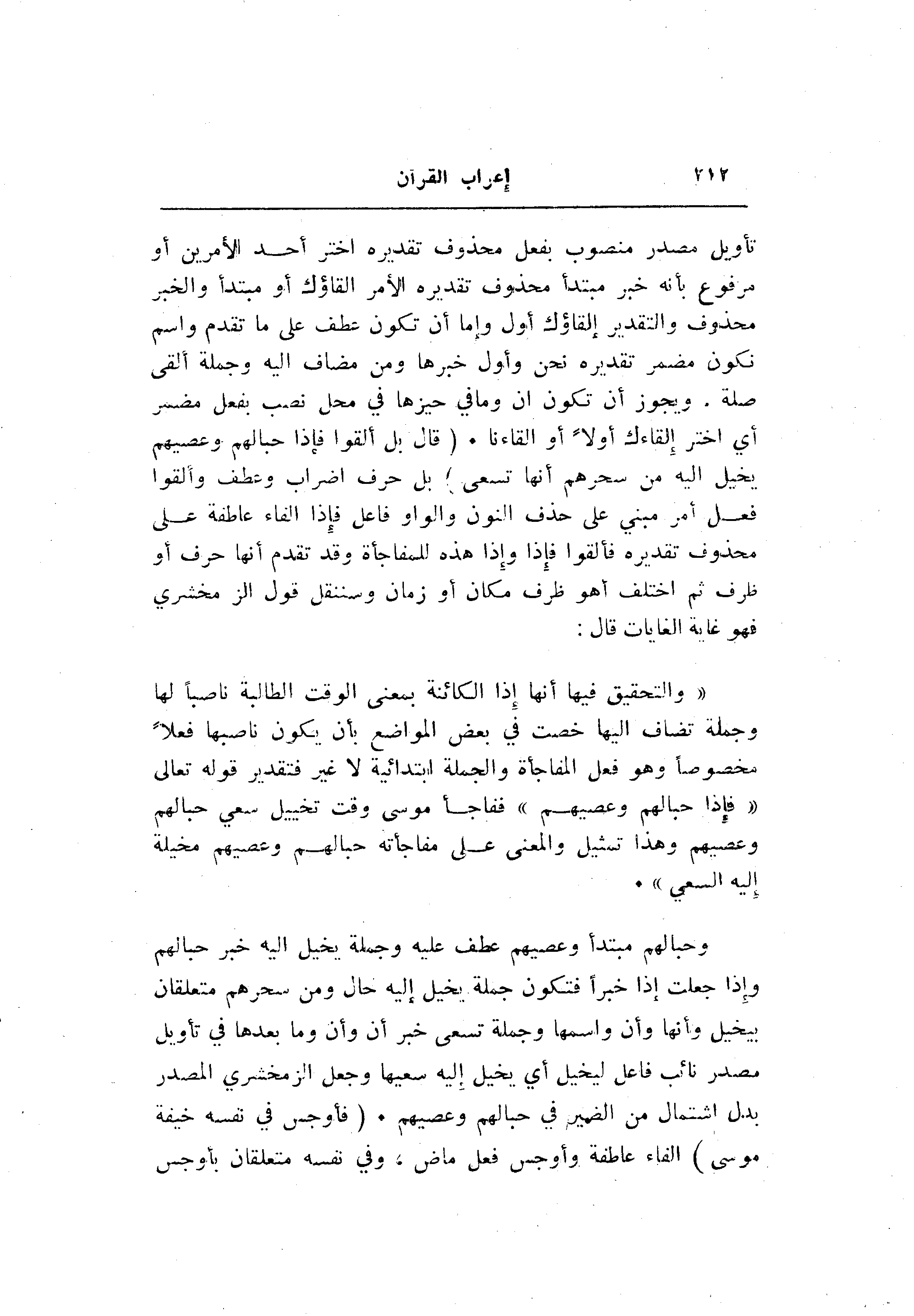 «والتحقيق فيها أنها إذا الكائنة بمعنى الوقت الطالبة ناصبا لها وجملة تضاف إليها خصت في بعض المواضع بأن يكون ناصبها فعلا مخصوصا وهو فعل المفاجأة والجملة ابتدائية لا غير فتقدير قوله تعالى «فَإِذا حِبالُهُمْ وَعِصِيُّهُمْ» ففاجأ موسى وقت تخييل سعي حبالهم وعصيهم وهذا تمثيل والمعنى على مفاجأته حبالهم وعصيهم مخيلة إليه السعي» .
