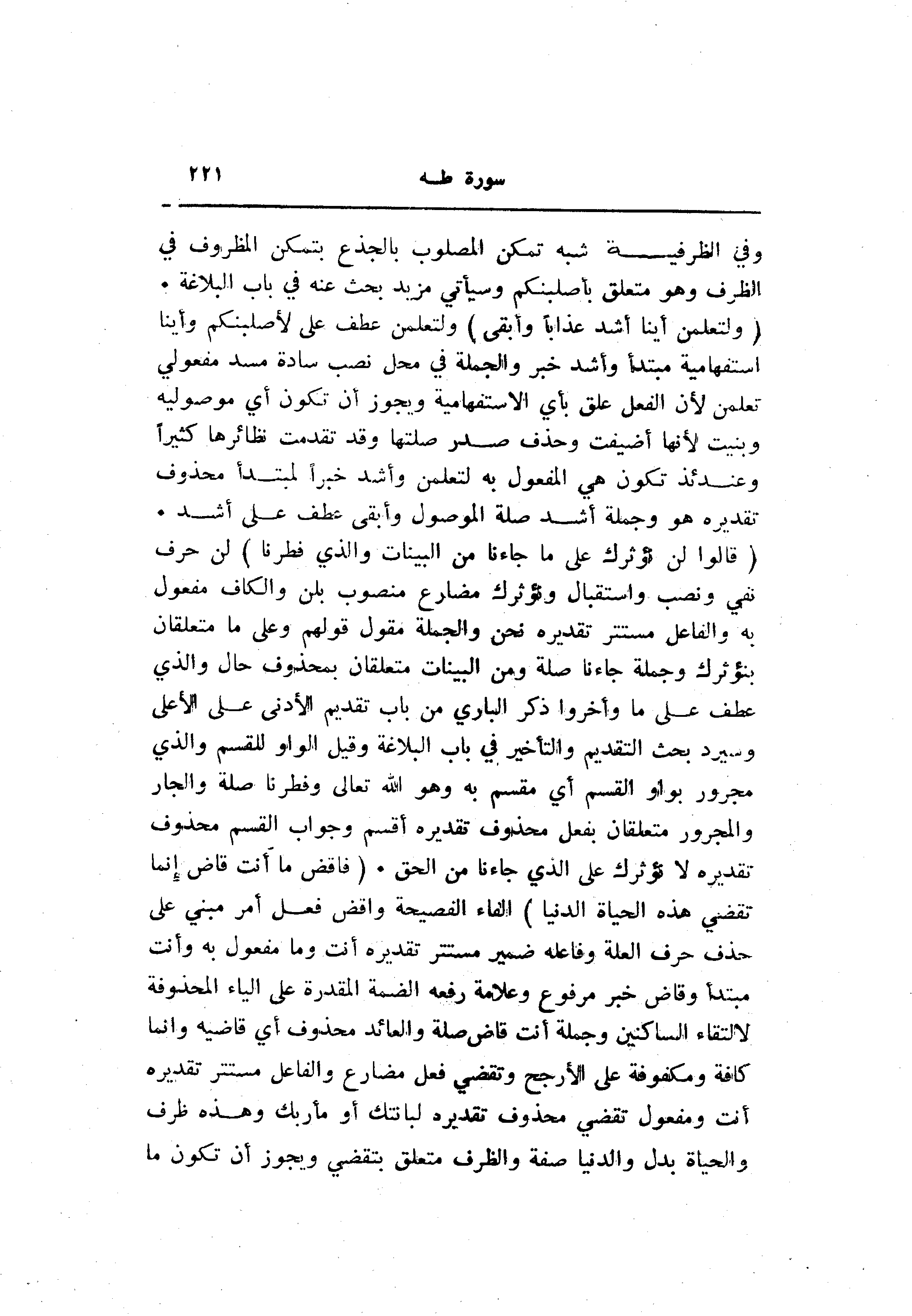 (قالُوا لَنْ نُؤْثِرَكَ عَلى ما جاءَنا مِنَ الْبَيِّناتِ وَالَّذِي فَطَرَنا) لن حرف نفي ونصب واستقبال ونؤثرك مضارع منصوب بلن والكاف مفعول به والفاعل مستتر تقديره نحن والجملة مقول قولهم وعلى ما متعلقان بنؤثرك وجملة جاءنا صلة ومن البينات متعلقان بمحذوف حال والذي عطف على ما وأخروا ذكر الباري من باب تقديم الأدنى على الأعلى وسيرد بحث التقديم والتأخير في باب البلاغة وقيل الواو للقسم والذي مجرور بواو القسم أي مقسم به وهو الله تعالى وفطرنا صلة والجار والمجرور متعلقان بفعل محذوف تقديره أقسم وجواب القسم محذوف تقديره لا نؤثرك على الذي جاءنا من الحق. (فَاقْضِ ما أَنْتَ قاضٍ إِنَّما تَقْضِي هذِهِ الْحَياةَ الدُّنْيا) الفاء الفصيحة واقض فعل أمر مبني على حذف حرف العلة وفاعله ضمير مستتر تقديره أنت وما مفعول به وأنت مبتدأ وقاض خبر مرفوع وعلامة رفعه الضمة المقدرة على الياء المحذوفة لالتقاء الساكنين وجملة أنت قاض صلة والعائد محذوف أي قاضيه وانما كافة ومكفوفة على الأرجح وتقضي فعل مضارع والفاعل مستتر تقديره أنت ومفعول تقضي محذوف تقديره لبانتك أو مأربك وهذه ظرف والحياة بدل والدنيا صفة والظرف متعلق بتقضي ويجوز أن تكون ما