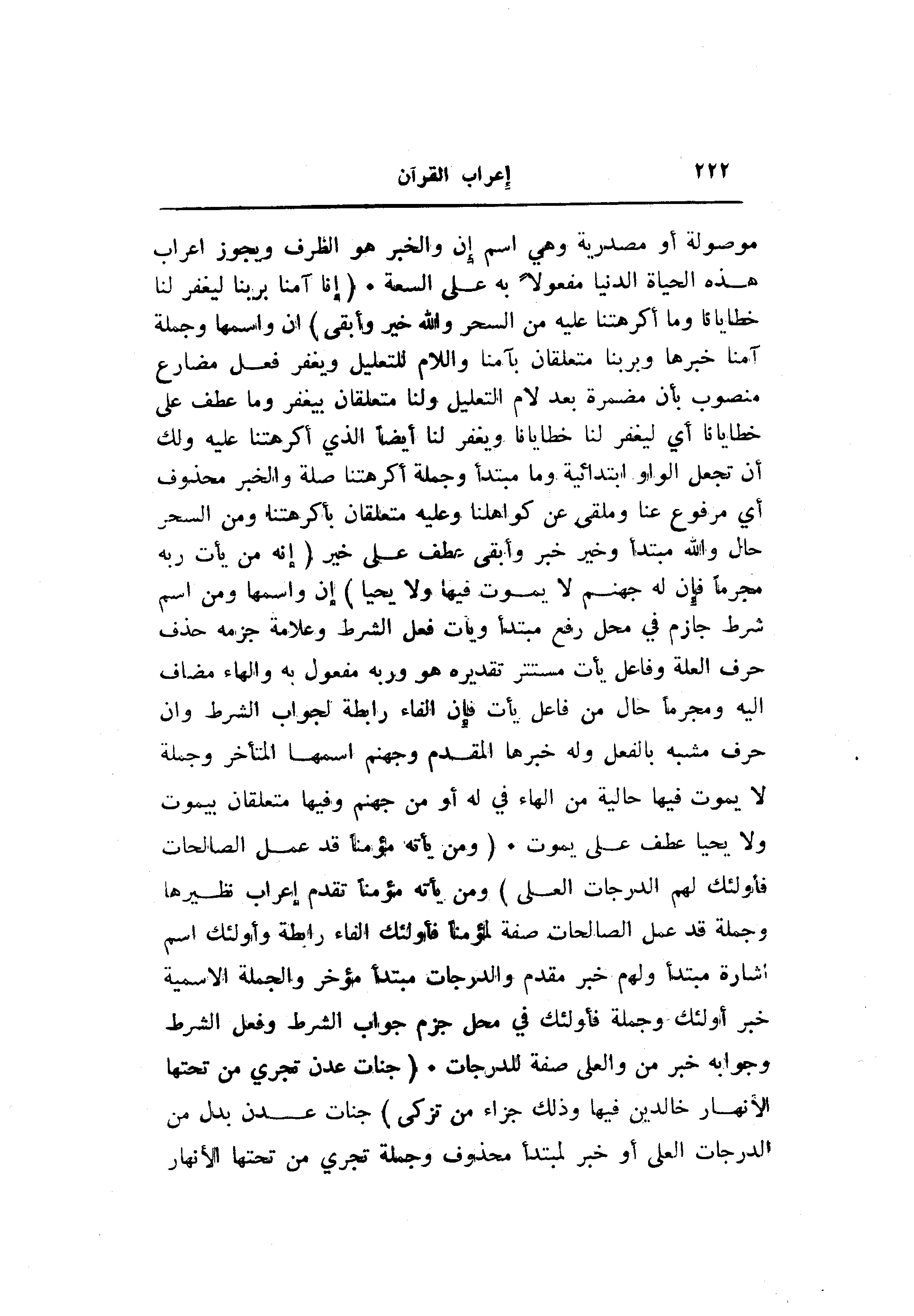 موصولة أو مصدرية وهي اسم إن والخبر هو الظرف ويجوز اعراب هذه الحياة الدنيا مفعولا به على السعة. (إِنَّا آمَنَّا بِرَبِّنا لِيَغْفِرَ لَنا خَطايانا وَما أَكْرَهْتَنا عَلَيْهِ مِنَ السِّحْرِ وَاللَّهُ خَيْرٌ وَأَبْقى) ان واسمها وجملة آمنا خبرها وبربنا متعلقان بآمنا واللام للتعليل ويغفر فعل مضارع منصوب بأن مضمرة بعد لام التعليل ولنا متعلقان بيغفر وما عطف على خطايانا أي ليغفر لنا خطايانا ويغفر لنا أيضا الذي أكرهتنا عليه ولك أن تجعل الواو ابتدائية وما مبتدأ وجملة أكرهتنا صلة والخبر محذوف أي مرفوع عنا وملقى عن كواهلنا وعليه متعلقان بأكرهتنا ومن السحر حال والله مبتدأ وخير خبر وأبقى عطف على خير (إِنَّهُ مَنْ يَأْتِ رَبَّهُ مُجْرِماً فَإِنَّ لَهُ جَهَنَّمَ لا يَمُوتُ فِيها وَلا يَحْيى) إن واسمها ومن اسم شرط جازم في محل رفع مبتدأ ويأت فعل الشرط وعلامة جزمه حذف حرف العلة وفاعل يأت مستتر تقديره هو وربه مفعول به والهاء مضاف اليه ومجرما حال من فاعل يأت فإن الفاء رابطة لجواب الشرط وان حرف مشبه بالفعل وله خبرها المقدم وجهنم اسمها المتأخر وجملة لا يموت فيها حالية من الهاء في له أو من جهنم وفيها متعلقان بيموت ولا يحيا عطف على يموت. (وَمَنْ يَأْتِهِ مُؤْمِناً قَدْ عَمِلَ الصَّالِحاتِ فَأُولئِكَ لَهُمُ الدَّرَجاتُ الْعُلى) ومن يأته مؤمنا تقدم إعراب نظيرها وجملة قد عمل الصالحات صفة لمؤمنا فأولئك الفاء رابطة وأولئك اسم اشارة مبتدأ ولهم خبر مقدم والدرجات مبتدأ مؤخر والجملة الاسمية خبر أولئك وجملة فأولئك في محل جزم جواب الشرط وفعل الشرط وجوابه خبر من والعلى صفة للدرجات. (جَنَّاتُ عَدْنٍ تَجْرِي مِنْ تَحْتِهَا الْأَنْهارُ خالِدِينَ فِيها وَذلِكَ جَزاءُ مَنْ تَزَكَّى) جنات عدن بدل من الدرجات العلى أو خبر لمبتدأ محذوف وجملة تجري من تحتها الأنهار