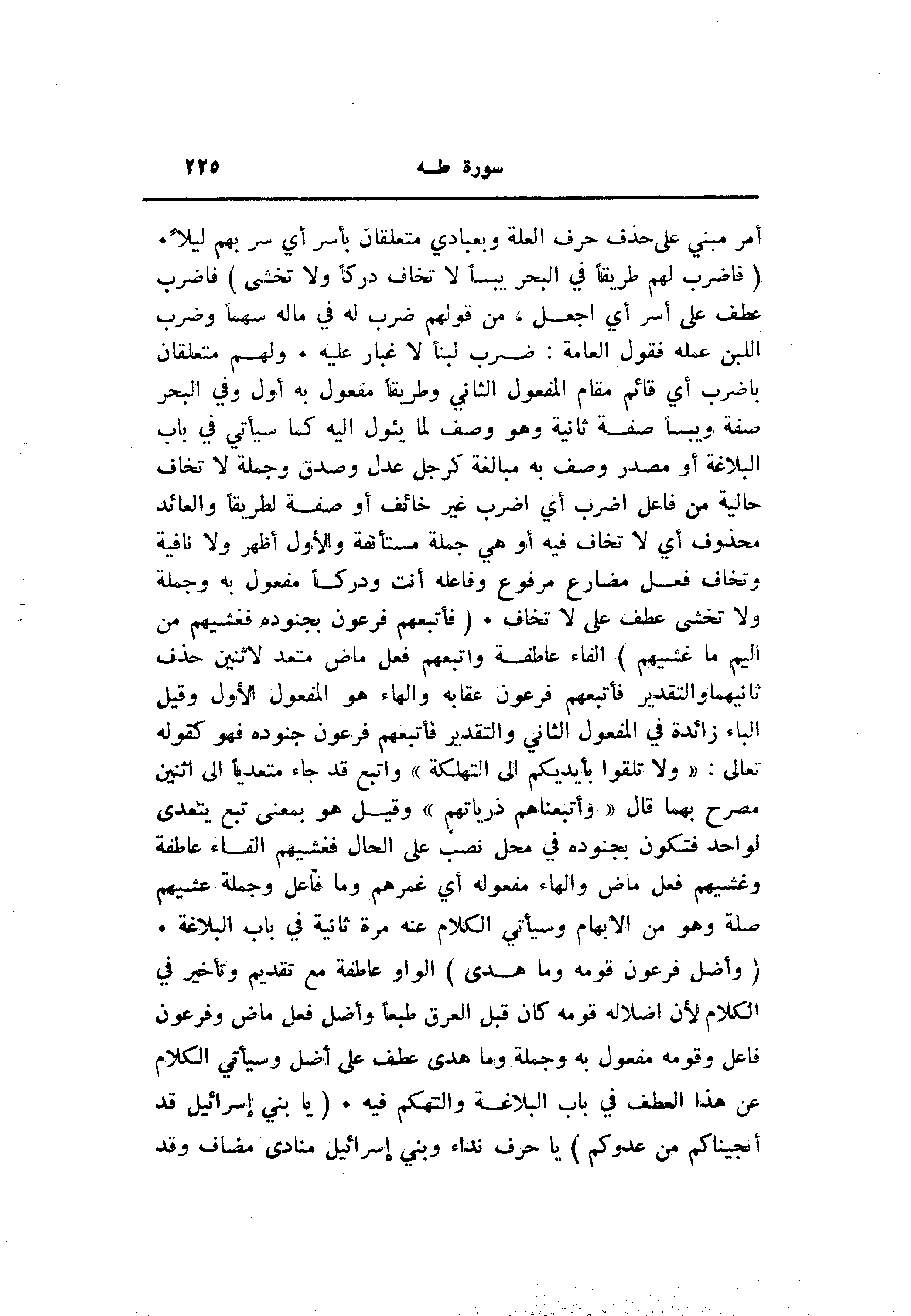 (فَاضْرِبْ لَهُمْ طَرِيقاً فِي الْبَحْرِ يَبَساً لا تَخافُ دَرَكاً وَلا تَخْشى) فاضرب عطف على أسر أي اجعل، من قولهم ضرب له في ماله سهما وضرب اللبن عمله فقول العامة: ضرب لبنا لا غبار عليه. ولهم متعلقان باضرب أي قائم مقام المفعول الثاني وطريقا مفعول به أول وفي البحر صفة ويبسا صفة ثانية وهو وصف لما يئول اليه كما سيأتي في باب البلاغة أو مصدر وصف به مبالغة كرجل عدل وصدق وجملة لا تخاف حالية من فاعل اضرب أي اضرب غير خائف أو صفة لطريقا والعائد محذوف أي لا تخاف فيه أو هي جملة مستأنفة والأول أظهر ولا نافية وتخاف فعل مضارع مرفوع وفاعله أنت ودركا مفعول به وجملة ولا تخشى عطف على لا تخاف. (فَأَتْبَعَهُمْ فِرْعَوْنُ بِجُنُودِهِ فَغَشِيَهُمْ مِنَ الْيَمِّ ما غَشِيَهُمْ) الفاء عاطفة واتبعهم فعل ماض متعد لاثنين حذف ثانيهما والتقدير فأتبعهم فرعون عقابه والهاء هو المفعول الأول وقيل الباء زائدة في المفعول الثاني والتقدير فأتبعهم فرعون جنوده فهو كقوله تعالى: «وَلا تُلْقُوا بِأَيْدِيكُمْ إِلَى التَّهْلُكَةِ» واتبع قد جاء متعديا الى اثنين مصرح بهما قال «وَأَتْبَعْناهُمْ ذرياتهم» وقيل هو بمعنى تبع يتعدى لواحد فتكون بجنوده في محل نصب على الحال فغشيهم الفاء عاطفة وغشيهم فعل ماض والهاء مفعوله أي غمرهم وما فاعل وجملة عشيهم صلة وهو من الإبهام وسيأتي الكلام عنه مرة ثانية في باب البلاغة.