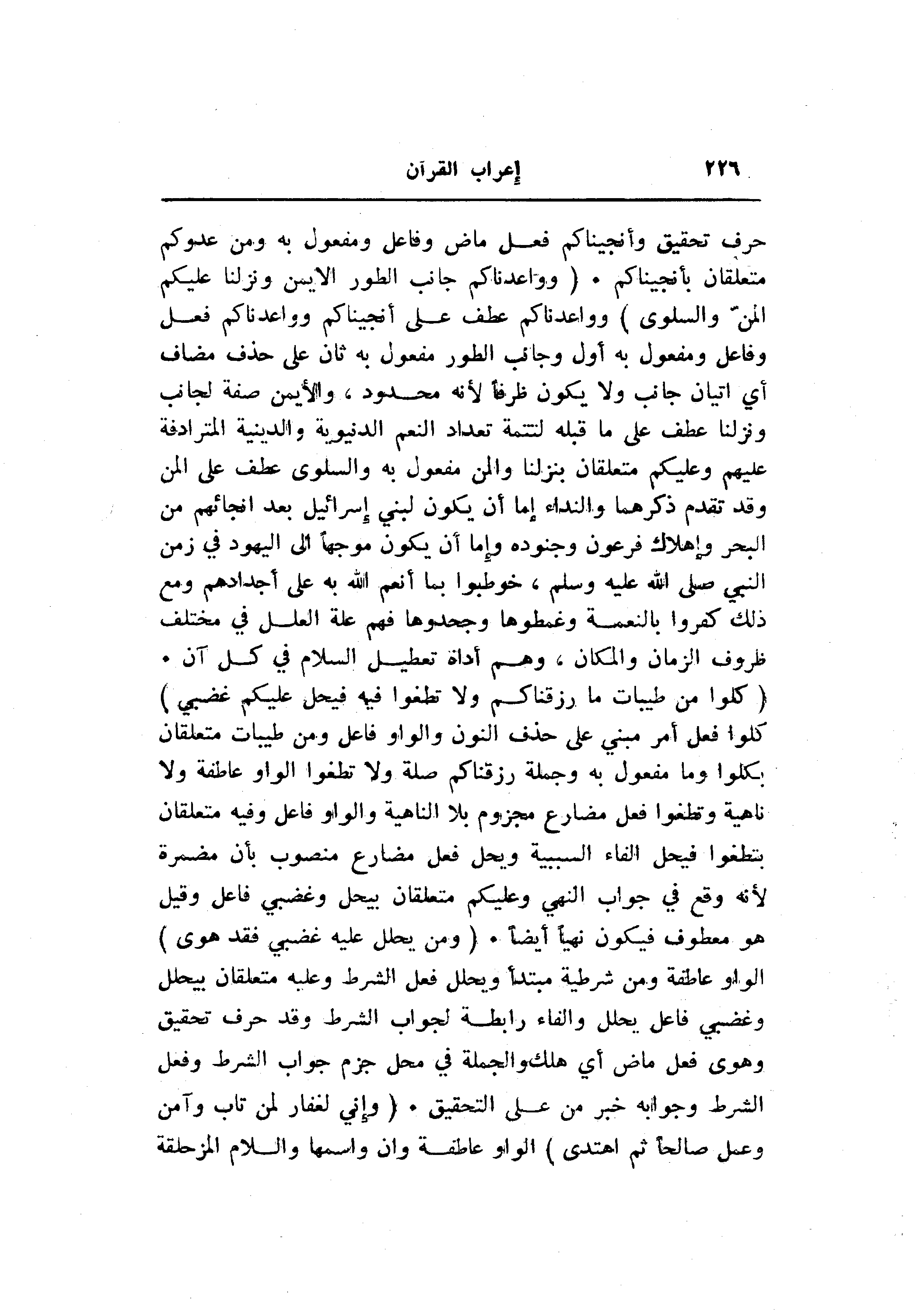 حرف تحقيق وأنجيناكم فعل ماض وفاعل ومفعول به ومن عدوكم متعلقان بأنجيناكم. (وَواعَدْناكُمْ جانِبَ الطُّورِ الْأَيْمَنَ وَنَزَّلْنا عَلَيْكُمُ الْمَنَّ وَالسَّلْوى) وواعدناكم عطف على أنجيناكم وواعدناكم فعل وفاعل ومفعول به أول وجانب الطور مفعول به ثان على حذف مضاف أي إتيان جانب ولا يكون ظرفا لأنه محدود، والأيمن صفة لجانب ونزلنا عطف على ما قبله لتتمة تعداد النعم الدنيوية والدينية المترادفة عليهم وعليكم متعلقان بنزلنا والمن مفعول به والسلوى عطف على المن وقد تقدم ذكرهما والنداء إما أن يكون لبني إسرائيل بعد انجائهم من البحر وإهلاك فرعون وجنوده وإما أن يكون موجها الى اليهود في زمن النبي صلى الله عليه وسلم، خوطبوا بما أنعم الله به على أجدادهم ومع ذلك كفروا بالنعمة وغمطوها وجحدوها فهم علة العلل في مختلف ظروف الزمان والمكان، وهم أداة تعطيل السلام في كل آن.