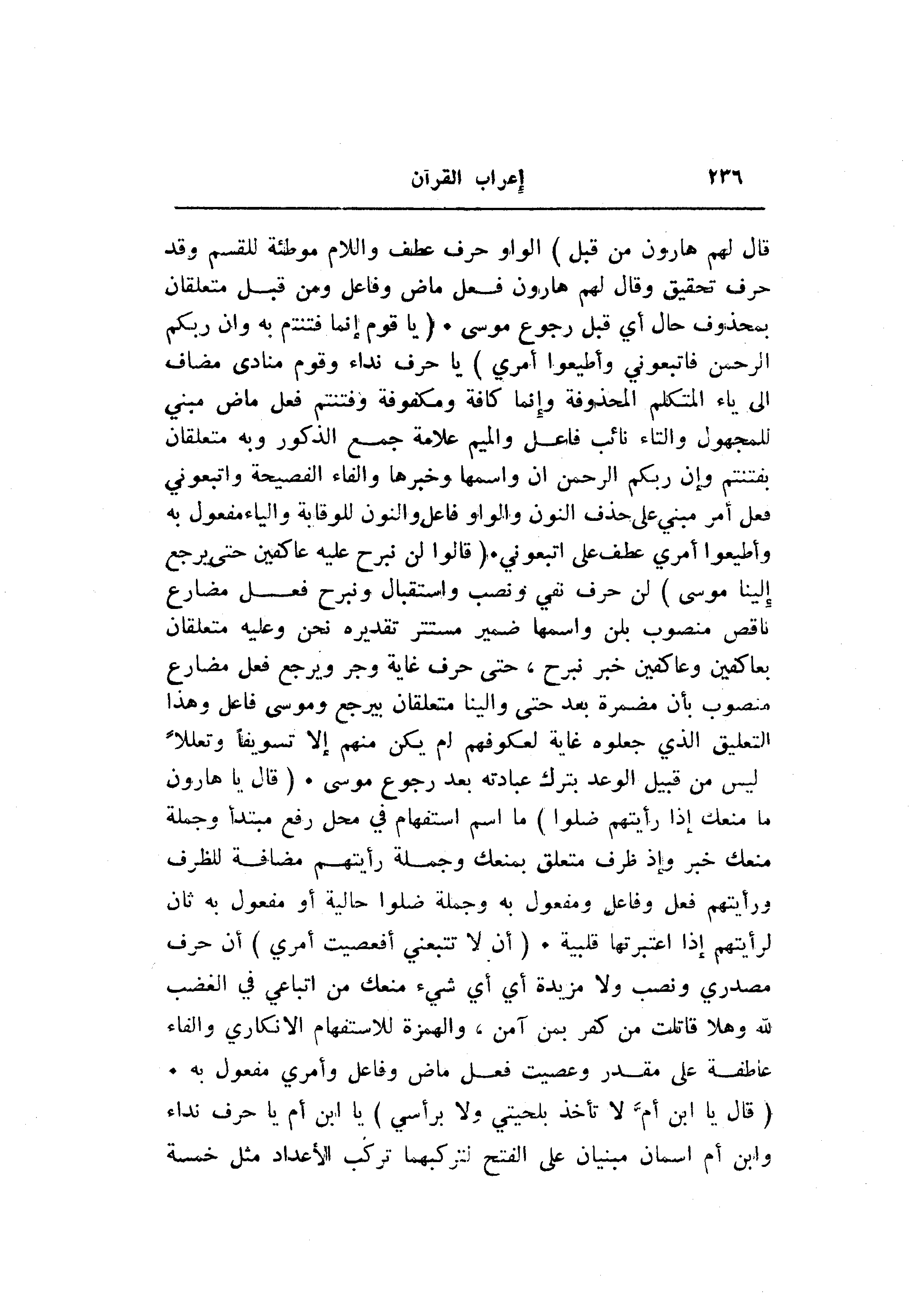 الواو حرف عطف واللام موطئة للقسم وقد حرف تحقيق وقال لهم هارون فعل ماض وفاعل ومن قبل متعلقان بمحذوف حال أي قبل رجوع موسى. (يا قَوْمِ إِنَّما فُتِنْتُمْ بِهِ وَإِنَّ رَبَّكُمُ الرَّحْمنُ فَاتَّبِعُونِي وَأَطِيعُوا أَمْرِي) يا حرف نداء وقوم منادى مضاف الى ياء المتكلم المحذوفة وإنما كافة ومكفوفة وفتنتم فعل ماض مبني للمجهول والتاء نائب فاعل والميم علامة جمع الذكور وبه متعلقان بفتنتم وإن ربكم الرحمن ان واسمها وخبرها والفاء الفصيحة واتبعوني فعل أمر مبني على حذف النون والواو فاعل والنون للوقاية والياء مفعول به وأطيعوا أمري عطف على اتبعوني. (قالُوا لَنْ نَبْرَحَ عَلَيْهِ عاكِفِينَ حَتَّى يَرْجِعَ إِلَيْنا مُوسى) لن حرف نفي ونصب واستقبال ونبرح فعل مضارع ناقص منصوب بلن واسمها ضمير مستتر تقديره نحن وعليه متعلقان بعاكفين وعاكفين خبر نبرح، حتى حرف غاية وجر ويرجع فعل مضارع منصوب بأن مضمرة بعد حتى وإلينا متعلقان بيرجع وموسى فاعل وهذا التعليق الذي جعلوه غاية لعكوفهم أم يكن منهم إلا تسويفا وتعللا ليس من قبيل الوعد بترك عبادته بعد رجوع موسى. (قالَ يا هارُونُ ما مَنَعَكَ إِذْ رَأَيْتَهُمْ ضَلُّوا) ما اسم استفهام في محل رفع مبتدأ وجملة منعك خبر وإذ ظرف متعلق بمنعك وجملة رأيتهم مضافة للظرف ورأيتهم فعل وفاعل ومفعول به وجملة ضلوا حالية أو مفعول به ثان لرأيتهم إذا اعتبرتها قلبية. (أَلَّا تَتَّبِعَنِ أَفَعَصَيْتَ أَمْرِي) أن حرف مصدري ونصب ولا مزيدة أي أي شيء منعك من اتباعي في الغضب لله وهلا قاتلت من كفر بمن آمن، والهمزة للاستفهام الانكاري والفاء عاطفة على مقدر وعصيت فعل ماض وفاعل وأمري مفعول به.