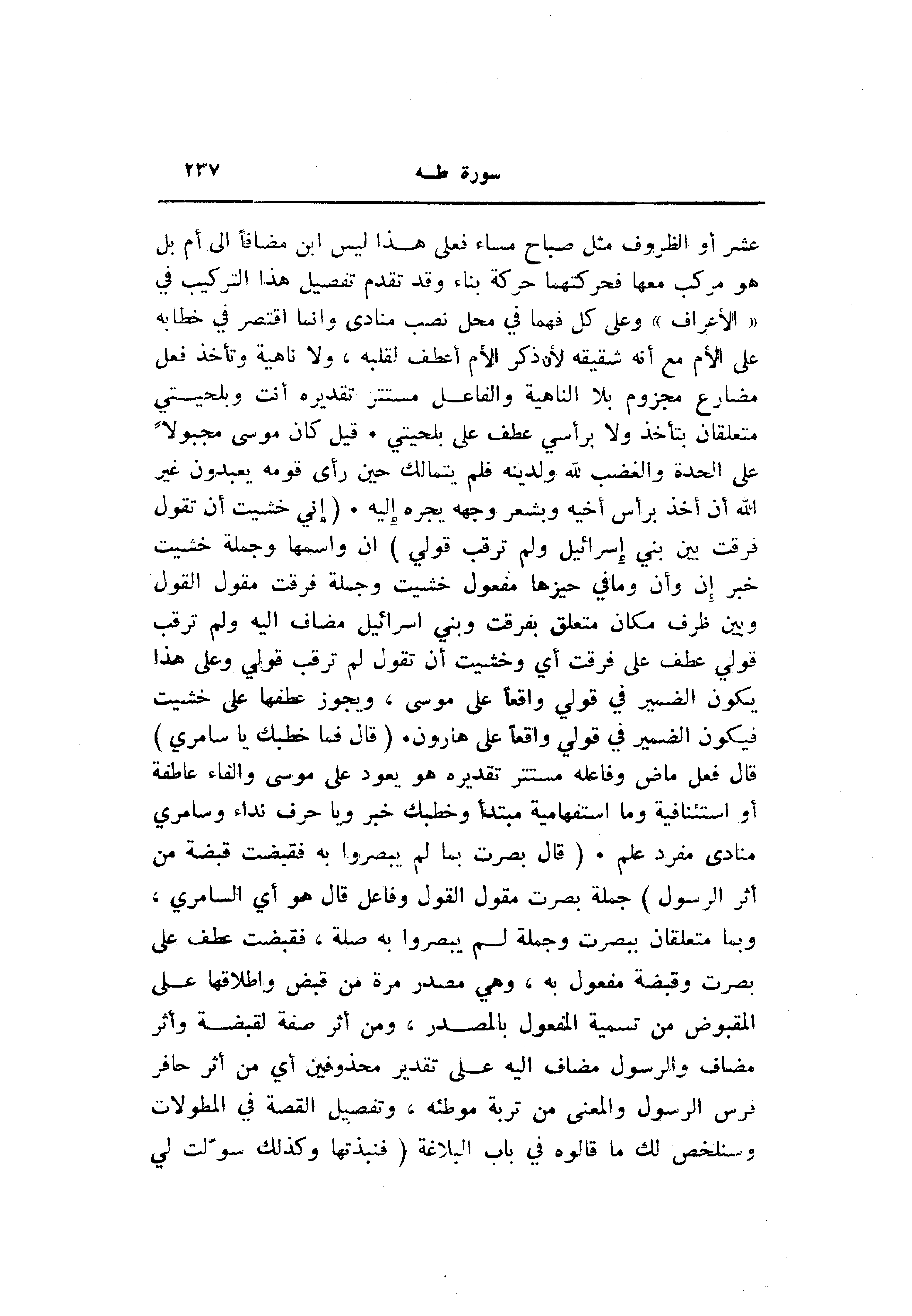 ان واسمها وجملة خشيت خبر إن وأن وما في حيزها مفعول خشيت وجملة فرقت مقول القول وبين ظرف مكان متعلق بفرقت وبني إسرائيل مضاف اليه ولم ترقب قولي عطف على فرقت أي وخشيت أن تقول لم ترقب قولي وعلى هذا يكون الضمير في قولي واقعا على موسى، ويجوز عطفها على خشيت فيكون الضمير في قولي واقعا على هارون. (قالَ فَما خَطْبُكَ يا سامِرِيُّ) قال فعل ماض وفاعله مستتر تقديره هو يعود على موسى والفاء عاطفة أو استئنافية وما استفهامية مبتدأ وخطبك خبر ويا حرف نداء وسامري منادى مفرد علم. (قالَ بَصُرْتُ بِما لَمْ يَبْصُرُوا بِهِ فَقَبَضْتُ قَبْضَةً مِنْ أَثَرِ الرَّسُولِ) جملة بصرت مقول القول وفاعل قال هو أي السامري، وبما متعلقان ببصرت وجملة لم يبصروا به صلة، فقبضت عطف على بصرت وقبضة مفعول به، وهي مصدر مرة من قبض وإطلاقها على المقبوض من تسمية المفعول بالمصدر، ومن أثر صفة لقبضة وأثر مضاف والرسول مضاف اليه على تقدير محذوفين أي من أثر حافر فرس الرسول والمعنى من تربة موطئه، وتفصيل القصة في المطولات وسنلخص لك ما قالوه في باب البلاغة (فَنَبَذْتُها وَكَذلِكَ سَوَّلَتْ لِي