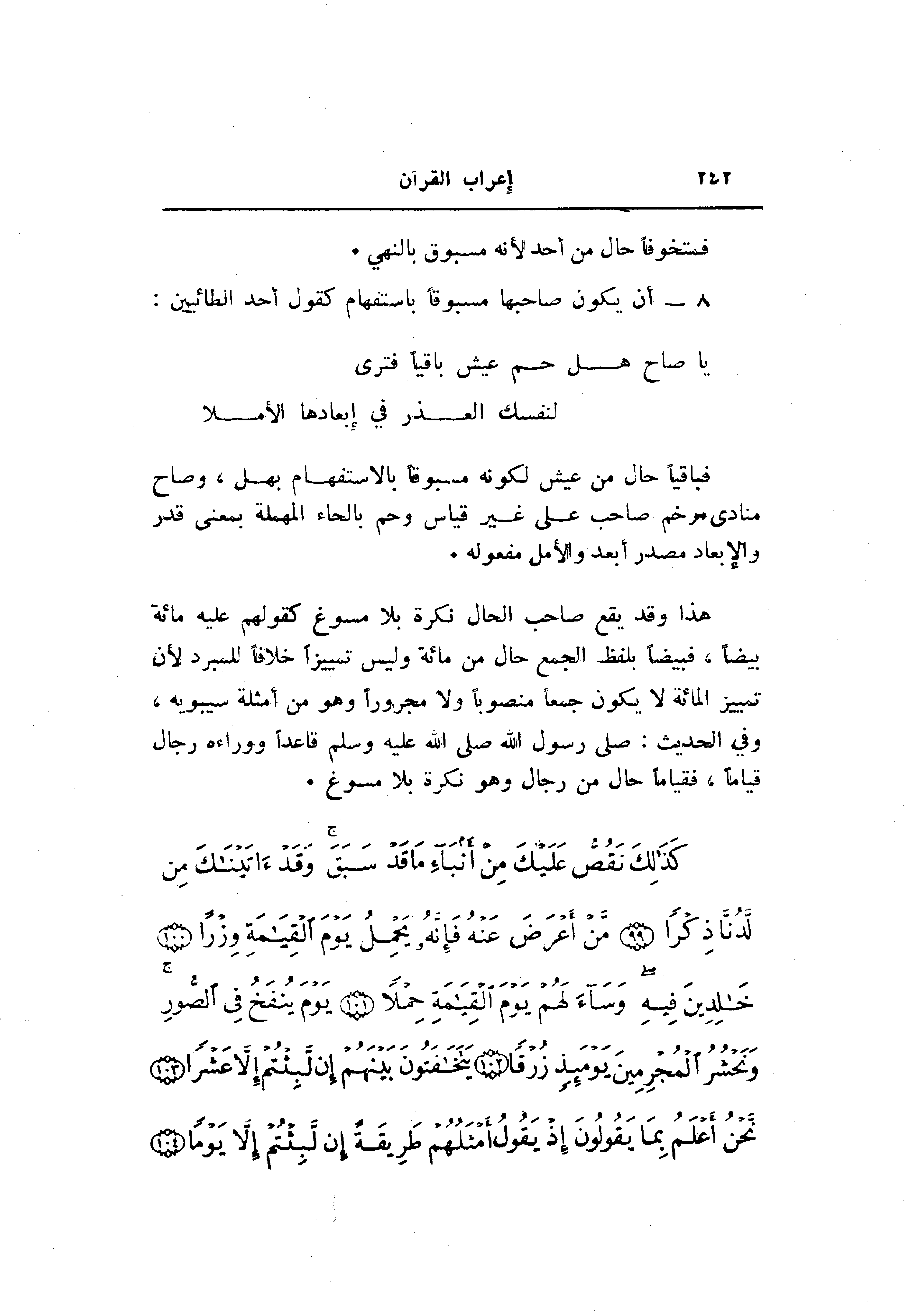 هذا وقد يقع صاحب الحال نكرة بلا مسوغ كقولهم عليه مائة بيضا، فبيضا بلفظ الجمع حال من مائة وليس تمييزا خلافا للمبرد لأن تمييز المائة لا يكون جمعا منصوبا ولا مجرورا وهو من أمثلة سيبويه، وفي الحديث: صلى رسول الله صلى الله عليه وسلم قاعدا ووراءه رجال قياما، فقياما حال من رجال وهو نكرة بلا مسوغ.
