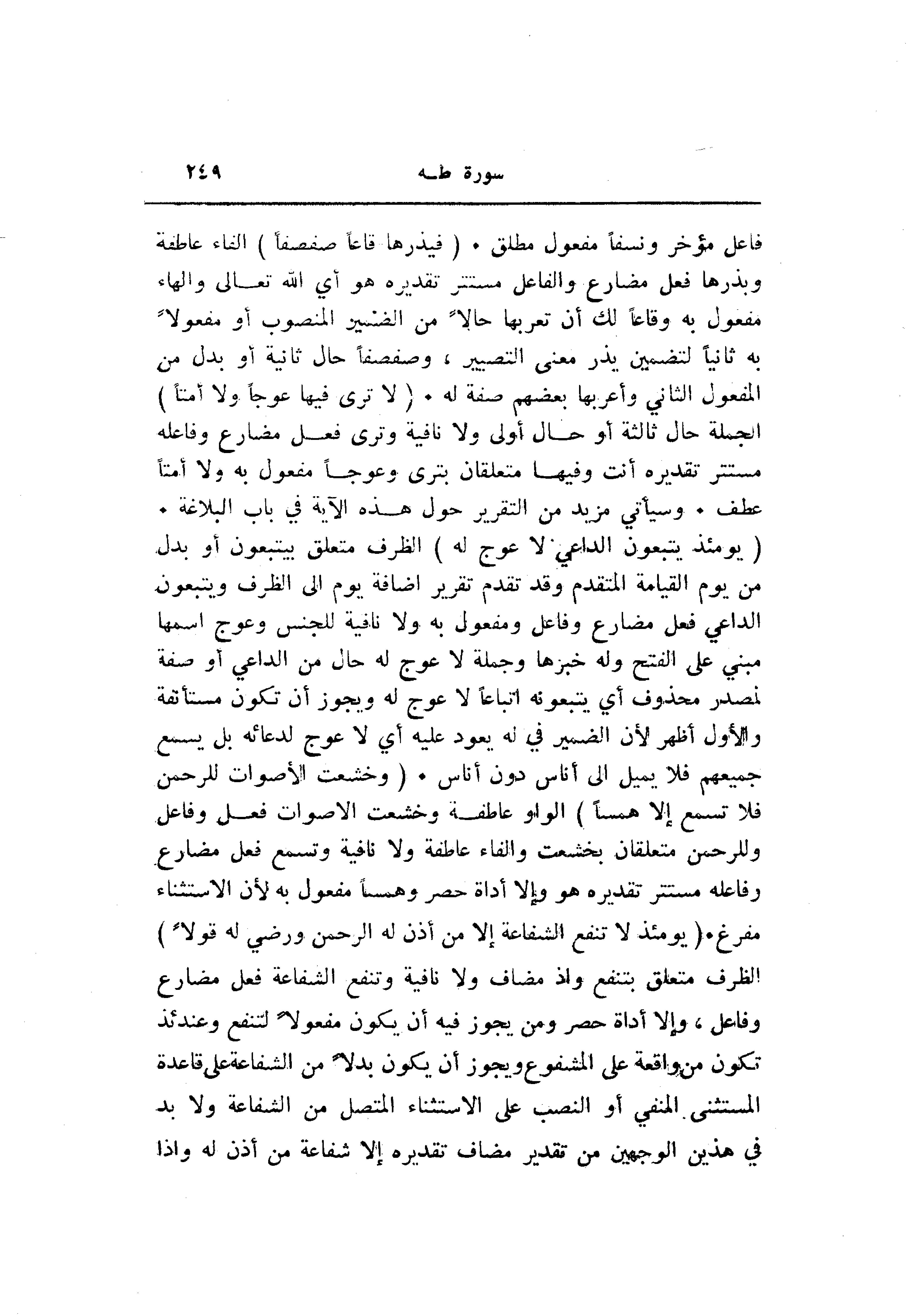 (يَوْمَئِذٍ يَتَّبِعُونَ الدَّاعِيَ لا عِوَجَ لَهُ) الظرف متعلق بيتبعون أو بدل من يوم القيامة المتقدم وقد تقدم تقرير اضافة يوم الى الظرف ويتبعون الداعي فعل مضارع وفاعل ومفعول به ولا نافية للجنس وعوج اسمها مبني على الفتح وله خبرها وجملة لا عوج له حال من الداعي أو صفة لمصدر محذوف أي يتبعونه اتباعا لا عوج له ويجوز أن تكون مستأنفة والأول أظهر لأن الضمير في له يعود عليه أي لا عوج لدعائه بل يسمع جميعهم فلا يميل الى أناس دون أناس. (وَخَشَعَتِ الْأَصْواتُ لِلرَّحْمنِ فَلا تَسْمَعُ إِلَّا هَمْساً) الواو عاطفة وخشعت الأصوات فعل وفاعل وللرحمن متعلقان بخشعت والفاء عاطفة ولا نافية وتسمع فعل مضارع وفاعله مستتر تقديره هو وإلا أداة حصر وهمسا مفعول به لأن الاستثناء مفرغ. (يَوْمَئِذٍ لا تَنْفَعُ الشَّفاعَةُ إِلَّا مَنْ أَذِنَ لَهُ الرَّحْمنُ وَرَضِيَ لَهُ قَوْلًا) الظرف متعلق بتنفع وإذ مضاف ولا نافية وتنفع الشفاعة فعل مضارع وفاعل، وإلا أداة حصر ومن يجوز فيه أن يكون مفعولا لتنفع وعندئذ تكون من واقعة على المشفوع ويجوز أن يكون بدلا من الشفاعة على قاعدة المستثنى المنفي أو النصب على الاستثناء المتصل من الشفاعة ولا بد في هذين الوجهين من تقدير مضاف تقديره إلا شفاعة من أذن له وإذا