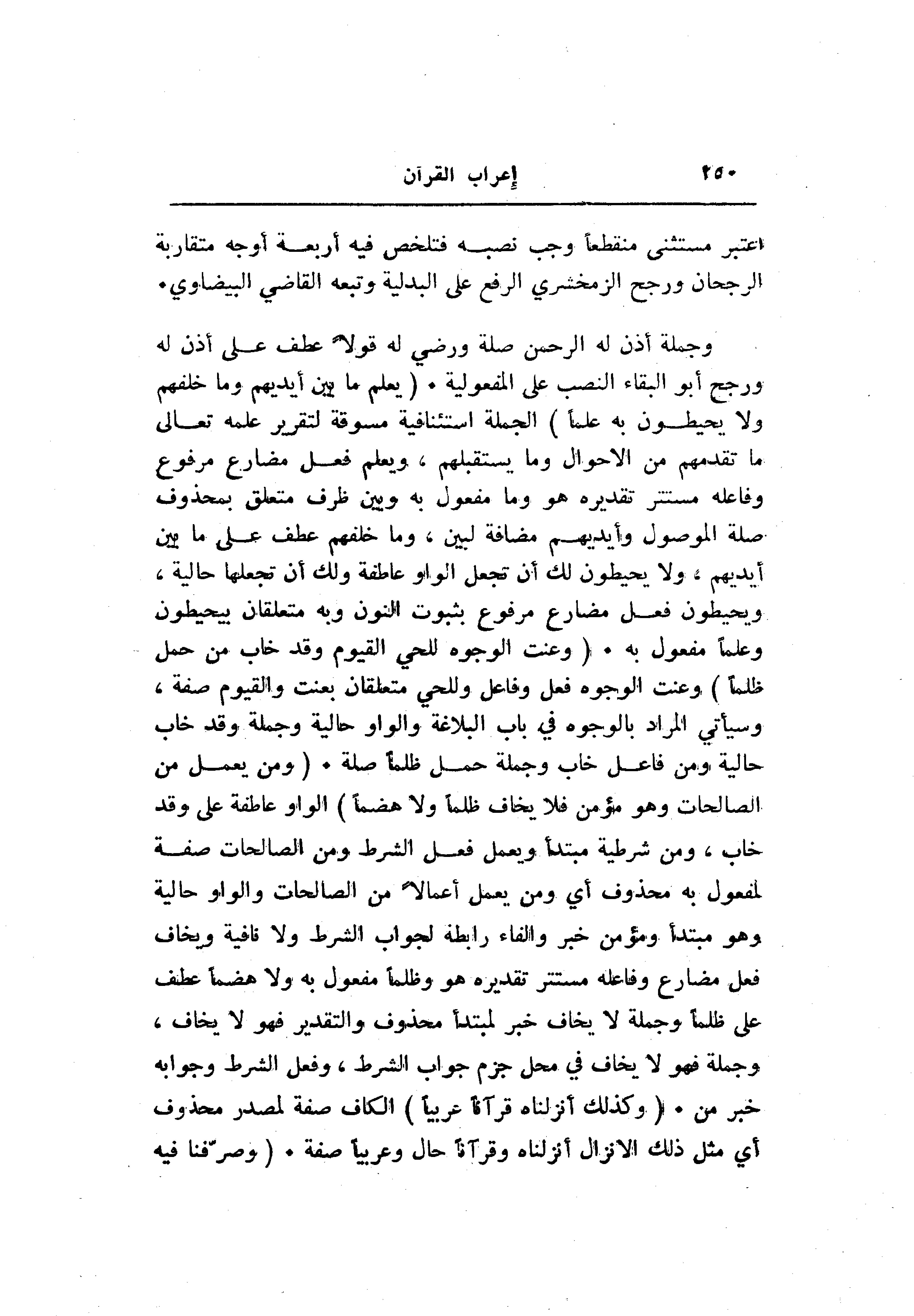 وجملة أذن له الرحمن صلة ورضي له قولا عطف على أذن له ورجح أبو البقاء النصب على المفعولية. (يَعْلَمُ ما بَيْنَ أَيْدِيهِمْ وَما خَلْفَهُمْ وَلا يُحِيطُونَ بِهِ عِلْماً) الجملة استئنافية مسوقة لتقرير علمه تعالى ما تقدمهم من الأحوال وما يستقبلهم، ويعلم فعل مضارع مرفوع وفاعله مستتر تقديره هو وما مفعول به وبين ظرف متعلق بمحذوف صلة الموصول وأيديهم مضافة لبين، وما خلفهم عطف على ما بين أيديهم، ولا يحيطون لك أن تجعل الواو عاطفة ولك أن تجعلها حالية، ويحيطون فعل مضارع مرفوع بثبوت النون وبه متعلقان بيحيطون وعلما مفعول به. (وَعَنَتِ الْوُجُوهُ لِلْحَيِّ الْقَيُّومِ وَقَدْ خابَ مَنْ حَمَلَ ظُلْماً) وعنت الوجوه فعل وفاعل وللحي متعلقان بعنت والقيوم صفة، وسيأتي المراد بالوجوه في باب البلاغة والواو حالية وجملة وقد خاب حالية ومن فاعل خاب وجملة حمل ظلما صلة. (وَمَنْ يَعْمَلْ مِنَ الصَّالِحاتِ وَهُوَ مُؤْمِنٌ فَلا يَخافُ ظُلْماً وَلا هَضْماً) الواو عاطفة على وقد خاب، ومن شرطية مبتدأ ويعمل فعل الشرط ومن الصالحات صفة لمفعول به محذوف أي ومن يعمل أعمالا من الصالحات والواو حالية وهو مبتدأ ومؤمن خبر والفاء رابطة لجواب الشرط ولا نافية ويخاف فعل مضارع وفاعله مستتر تقديره هو وظلما مفعول به ولا هضما عطف على ظلما وجملة لا يخاف خبر لمبتدأ محذوف والتقدير فهو لا يخاف، وجملة فهو لا يخاف في محل جزم جواب الشرط، وفعل الشرط وجوابه خبر من. (وَكَذلِكَ أَنْزَلْناهُ قُرْآناً عَرَبِيًّا) الكاف صفة لمصدر محذوف أي مثل ذلك الانزال أنزلناه وقرآنا حال وعربيا صفة. (وَصَرَّفْنا فِيهِ