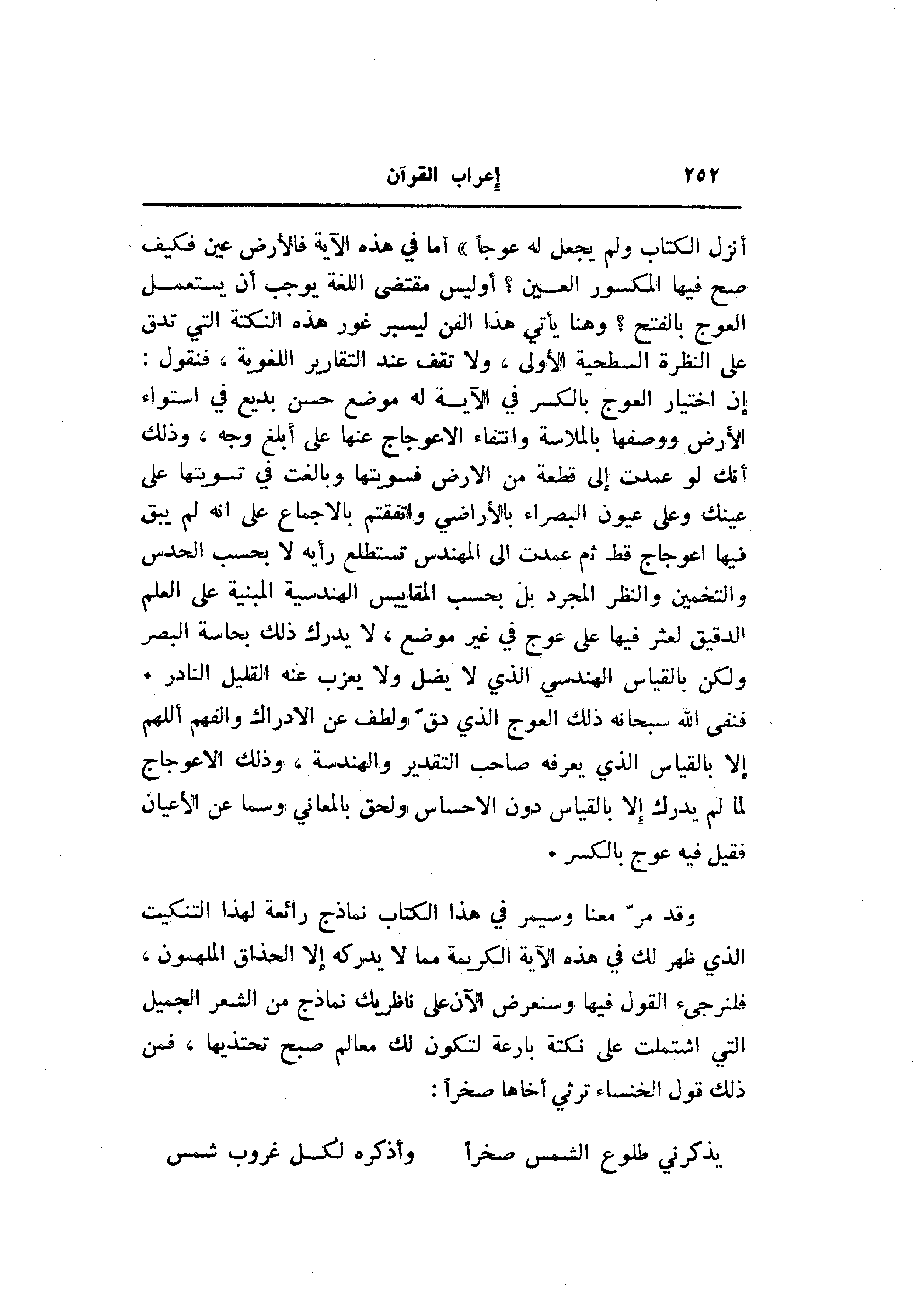 إن اختيار العوج بالكسر في الآية له موضع حسن بديع في استواء الأرض ووصفها بالملاسة وانتفاء الاعوجاج عنها على أبلغ وجه، وذلك أنك لو عمدت إلى قطعة من الأرض فسويتها وبالغت في تسويتها على عينك وعلى عيون البصراء بالأراضي واتفقتم بالإجماع على انه لم يبق فيها اعوجاج قط ثم عمدت الى المهندس تستطلع رأيه لا بحسب الحدس والتخمين والنظر المجرد بل بحسب المقاييس الهندسية المبنية على العلم الدقيق لعثر فيها على عوج في غير موضع، لا يدرك ذلك بحاسة البصر ولكن بالقياس الهندسي الذي لا يضل ولا يعزب عنه القليل النادر.
