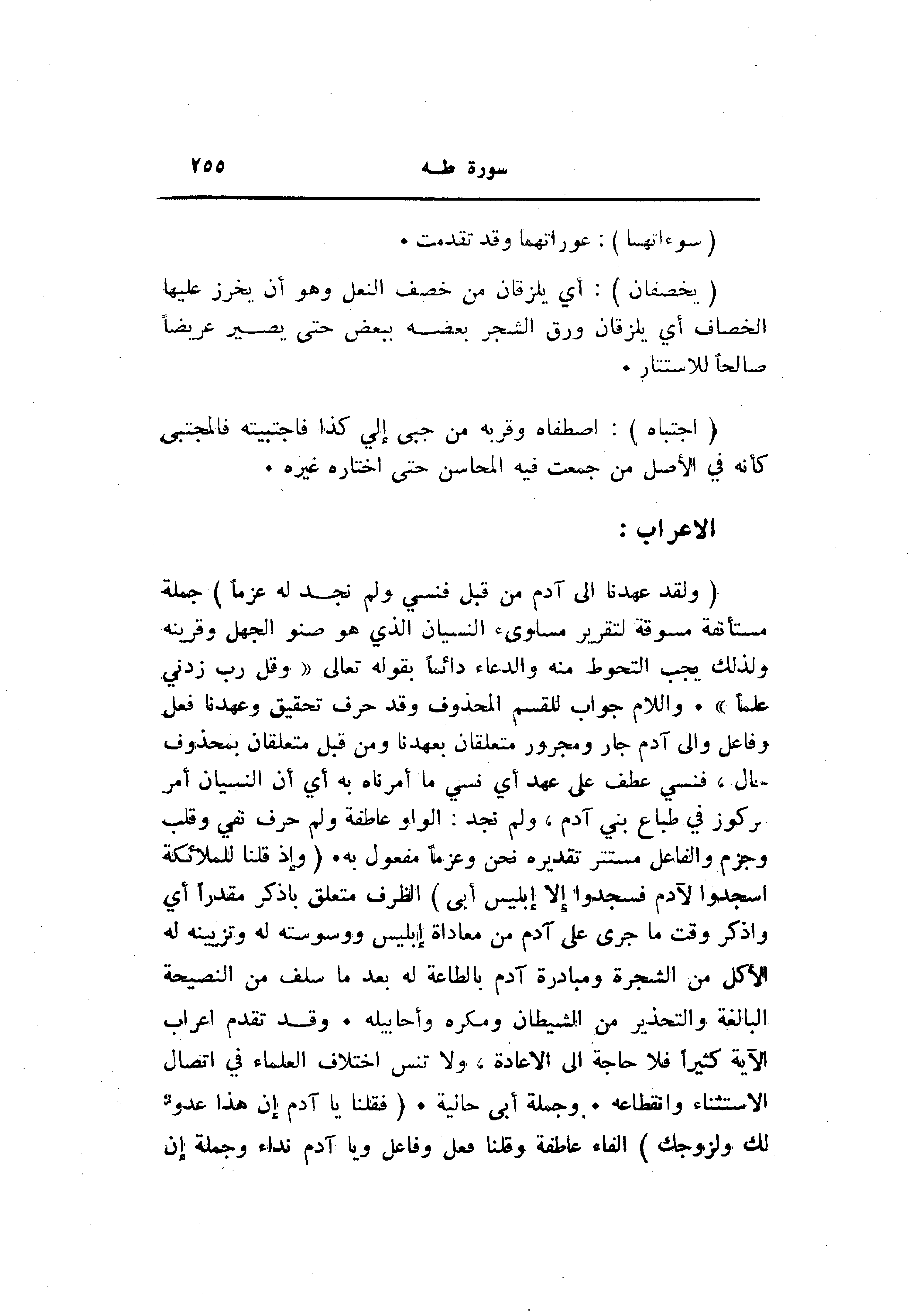 (وَلَقَدْ عَهِدْنا إِلى آدَمَ مِنْ قَبْلُ فَنَسِيَ وَلَمْ نَجِدْ لَهُ عَزْماً) جملة مستأنفة مسوقة لتقرير مساوئ النسيان الذي هو صنو الجهل وقرينه ولذلك يجب التحوط منه والدعاء دائما بقوله تعالى «وَقُلْ رَبِّ زِدْنِي عِلْماً» . واللام جواب للقسم المحذوف وقد حرف تحقيق وعهدنا فعل وفاعل والى آدم جار ومجرور متعلقان بعهدنا ومن قبل متعلقان بمحذوف حال، فنسي عطف على عهد أي نسي ما أمرناه به أي أن النسيان أمر مركوز في طباع بني آدم، ولم نجد: الواو عاطفة ولم حرف نفي وقلب وجزم والفاعل مستتر تقديره نحن وعزما مفعول به. (وَإِذْ قُلْنا لِلْمَلائِكَةِ اسْجُدُوا لِآدَمَ فَسَجَدُوا إِلَّا إِبْلِيسَ أَبى) الظرف متعلق باذكر مقدرا أي واذكر وقت ما جرى على آدم من معاداة إبليس ووسوسته له وتزيينه له الأكل من الشجرة ومبادرة آدم بالطاعة له بعد ما سلف من النصيحة البالغة والتحذير من الشيطان ومكره وأحابيله. وقد تقدم اعراب الآية كثيرا فلا حاجة الى الاعادة، ولا تنس اختلاف العلماء في اتصال الاستثناء وانقطاعه. وجملة أبى حالية. (فَقُلْنا يا آدَمُ إِنَّ هذا عَدُوٌّ لَكَ وَلِزَوْجِكَ) الفاء عاطفة وقلنا فعل وفاعل ويا آدم نداء وجملة إن