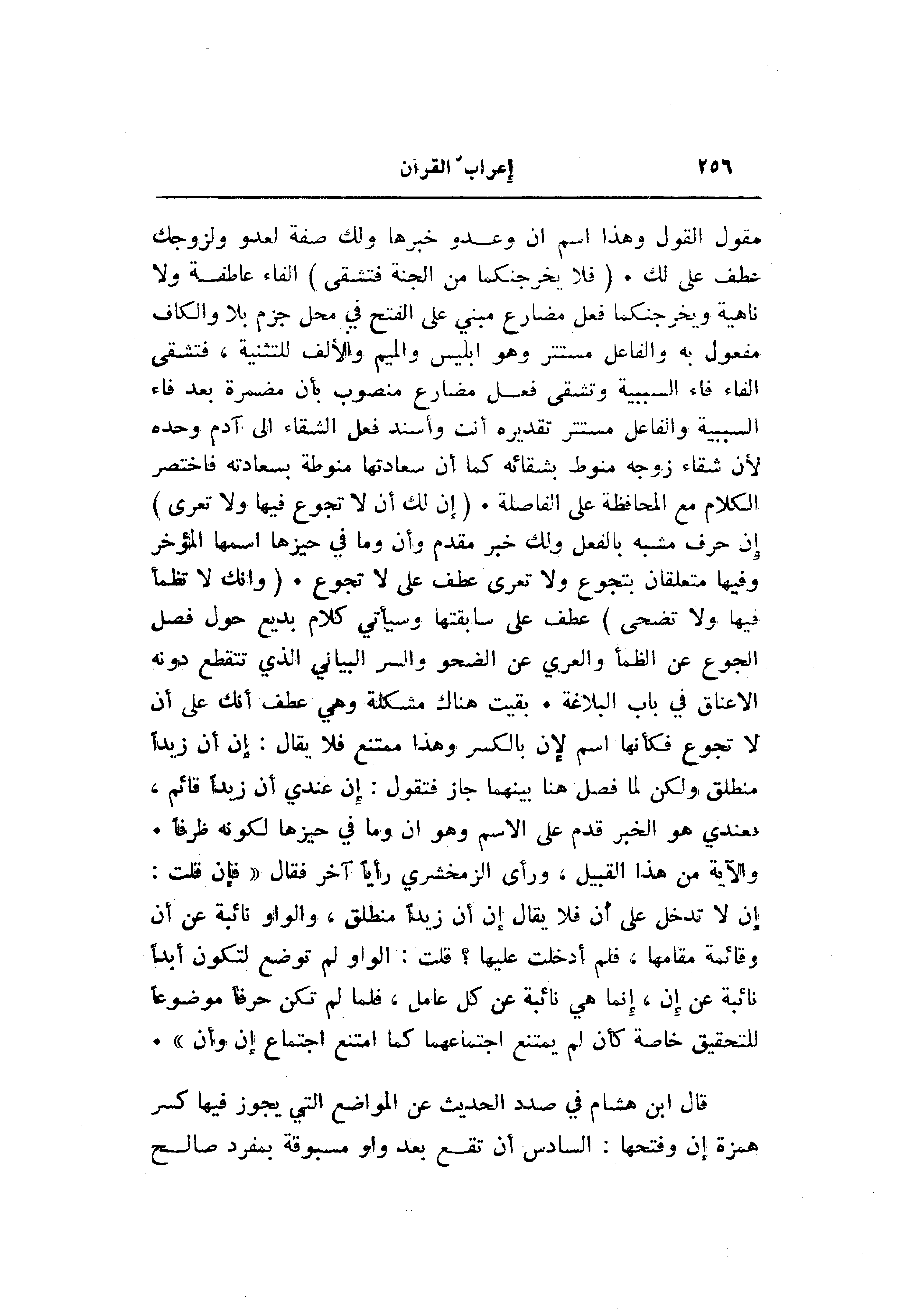مقول القول وهذا اسم ان وعدو خبرها ولك صفة لعدو ولزوجك عطف على لك. (فَلا يُخْرِجَنَّكُما مِنَ الْجَنَّةِ فَتَشْقى) الفاء عاطفة ولا ناهية ويخرجنكما فعل مضارع مبني على الفتح في محل جزم بلا والكاف مفعول به والفاعل مستتر وهو إبليس والميم والألف للتثنية، فتشقى الفاء فاء السببية وتشقى فعل مضارع منصوب بأن مضمرة بعد فاء السببية والفاعل مستتر تقديره أنت وأسند فعل الشقاء الى آدم وحده لأن شقاء زوجه منوط بشقائه كما أن سعادتها منوطة بسعادته فاختصر الكلام مع المحافظة على الفاصلة. (إِنَّ لَكَ أَلَّا تَجُوعَ فِيها وَلا تَعْرى) إن حرف مشبه بالفعل ولك خبر مقدم وأن وما في حيزها اسمها المؤخر وفيها متعلقان بتجوع ولا تعرى عطف على لا تجوع. (وَأَنَّكَ لا تَظْمَؤُا فِيها وَلا تَضْحى) عطف على سابقتها وسيأتي كلام بديع حول فصل الجوع عن الظمأ والعري عن الضحو والسر البياني الذي تتقطع دونه الأعناق في باب البلاغة. بقيت هناك مشكلة وهي عطف أنك على أن لا تجوع فكأنها اسم لإن بالكسر وهذا ممتنع فلا يقال: إن أن زيدا منطلق ولكن لما فصل هنا بينهما جاز فتقول: إن عندي أن زيدا قائم، فعندي هو الخبر قدم على الاسم وهو ان وما في حيزها لكونه ظرفا.