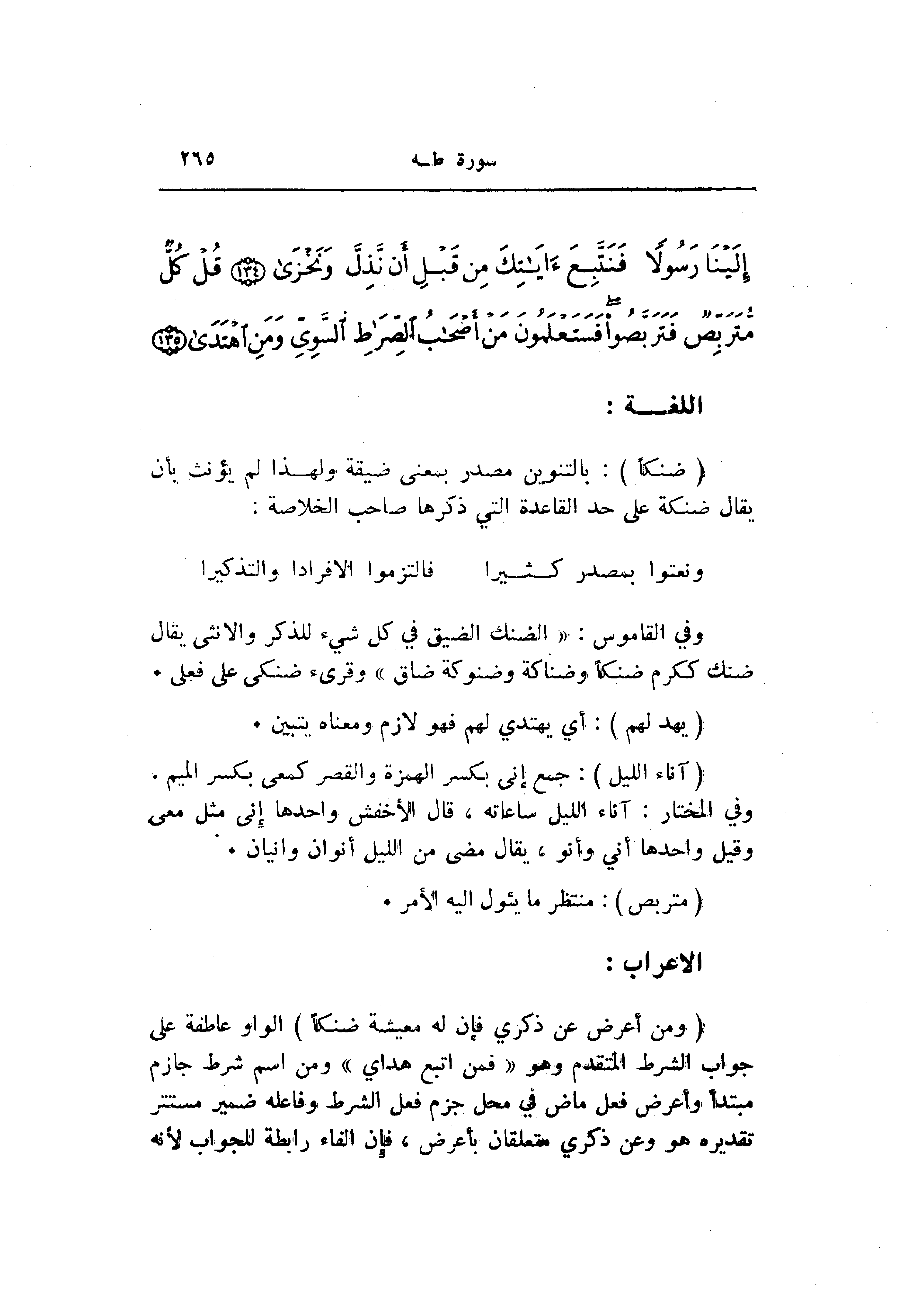 (وَمَنْ أَعْرَضَ عَنْ ذِكْرِي فَإِنَّ لَهُ مَعِيشَةً ضَنْكاً) الواو عاطفة على جواب الشرط المتقدم وهو «فمن اتبع هداي» ومن اسم شرط جازم مبتدأ وأعرض فعل ماض في محل جزم فعل الشرط وفاعله ضمير مستتر تقديره هو وعن ذكري متعلقان بأعرض، فإن الفاء رابطة للجواب لأنه