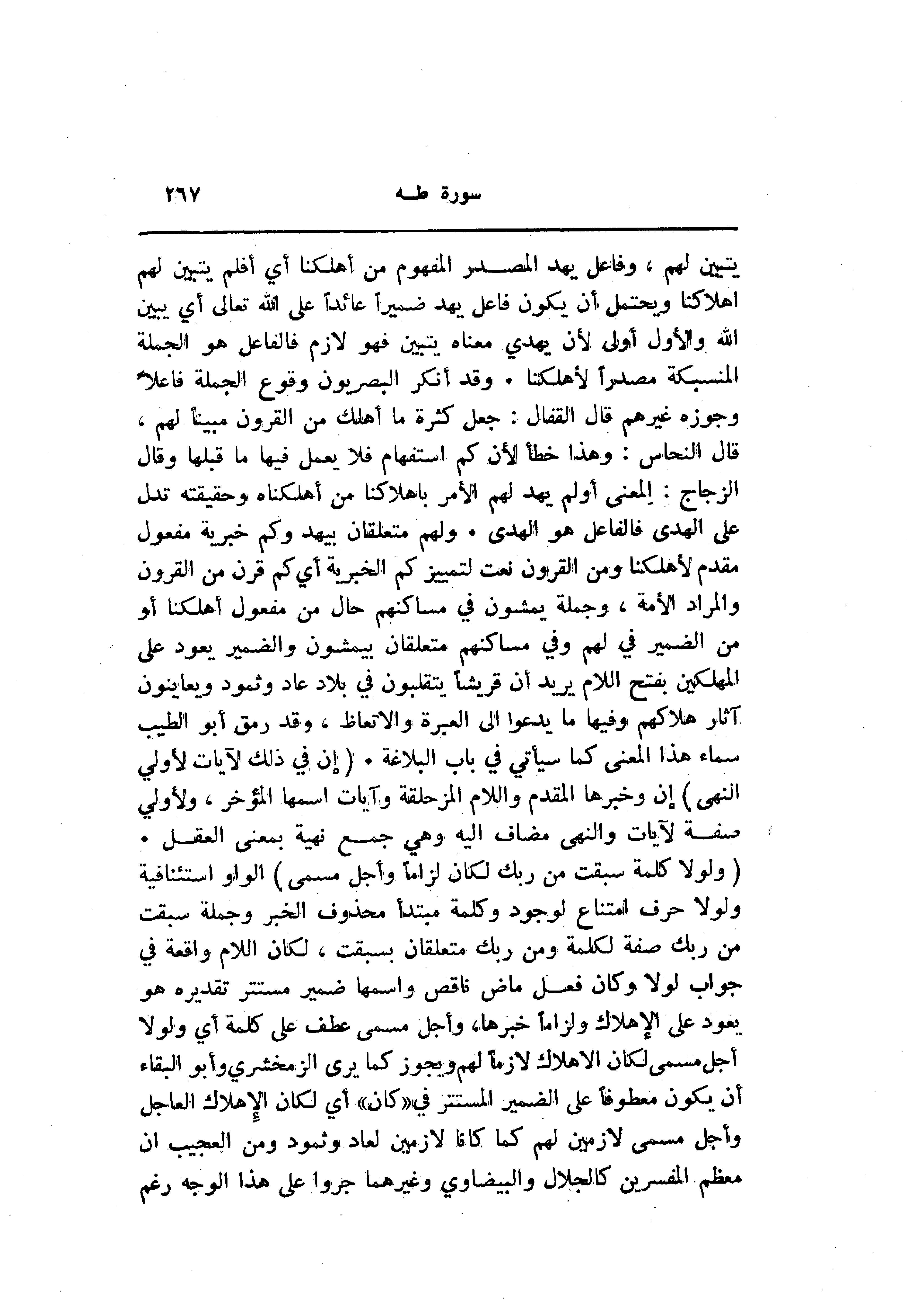 (وَلَوْلا كَلِمَةٌ سَبَقَتْ مِنْ رَبِّكَ لَكانَ لِزاماً وَأَجَلٌ مُسَمًّى) الواو استئنافية ولولا حرف امتناع لوجود وكلمة مبتدأ محذوف الخبر وجملة سبقت من ربك صفة لكلمة ومن ربك متعلقان بسبقت، لكان اللام واقعة في جواب لولا وكان فعل ماض ناقص واسمها ضمير مستتر تقديره هو يعود على الإهلاك ولزاما خبرها، وأجل مسمى عطف على كلمة أي ولولا أجل مسمى لكان الإهلاك لازما لهم ويجوز كما يرى الزمخشري وأبو البقاء أن يكون معطوفا على الضمير المستتر في «كان» أي لكان الإهلاك العاجل وأجل مسمى لازمين لهم كما كانا لازمين لعاد وثمود ومن العجيب ان معظم المفسرين كالجلال والبيضاوي وغيرهما جروا على هذا الوجه رغم