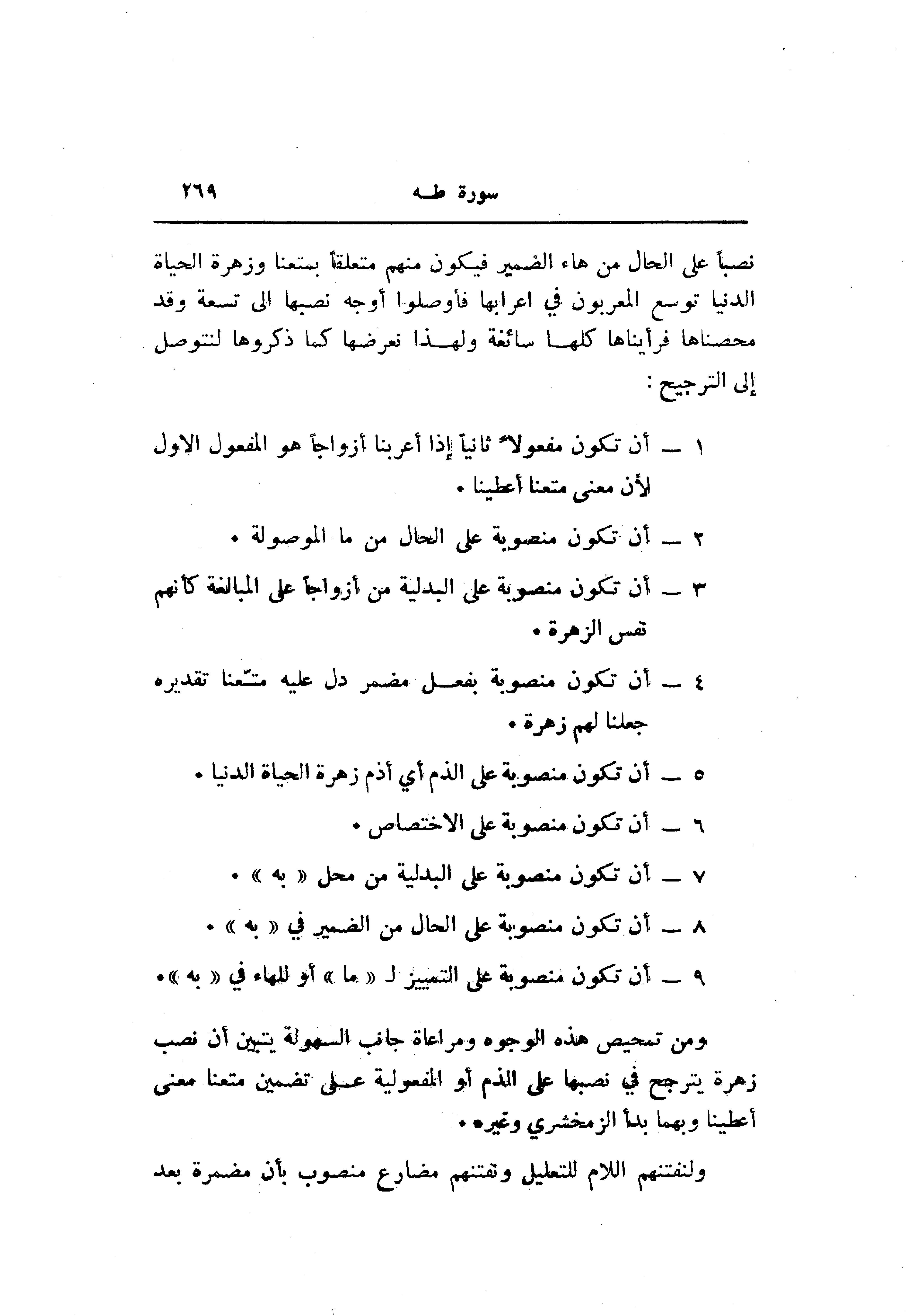 ومن تمحيص هذه الوجوه ومراعاة جانب السهولة يتبين أن نصب زهرة يترجح في نصبها على الذم أو المفعولية على تضمين متعنا معنى أعطينا وبهما بدأ الزمخشري وغيره.